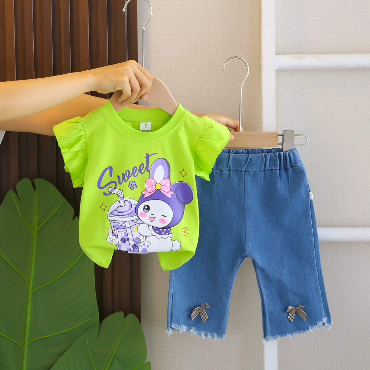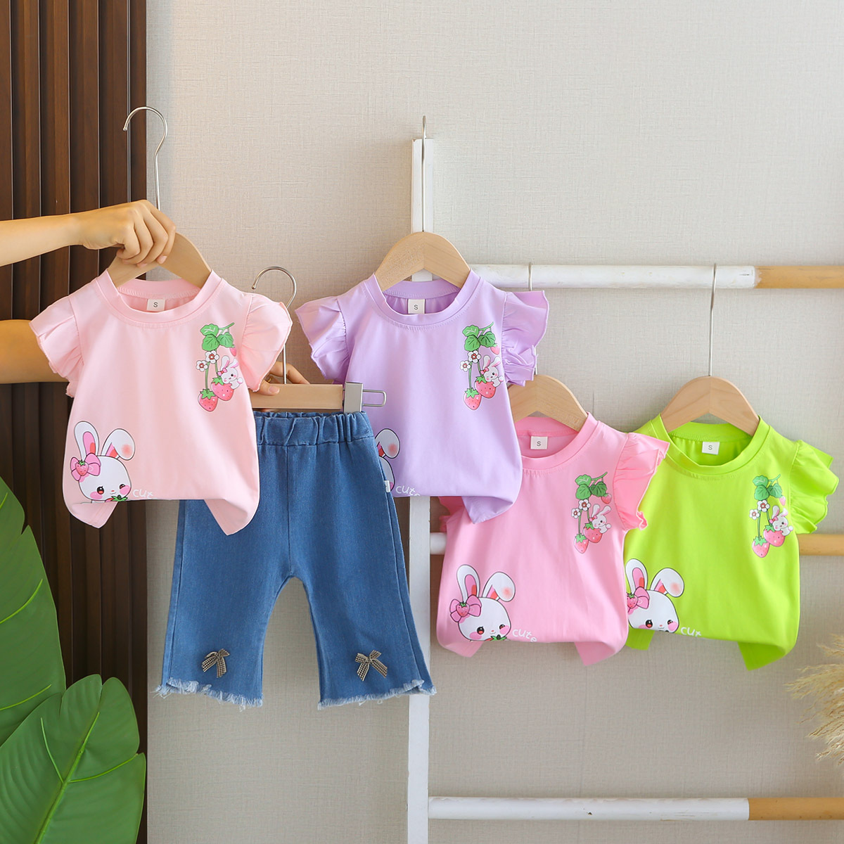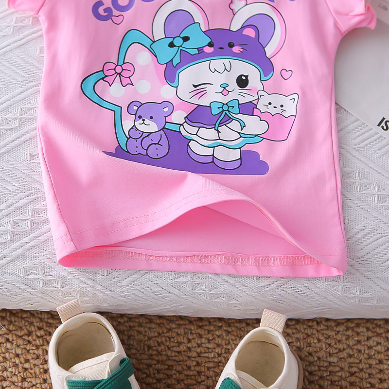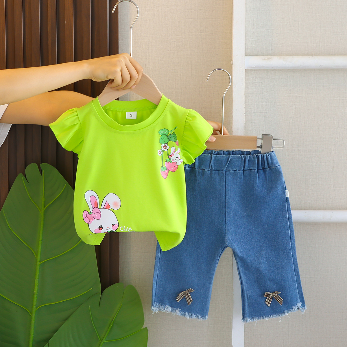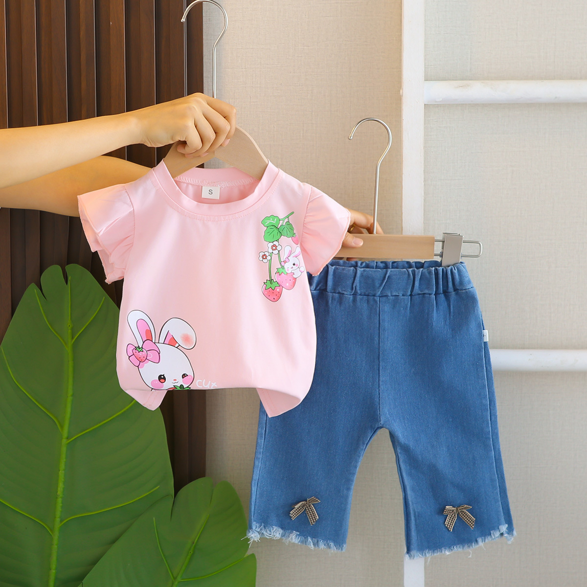 여자 2025 패션 트렌드 새로운 정장 만화 반팔 여름 토끼 정장 어린이 티셔츠 한국 스타일 코튼스토어 가기