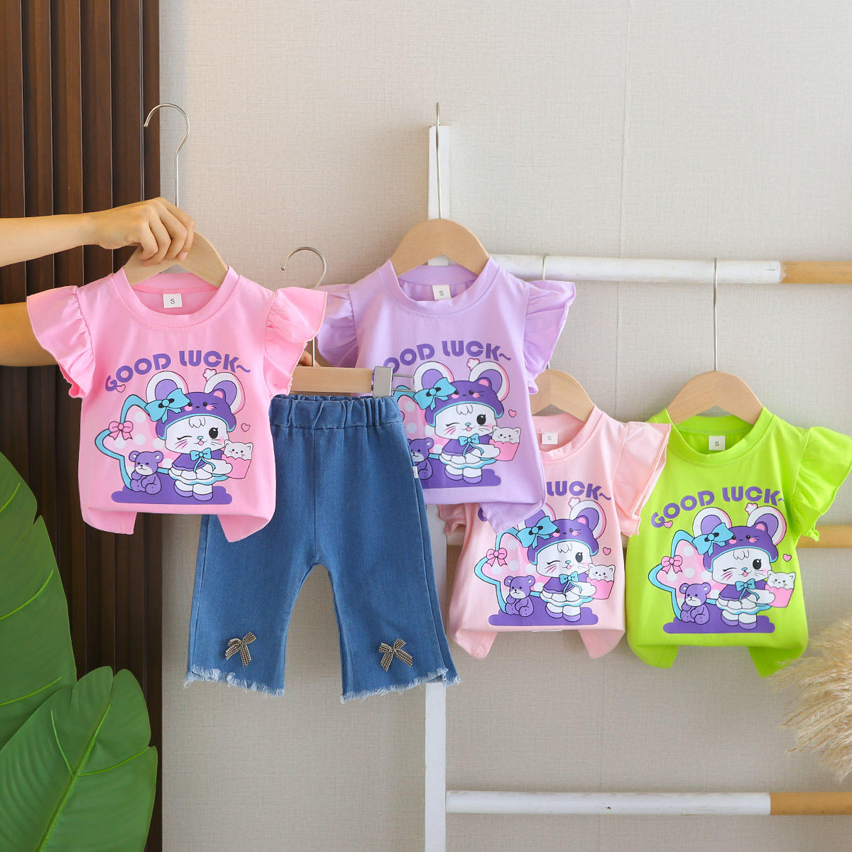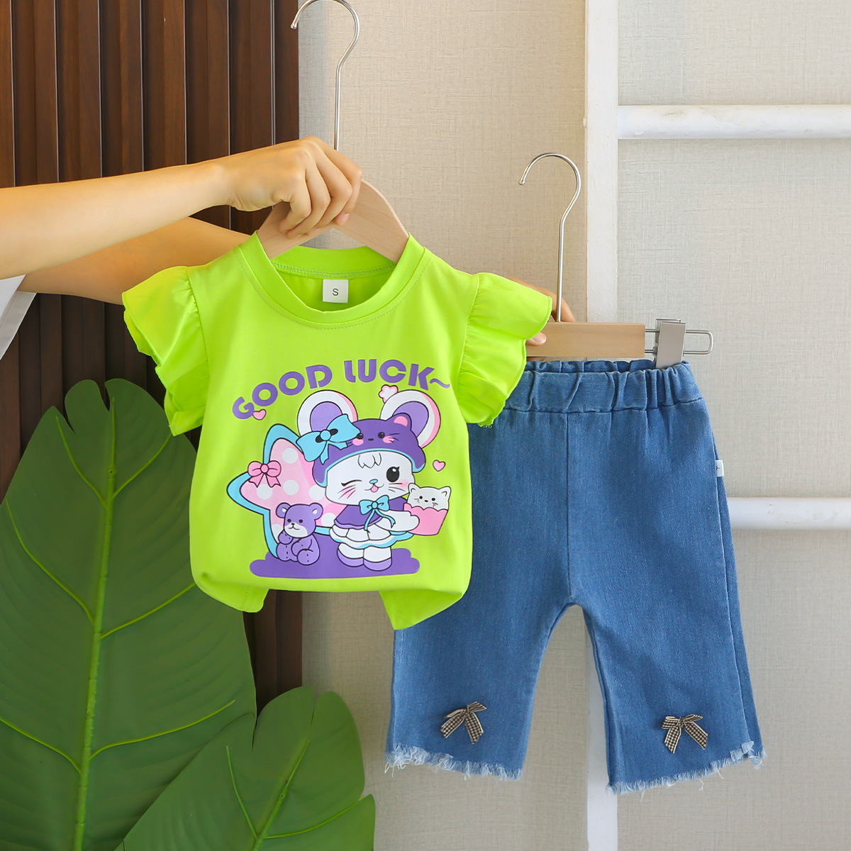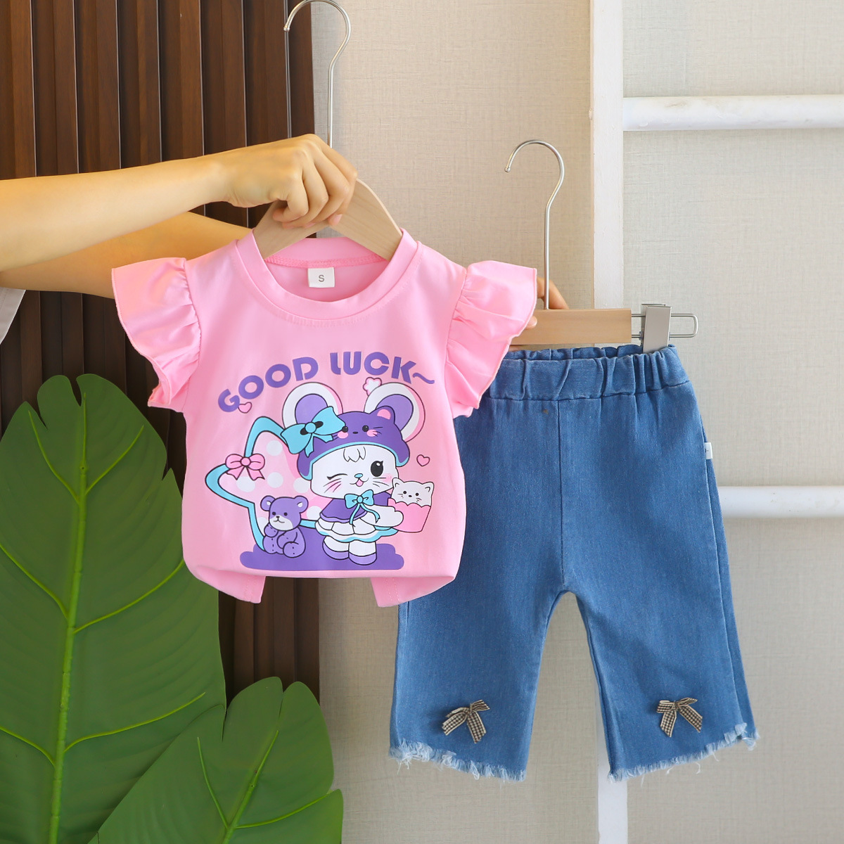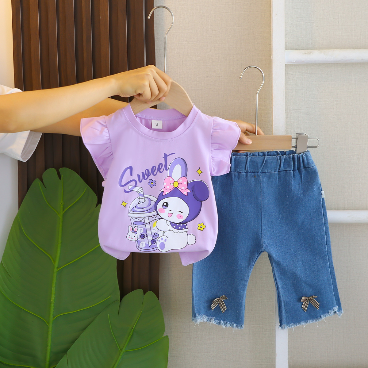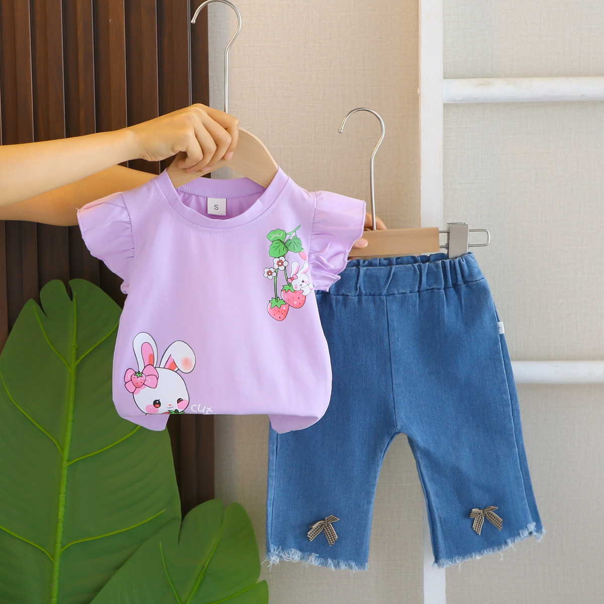 여자 2025 패션 트렌드 새로운 정장 만화 반팔 여름 토끼 정장 어린이 티셔츠 한국 스타일 코튼스토어 가기