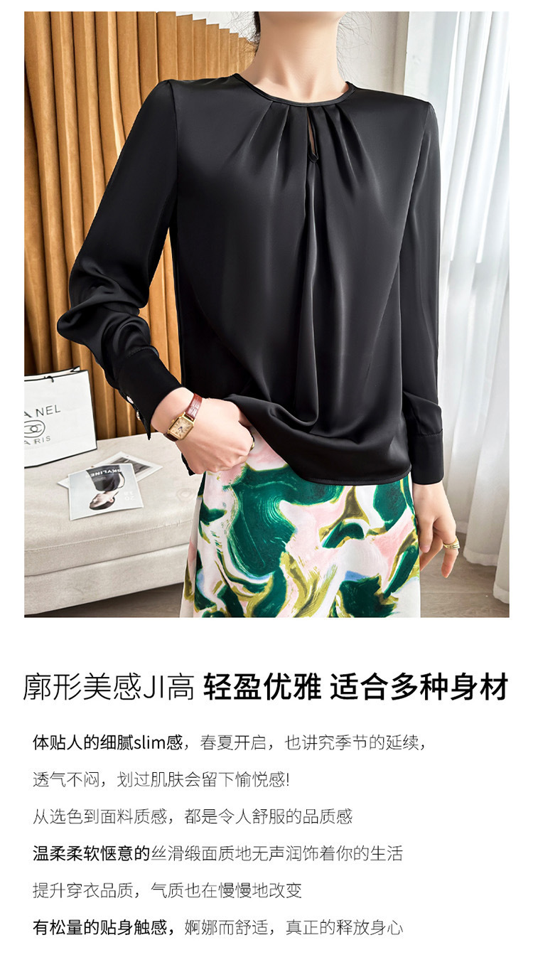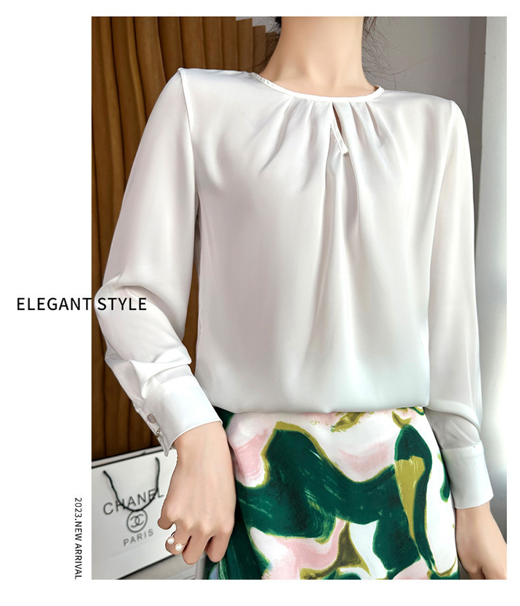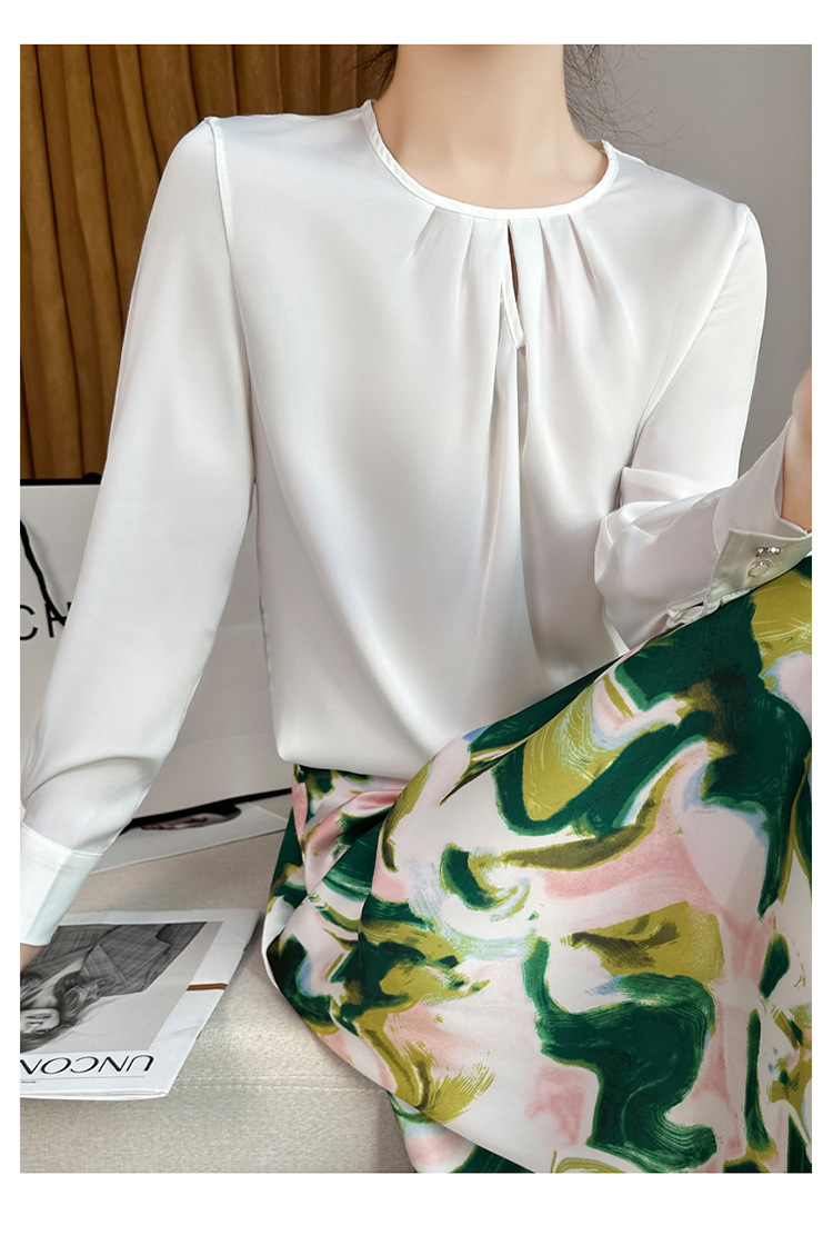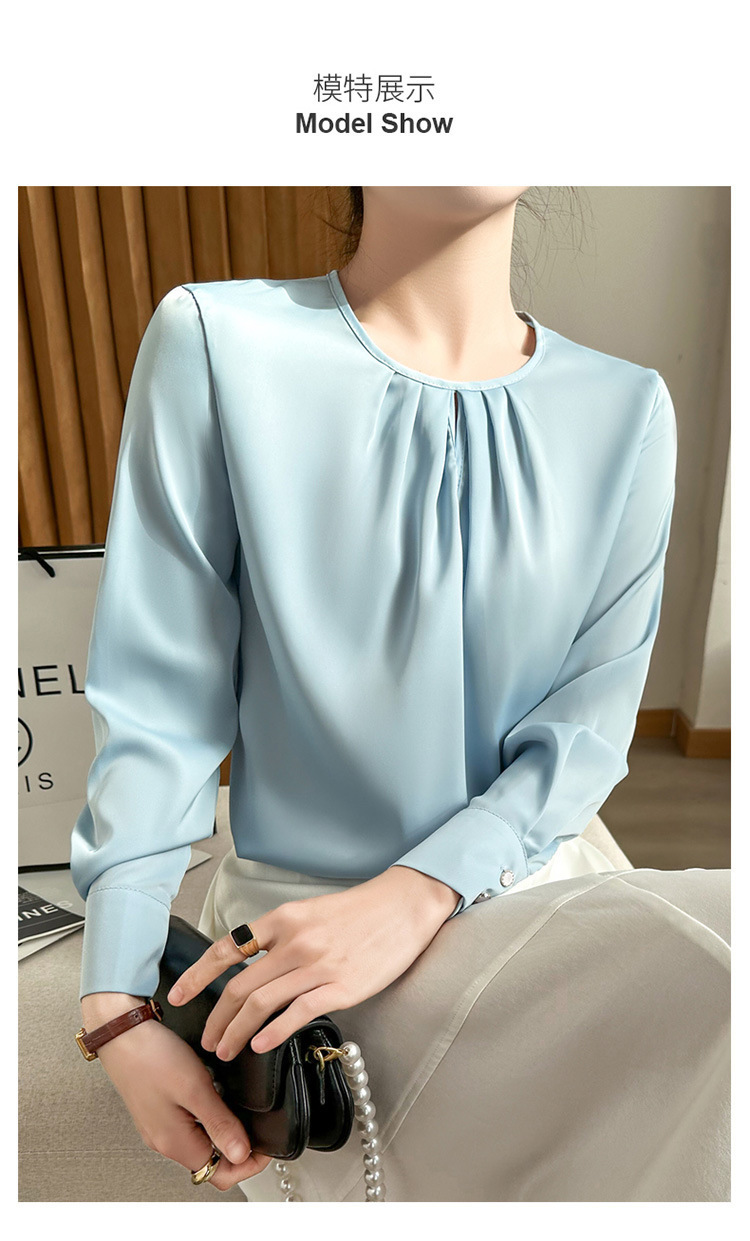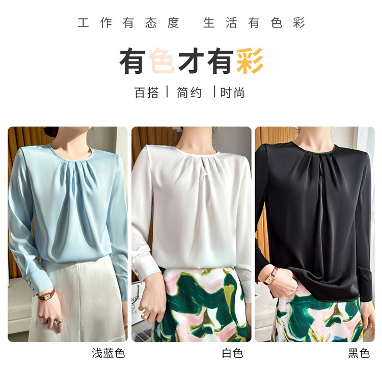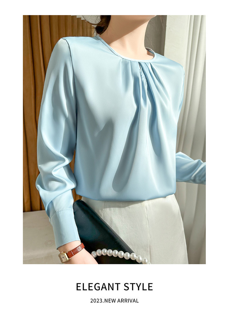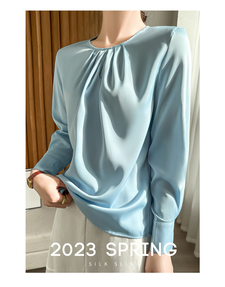 봄 여름 라운드 넥 주름 실크 새틴 셔츠 여성 풀오버 드레이프 캐주얼 셔츠 바닥 셔츠 긴 소매스토어 가기