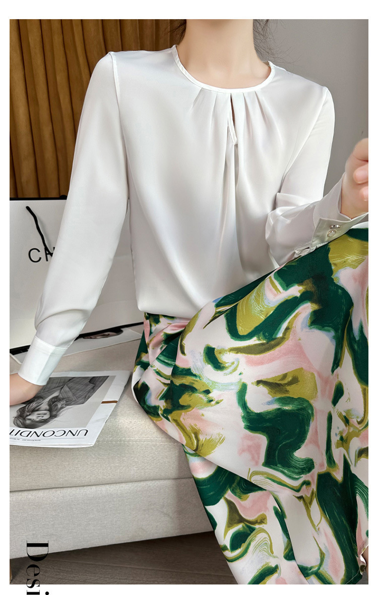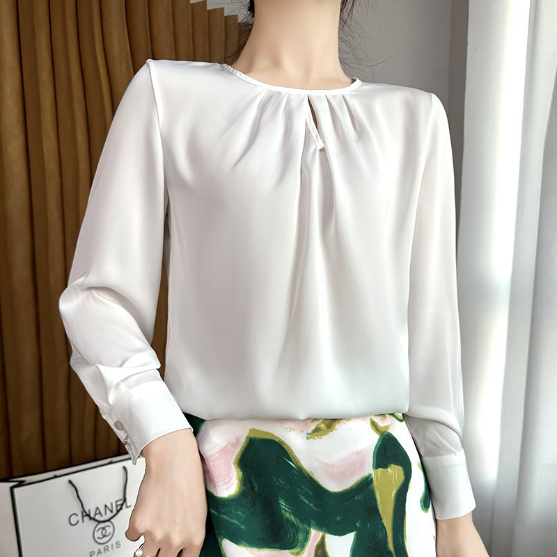 봄 여름 라운드 넥 주름 실크 새틴 셔츠 여성 풀오버 드레이프 캐주얼 셔츠 바닥 셔츠 긴 소매