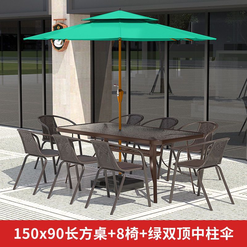 • 150x90 직사각형 테이블 + 의자 8개 + 이중 상단 중앙 기둥 우산