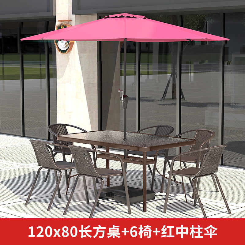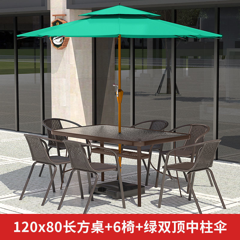 • 120x80 직사각형 테이블 + 의자 6개 + 이중 상단 중앙 기둥 우산