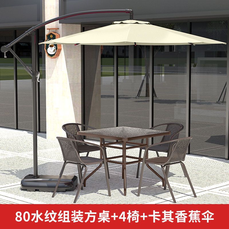 • 80 블랙 조립 사각 테이블 + 의자 4개 + 카키색 바나나 우산
