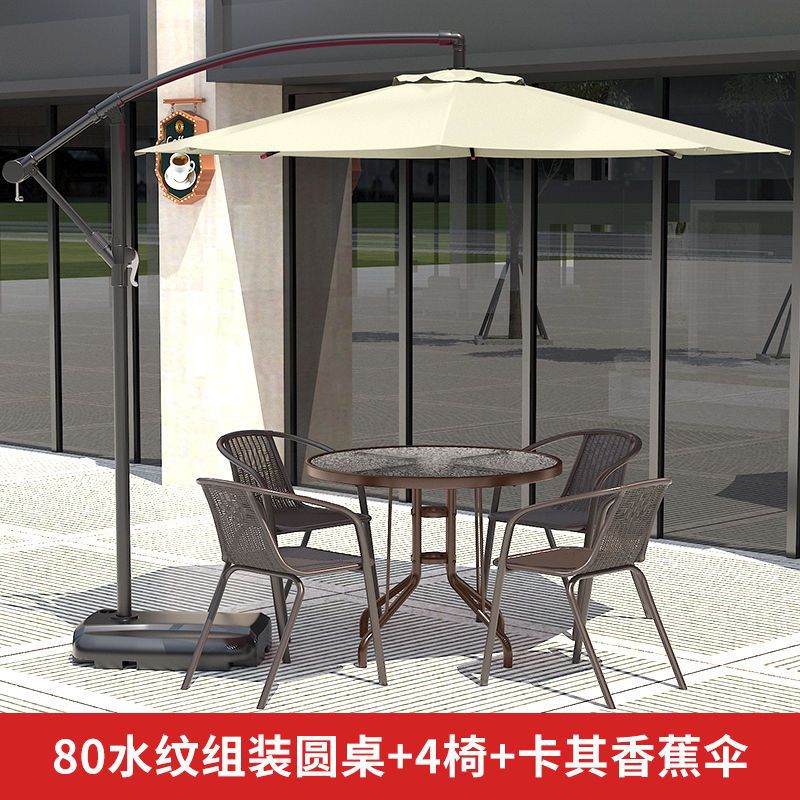 • 80 블랙 조립 원형 테이블 + 의자 4개 + 카키색 바나나 우산