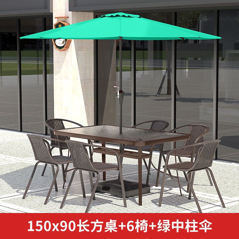 • 150x90 직사각형 테이블 + 의자 6개 + 이중 상단 중앙 기둥 우산