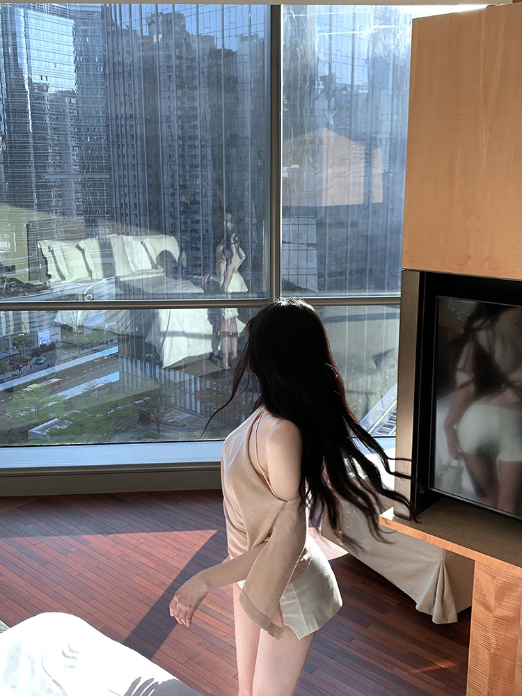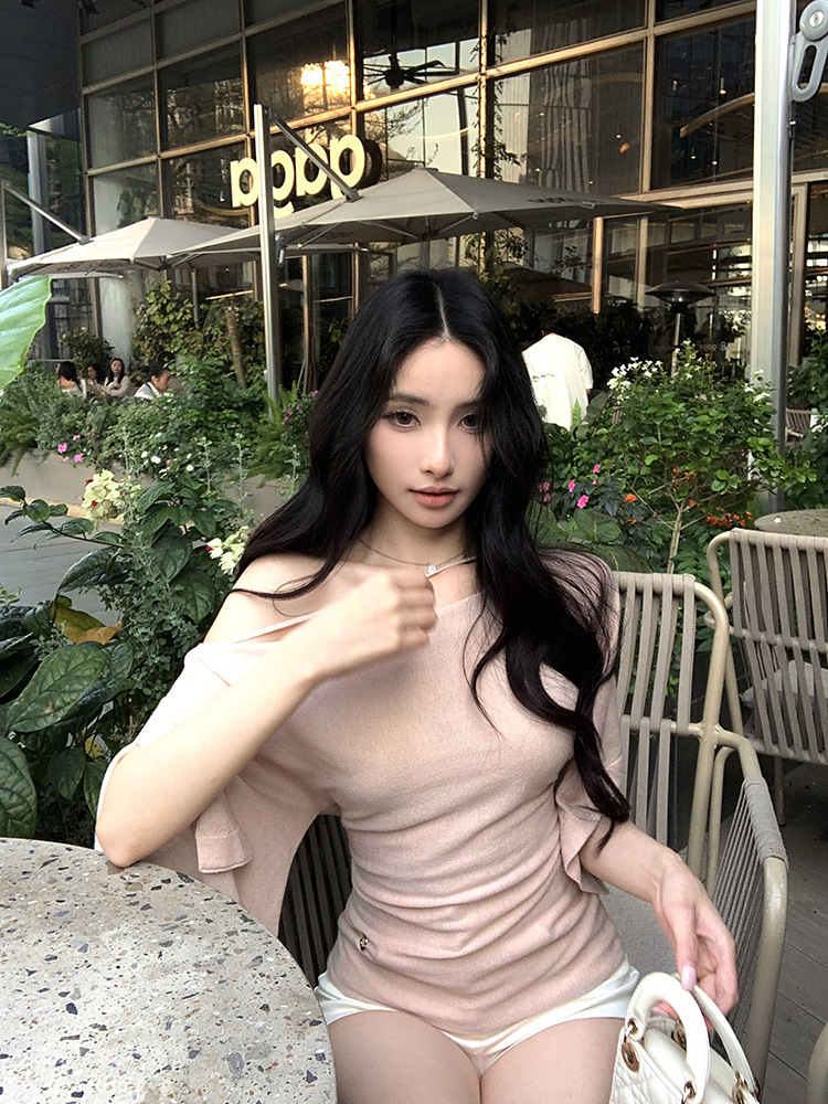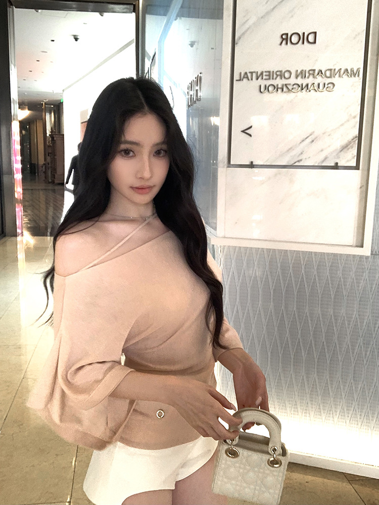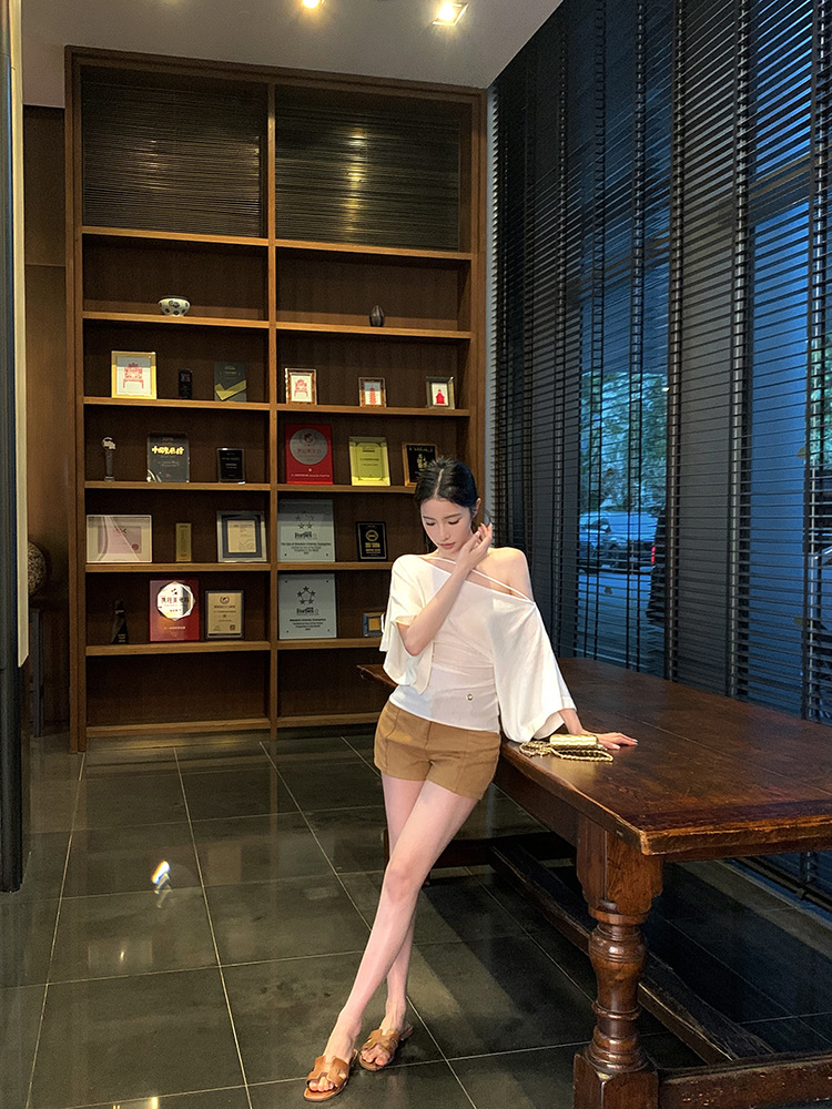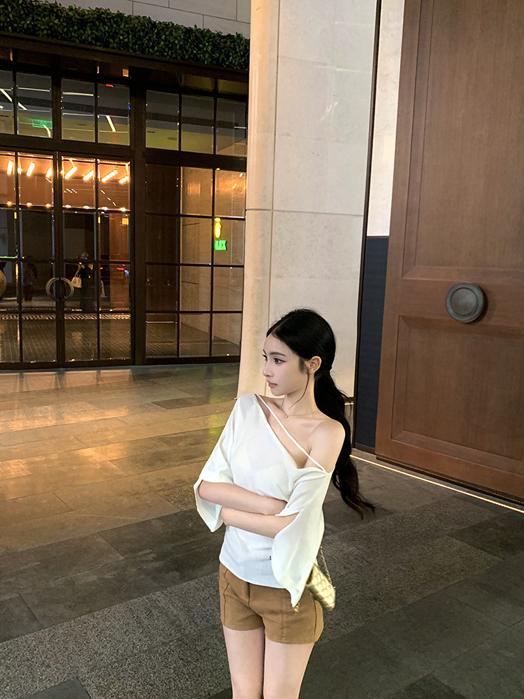 한국 불규칙한 슬로프 숄더 긴팔 티셔츠 여성 여름 5부 소매 슬림 허리 디자인 순수한 섹시 탑
