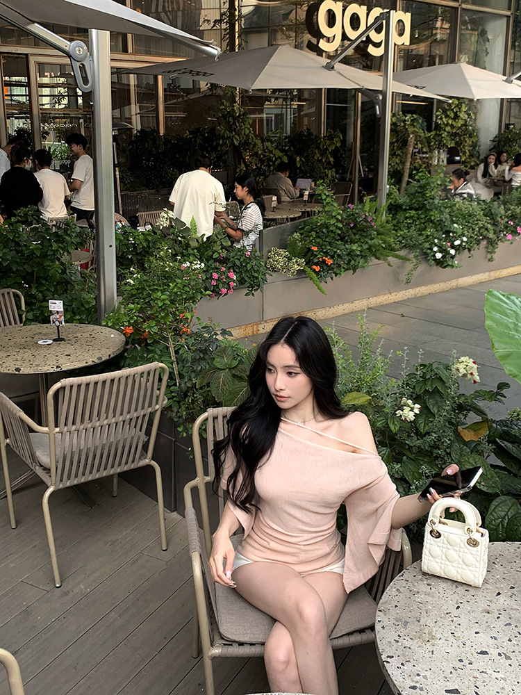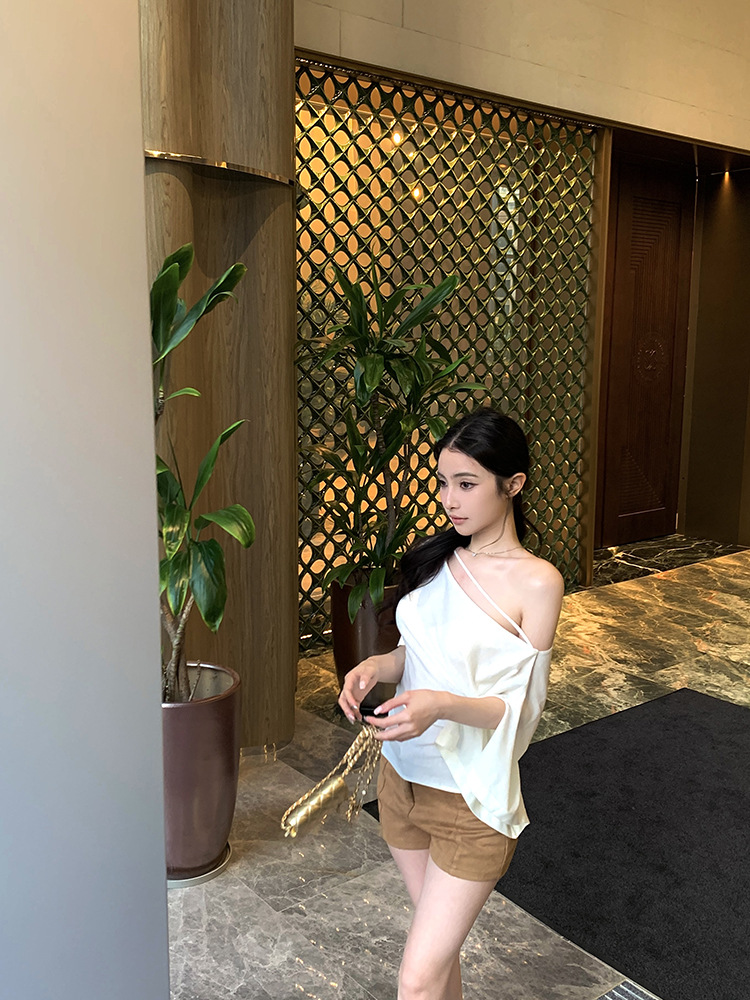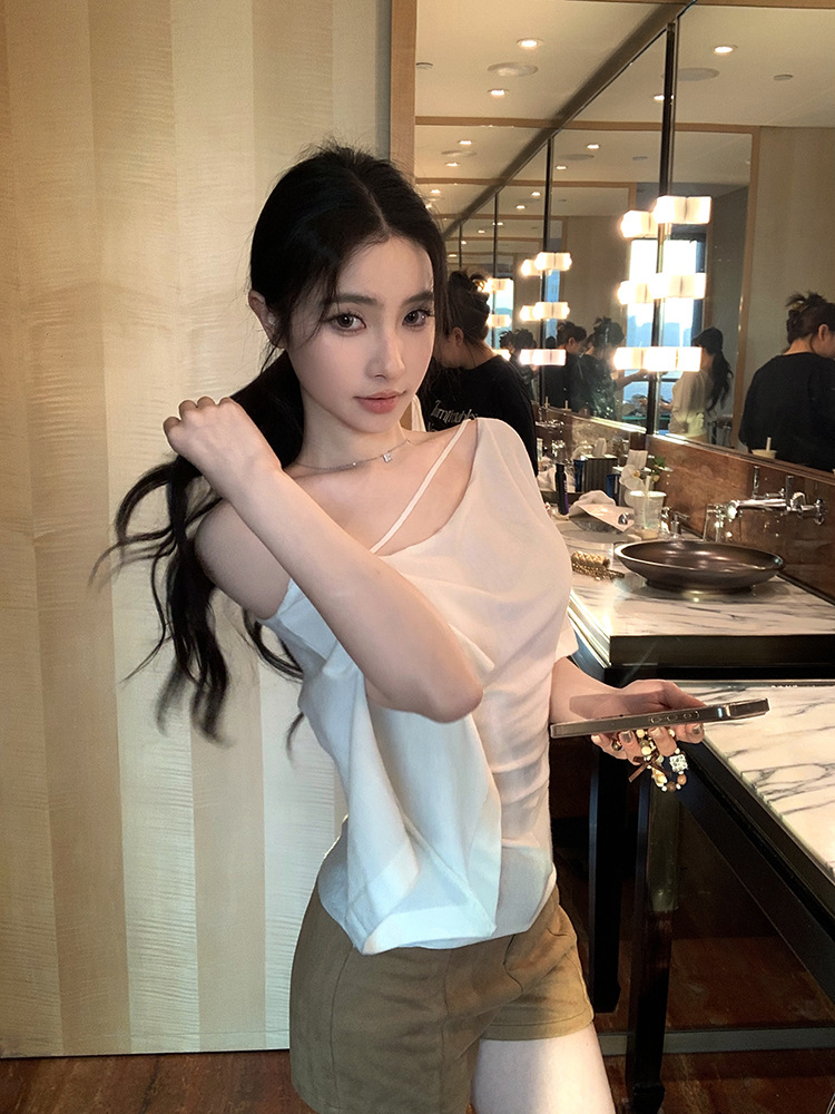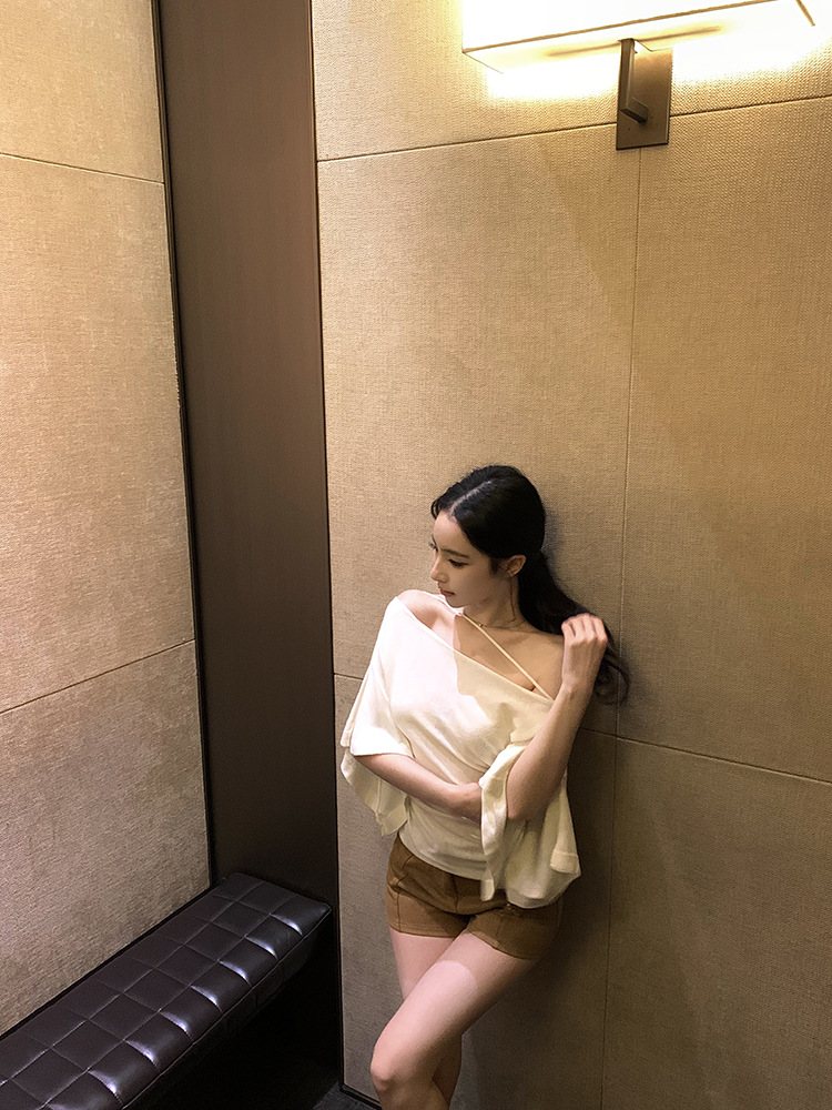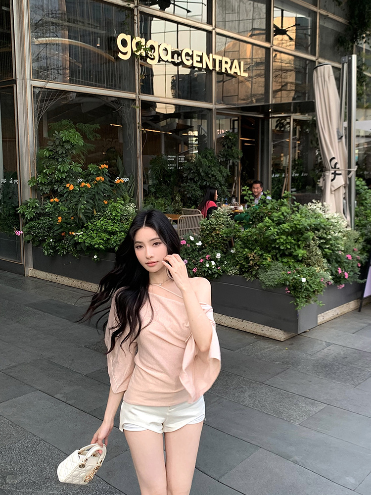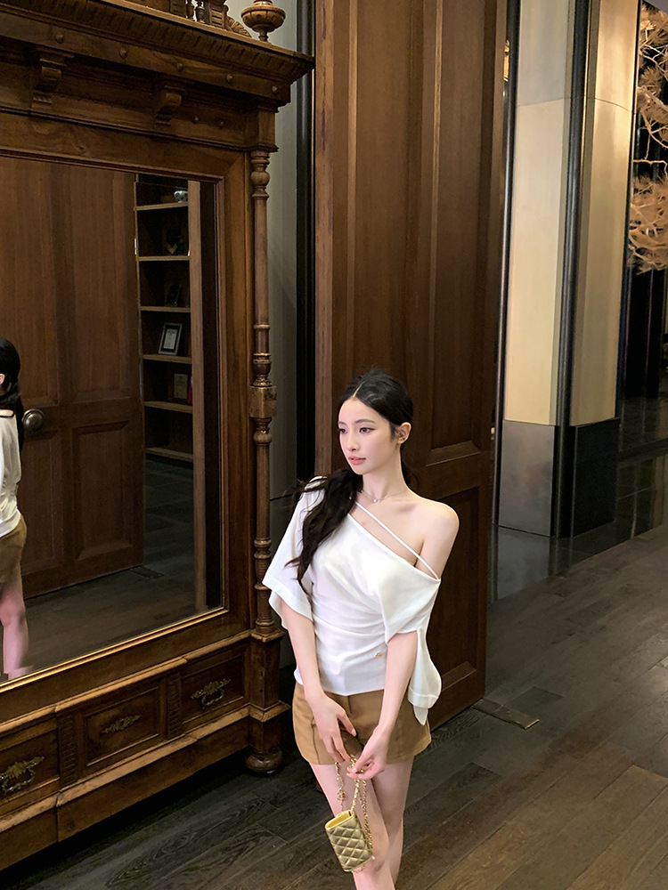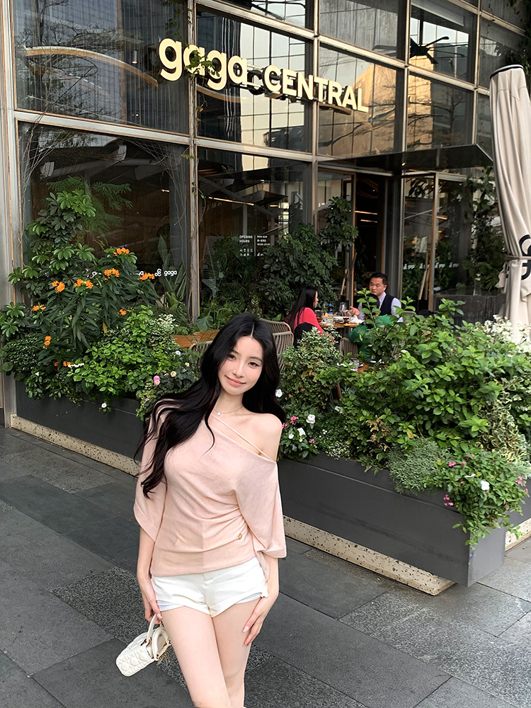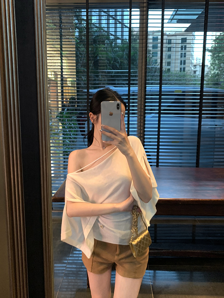 한국 불규칙한 슬로프 숄더 긴팔 티셔츠 여성 여름 5부 소매 슬림 허리 디자인 순수한 섹시 탑스토어 가기