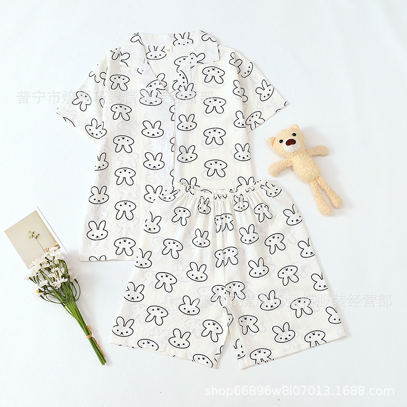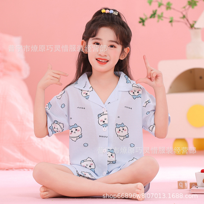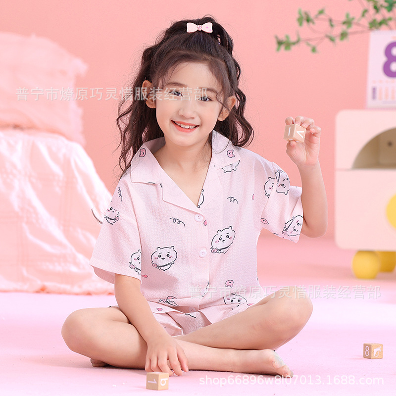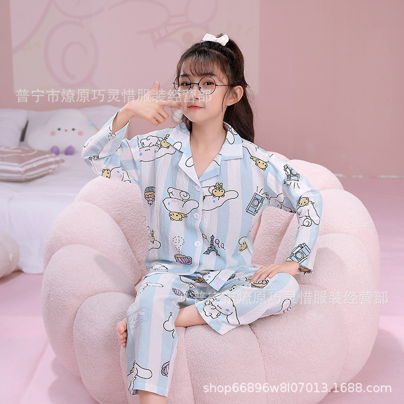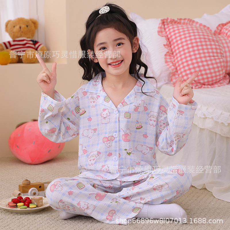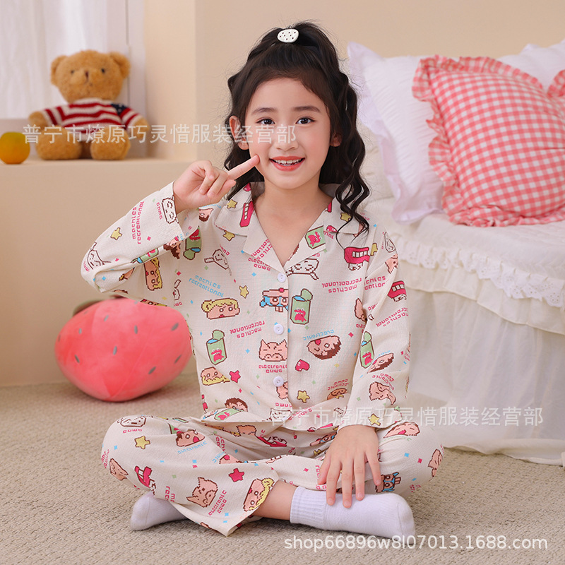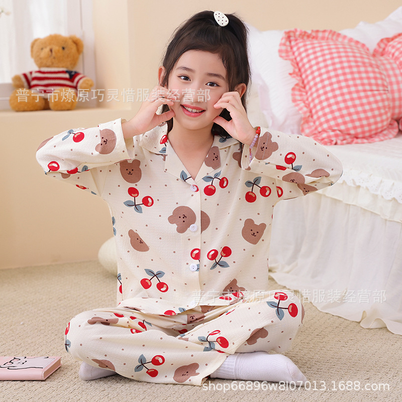 여아 잠옷, 버블 코튼 긴팔 바지, 만화 귀여운 봄 여름 옷깃, 중대형 아동복 세트 외부 착용 가능스토어 가기