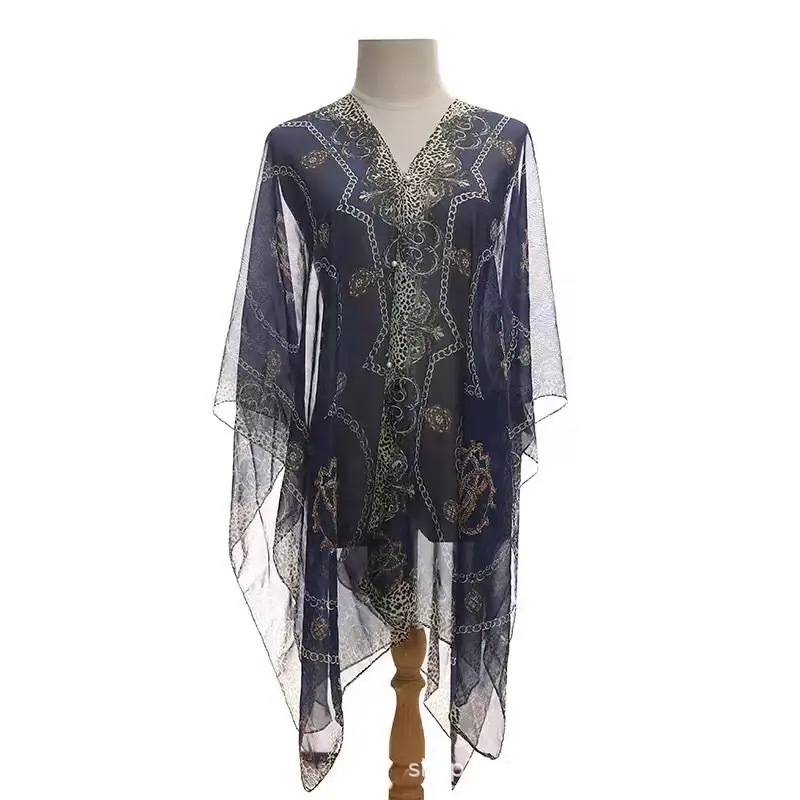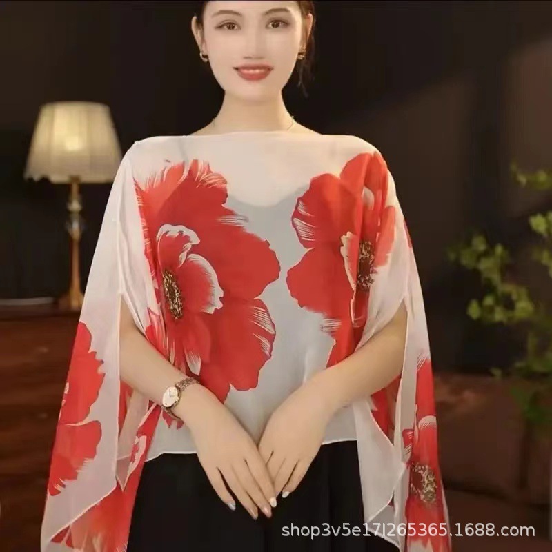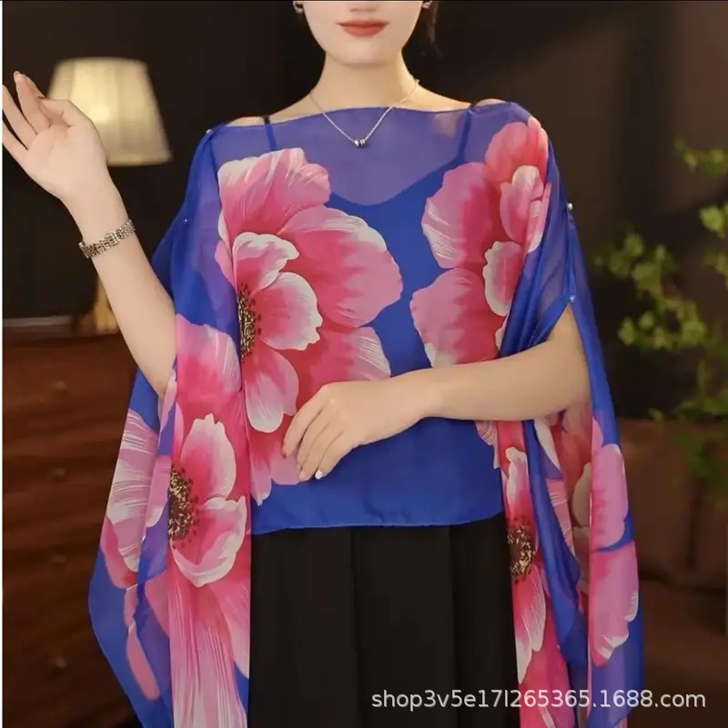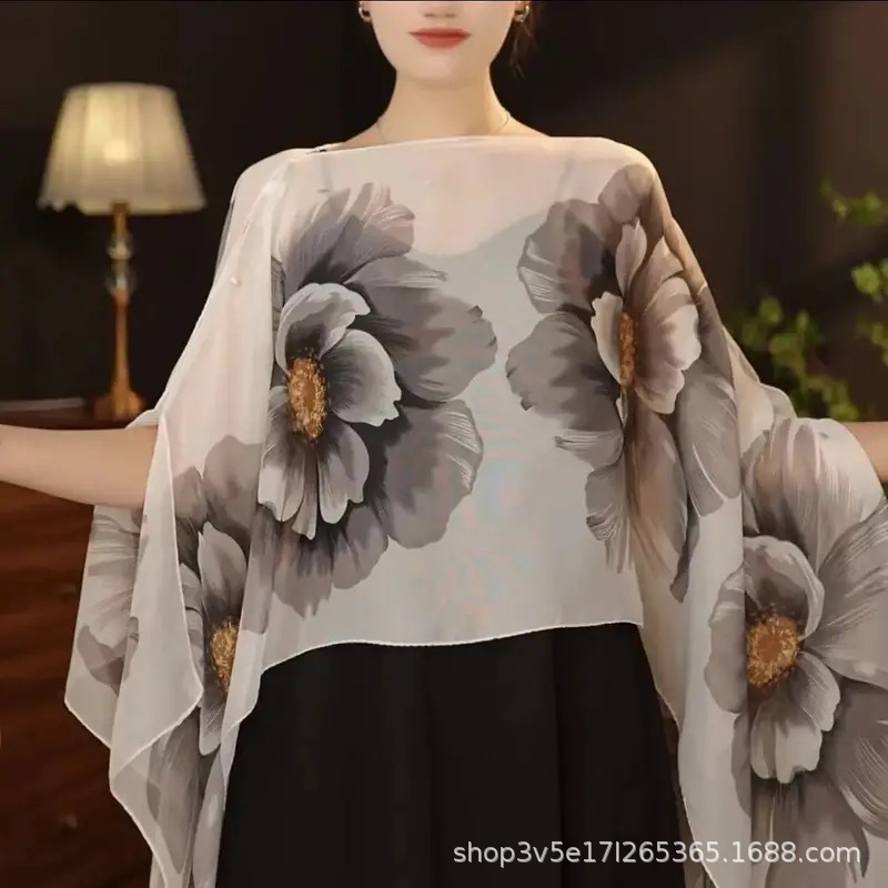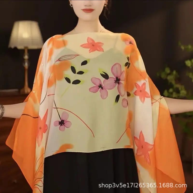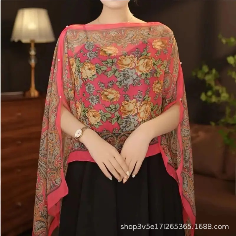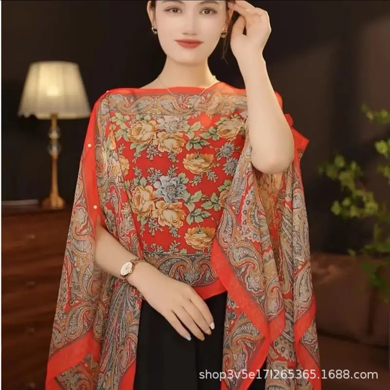 여름 핫 세일 풀오버 실크 스카프 도매 여성 쉬폰 어머니 스타일 스퀘어 댄스 프린트 하이 엔드 외국 스타일 자외선 차단제 목도리스토어 가기