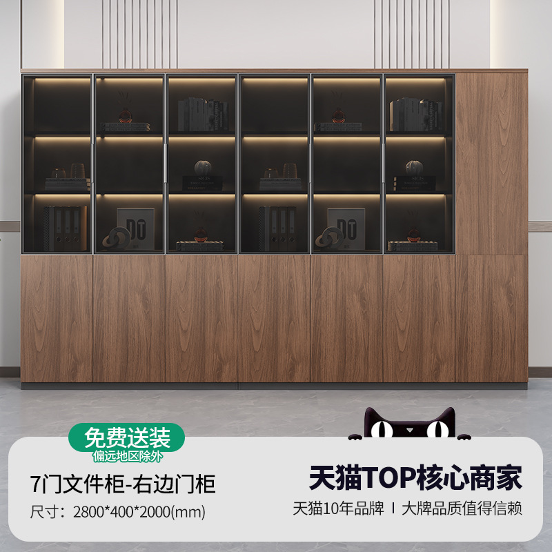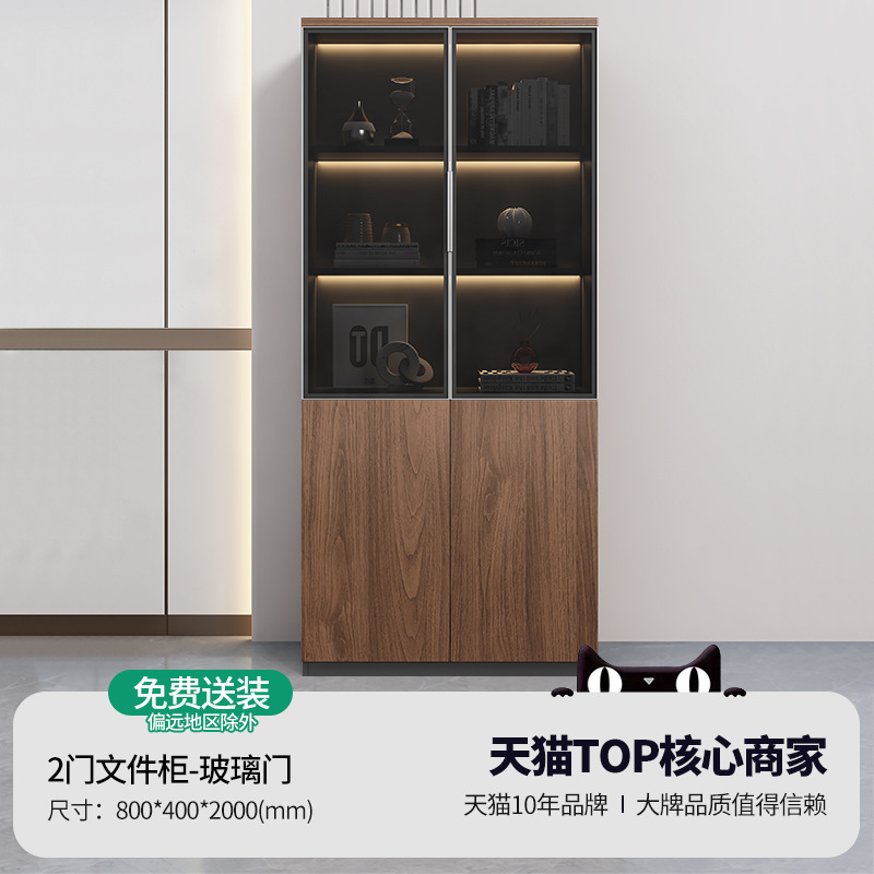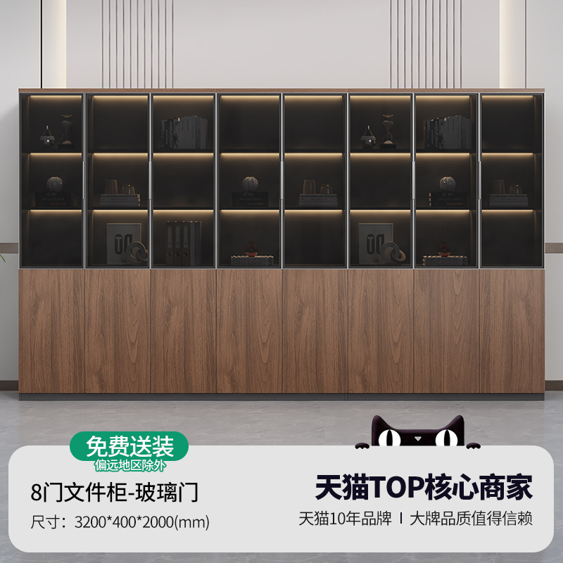 • 8도어 서류 캐비넷 - 유리도어(라이트 스트립 포함) 월넛 + 아이언 그레이