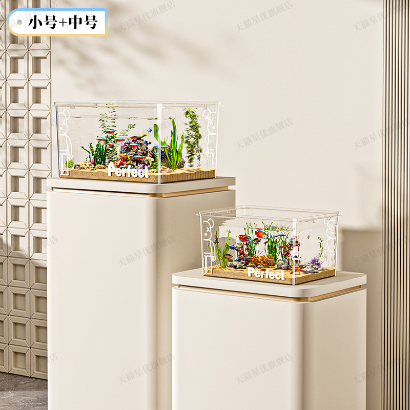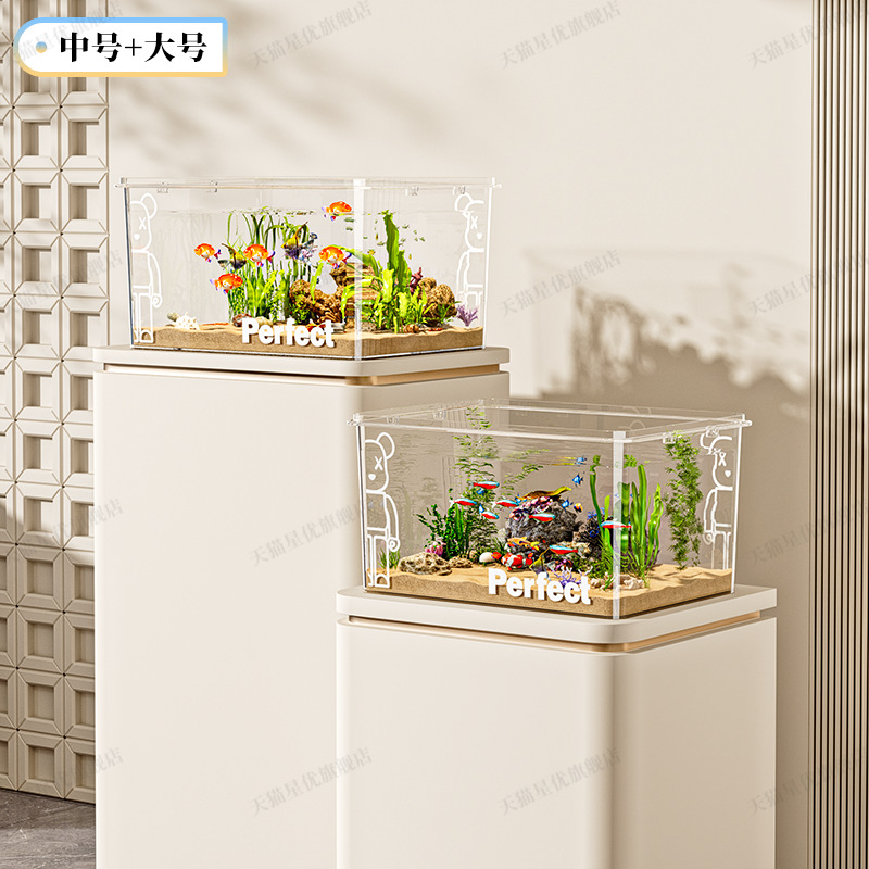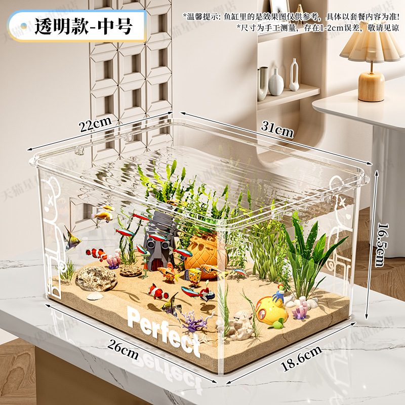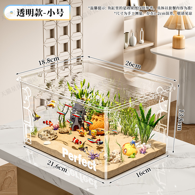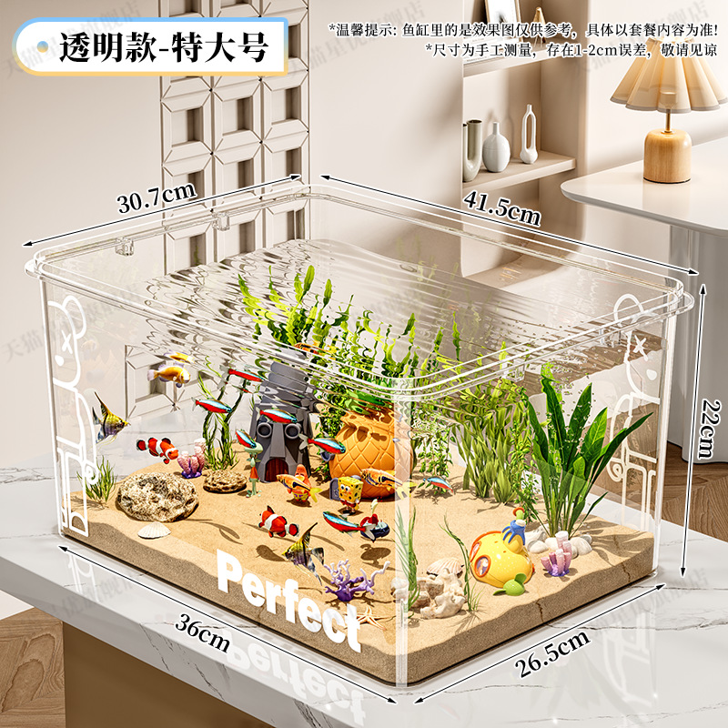 투명한 수조, 소형 가정용 금붕어 수조, 데스크탑 거실 모조 유리 생태 조경 수조, 사각형 두꺼운 거북이 수조