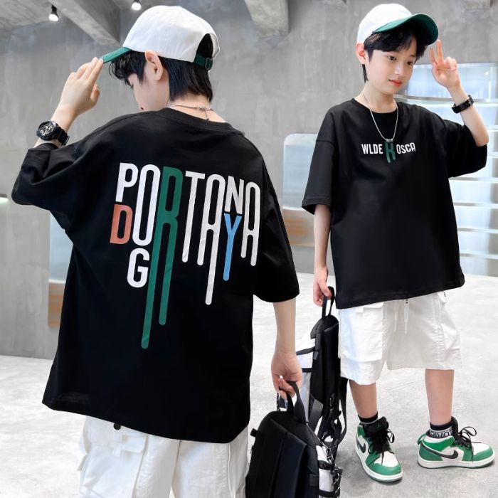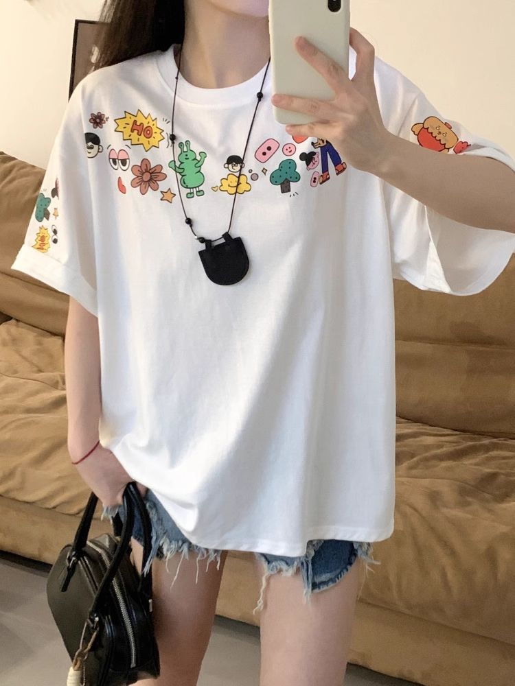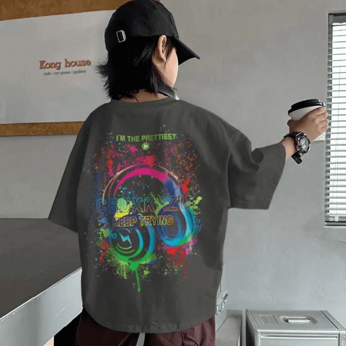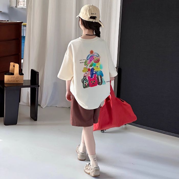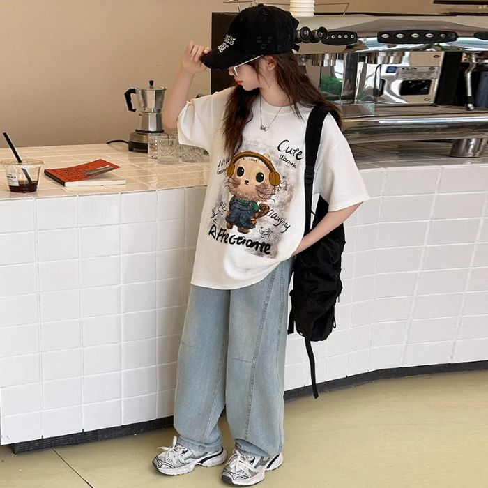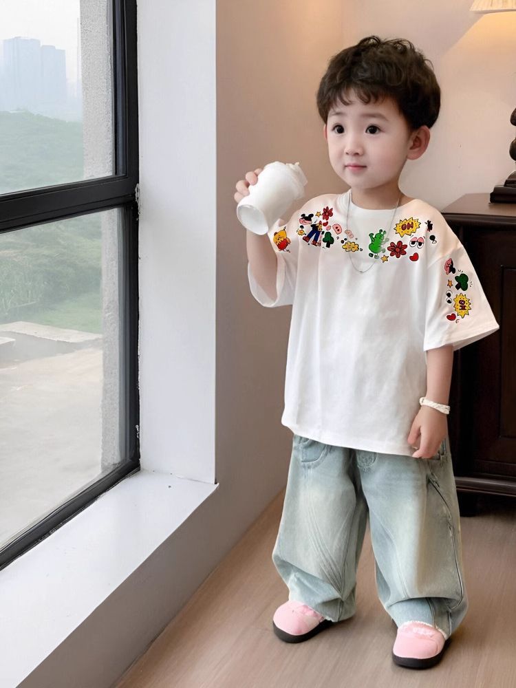 2025 새로운 스타일 소년 순면 반팔 여름 소녀 중대형 어린이 느슨한 라운드 넥 탑 만화 프린트 티셔츠 유행