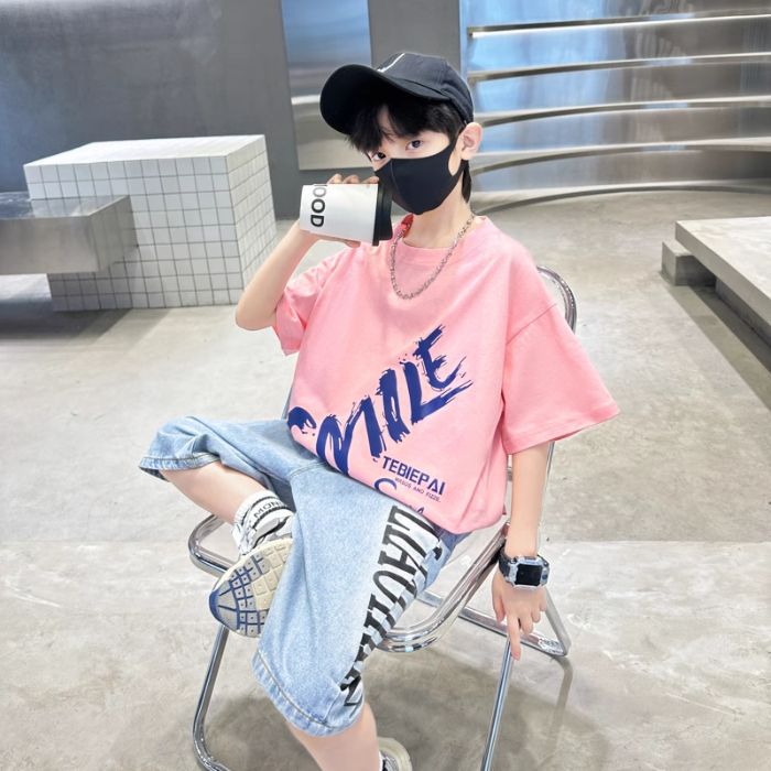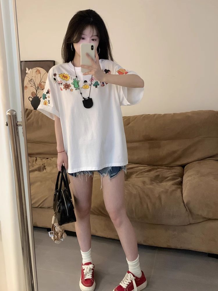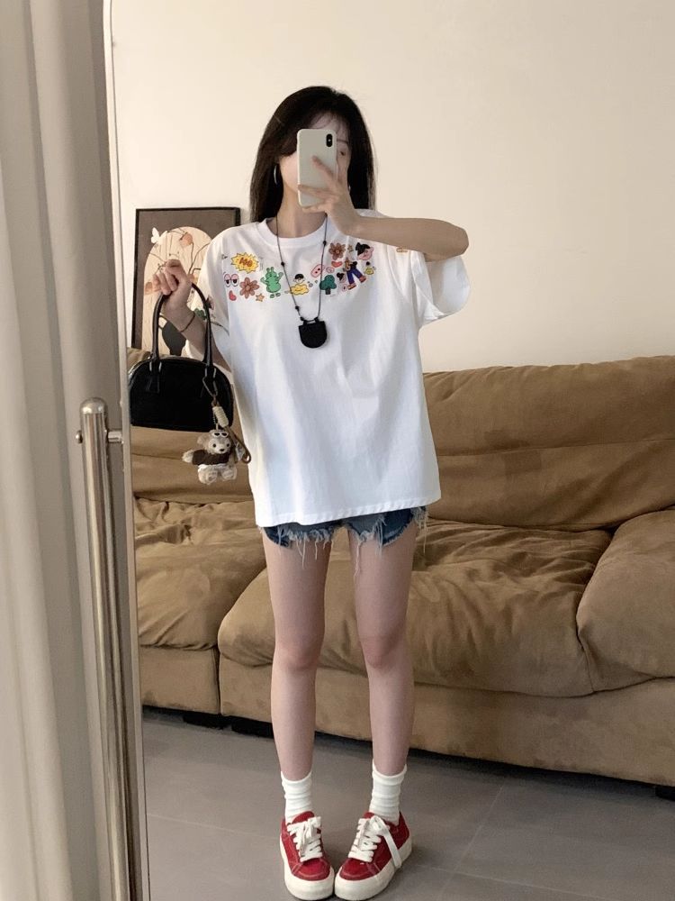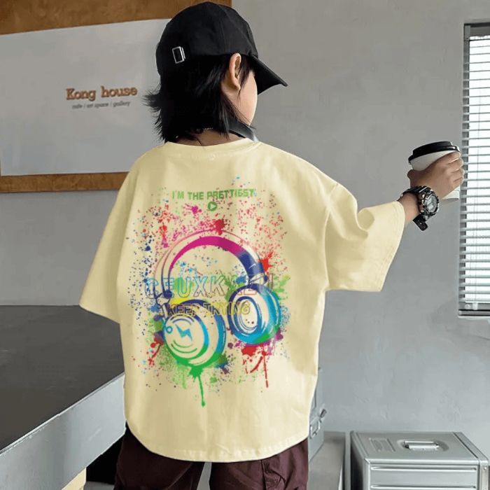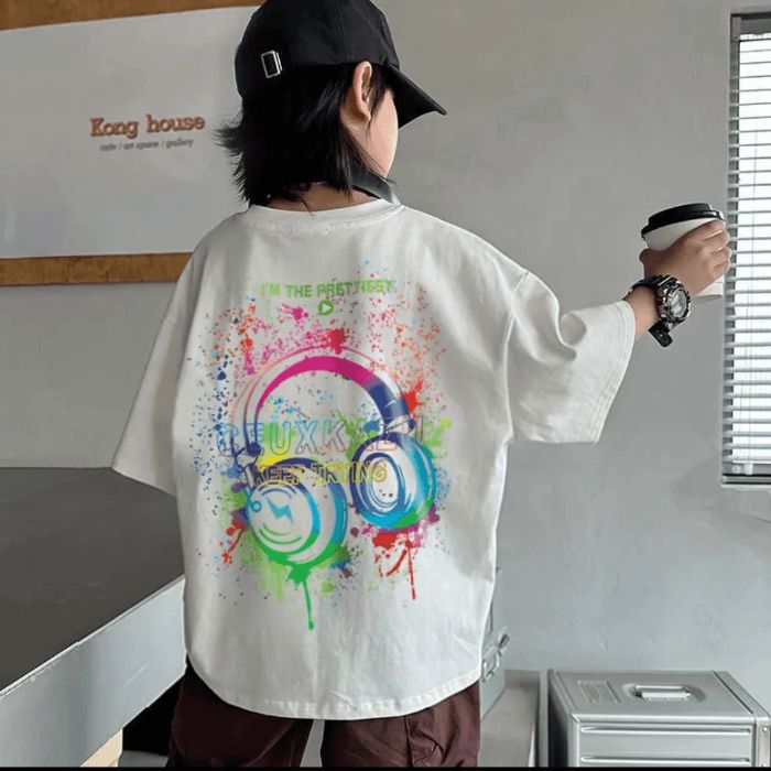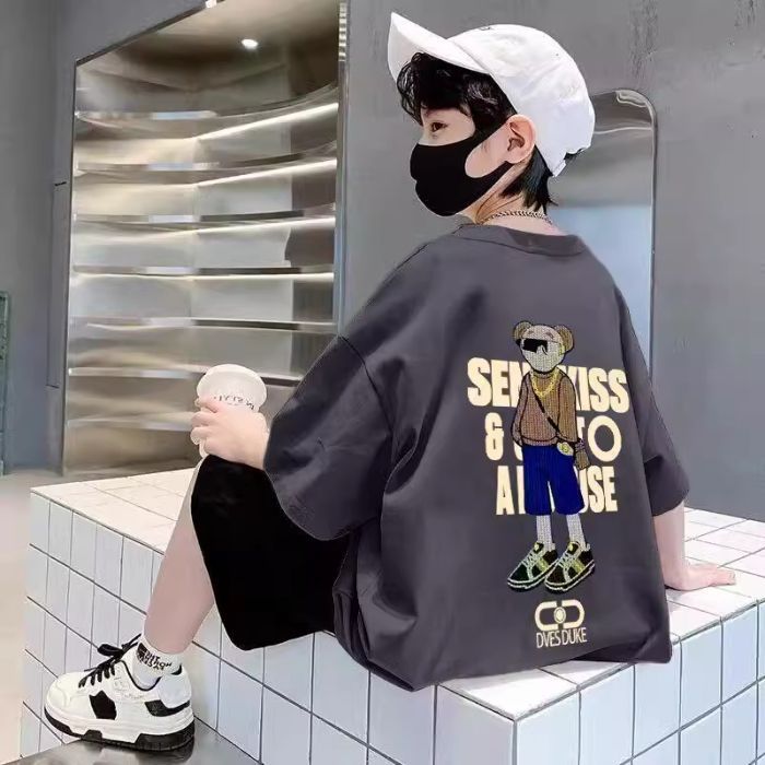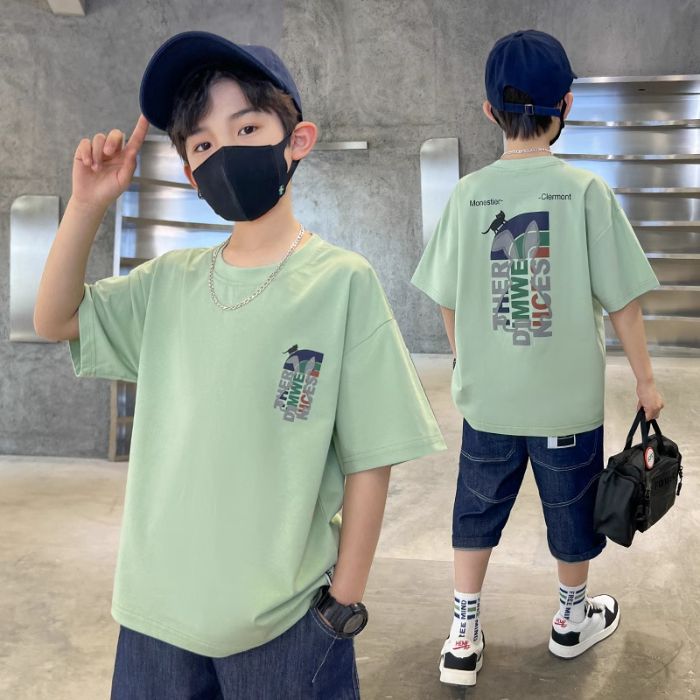 2025 새로운 스타일 소년 순면 반팔 여름 소녀 중대형 어린이 느슨한 라운드 넥 탑 만화 프린트 티셔츠 유행