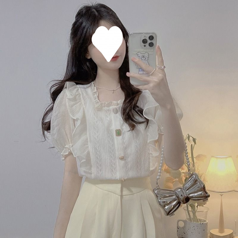 여름 여성용 버진 에지 스퀘어 넥 쉬폰 셔츠, 프렌치 젠틀 스타일, 요정 같은 버블 반팔 러플 쇼트 탑스토어 가기