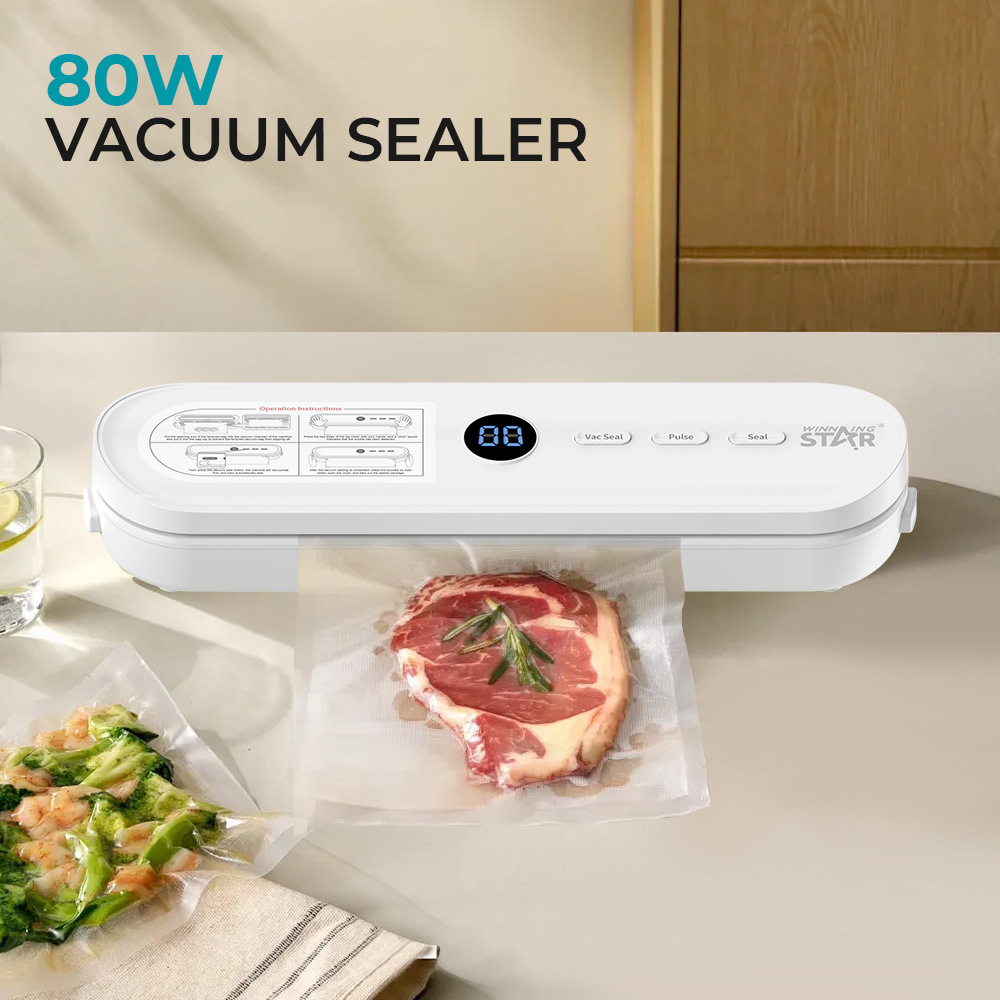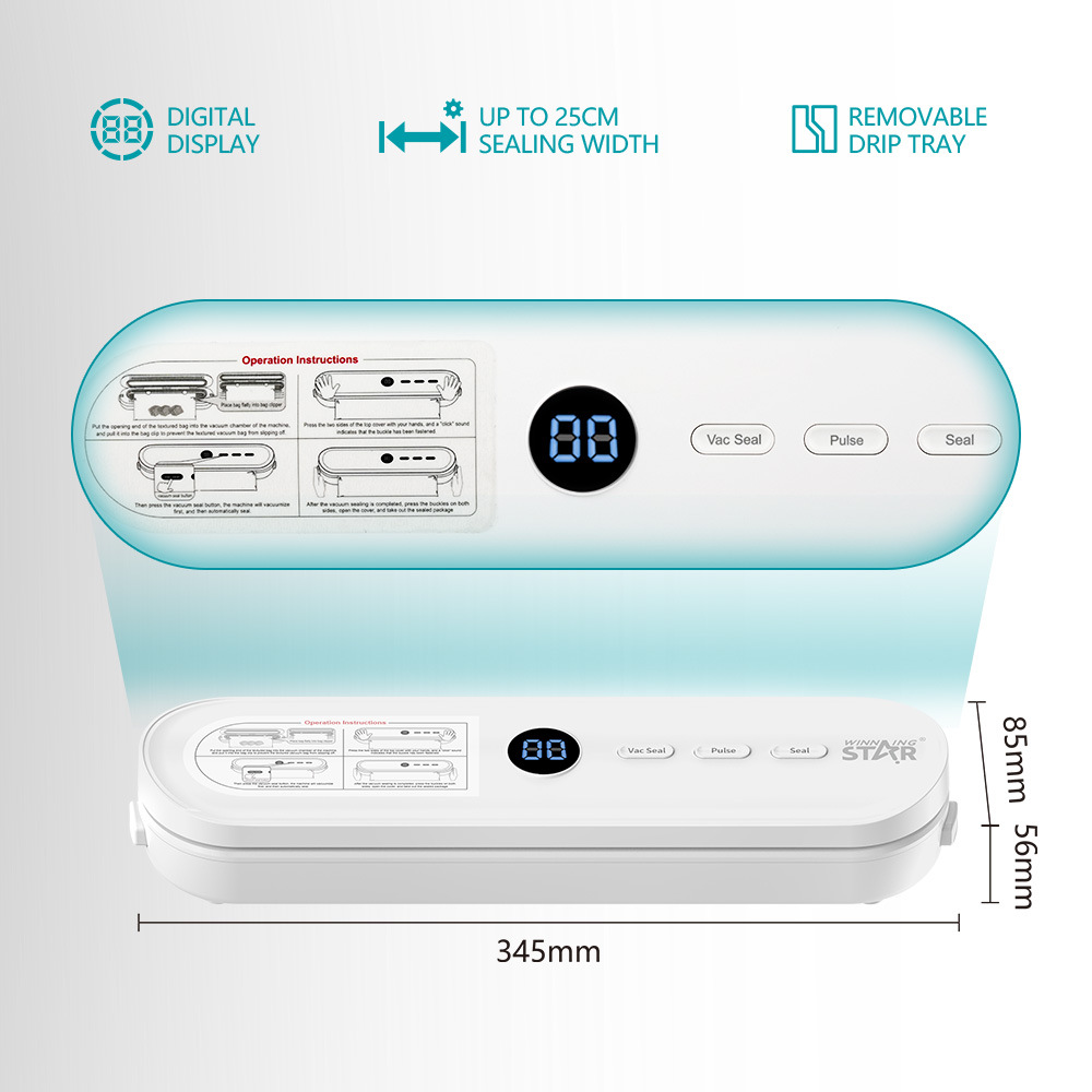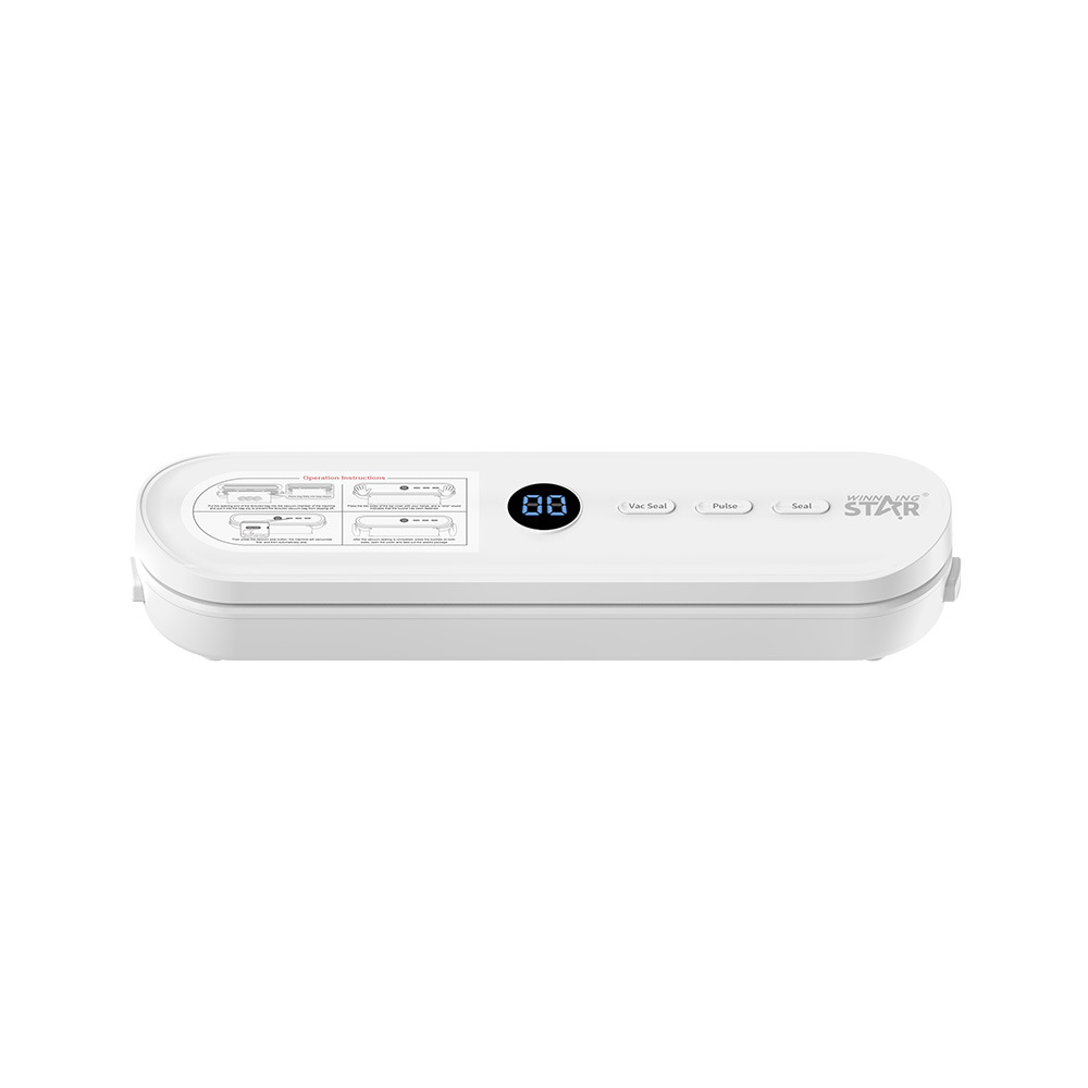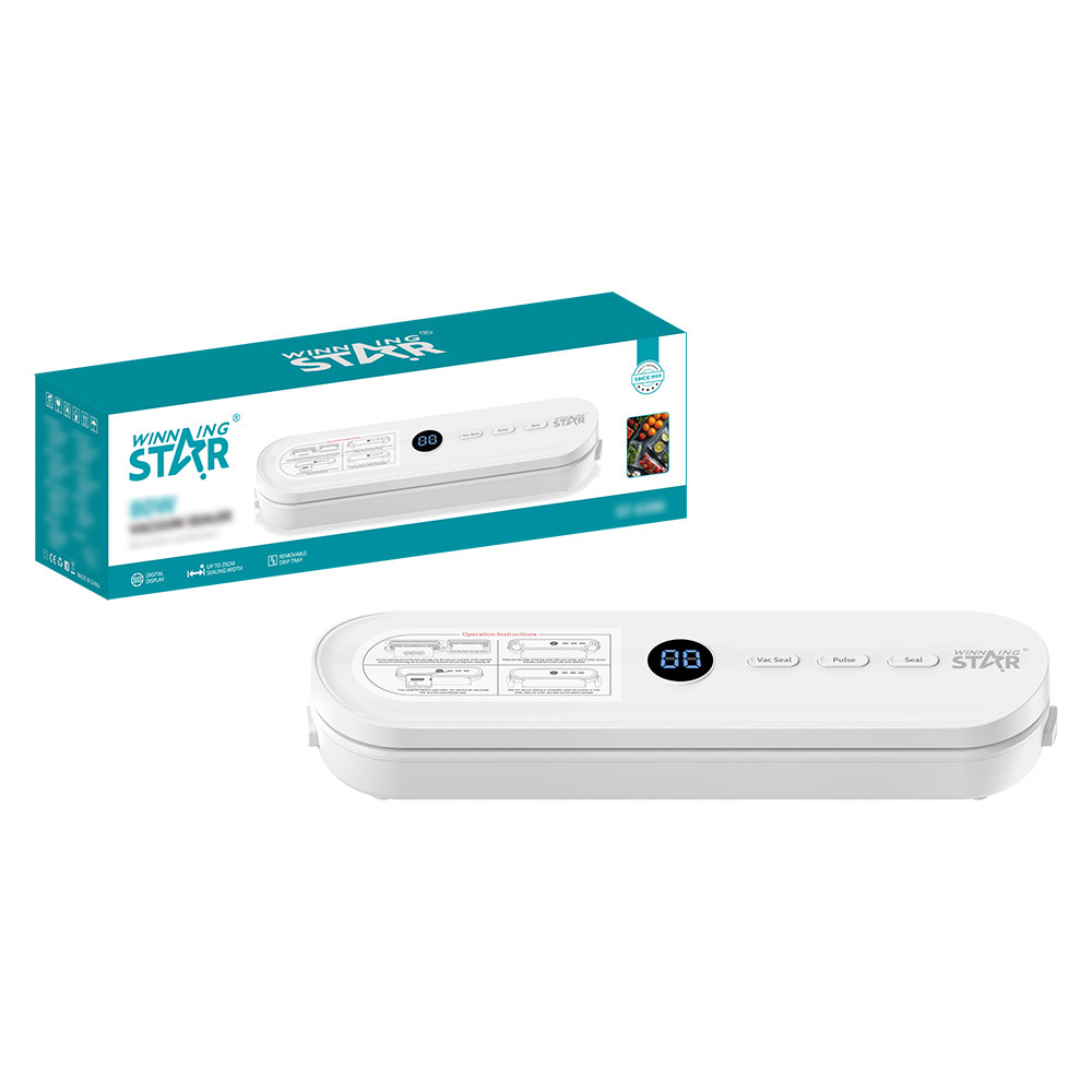 真空保鲜机,ST-6300,小欧插,WINNING STAR品牌,额定电压:AC220-240V,50/60Hz,额定功率:80W,产品尺寸:345*85*56mm,彩盒尺寸:370*92*110mm,产品颜色:亮面白色+白色按键。