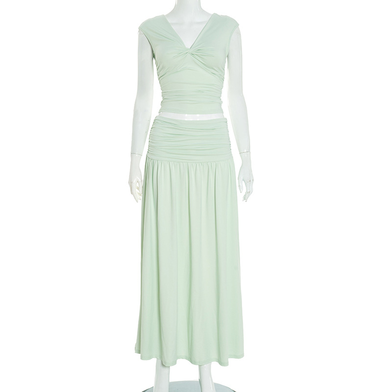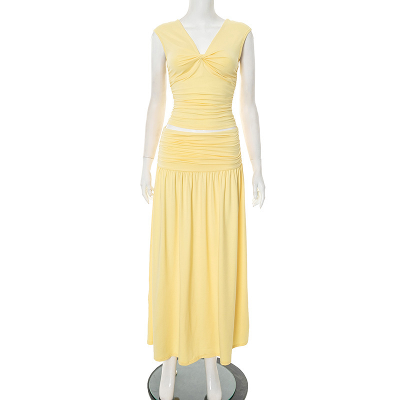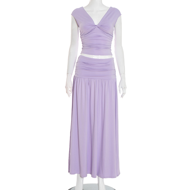 Sanhu Lianjiang D25ST256 유럽과 미국의 트위스트 투웨어 오프 숄더 반팔 탑과 대형 우산 스커트 투피스 슈트스토어 가기