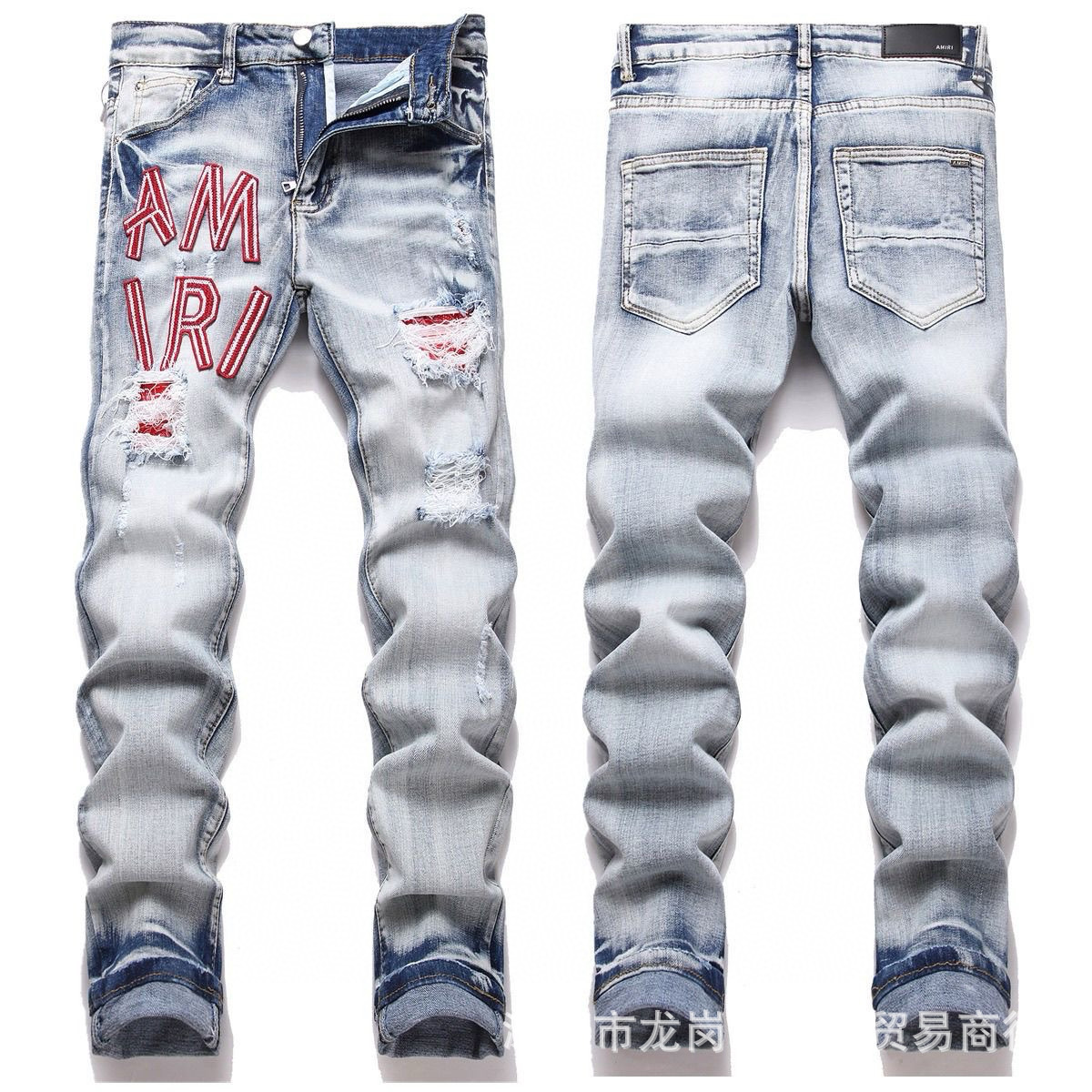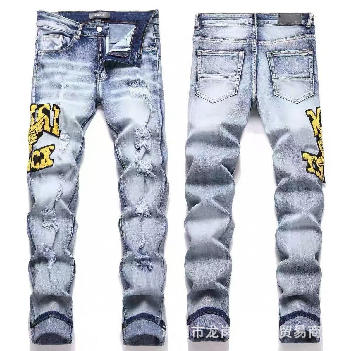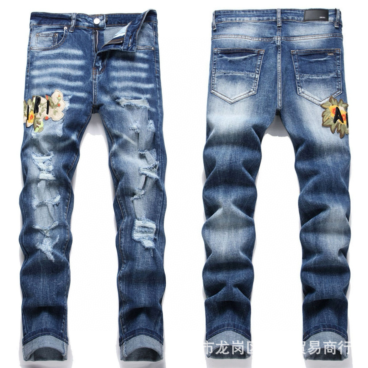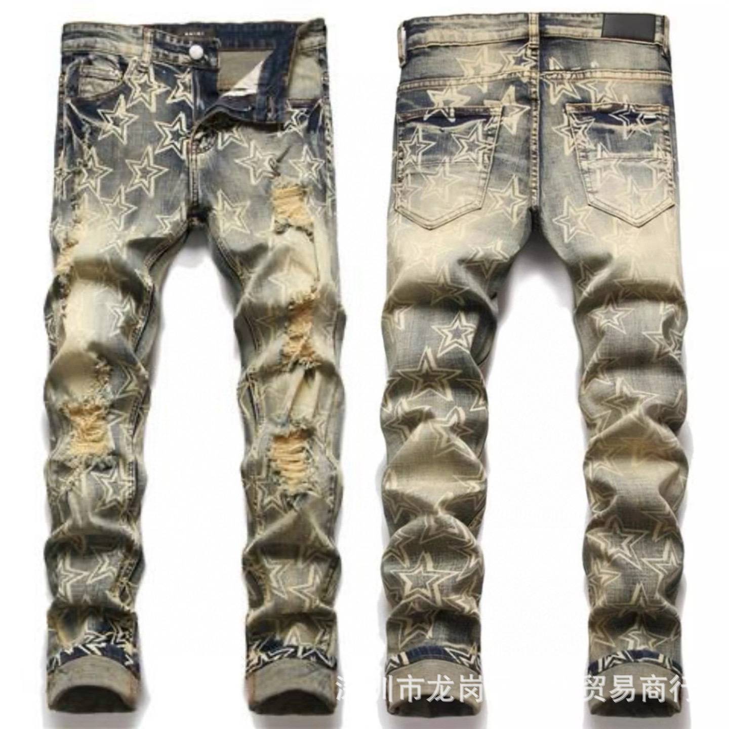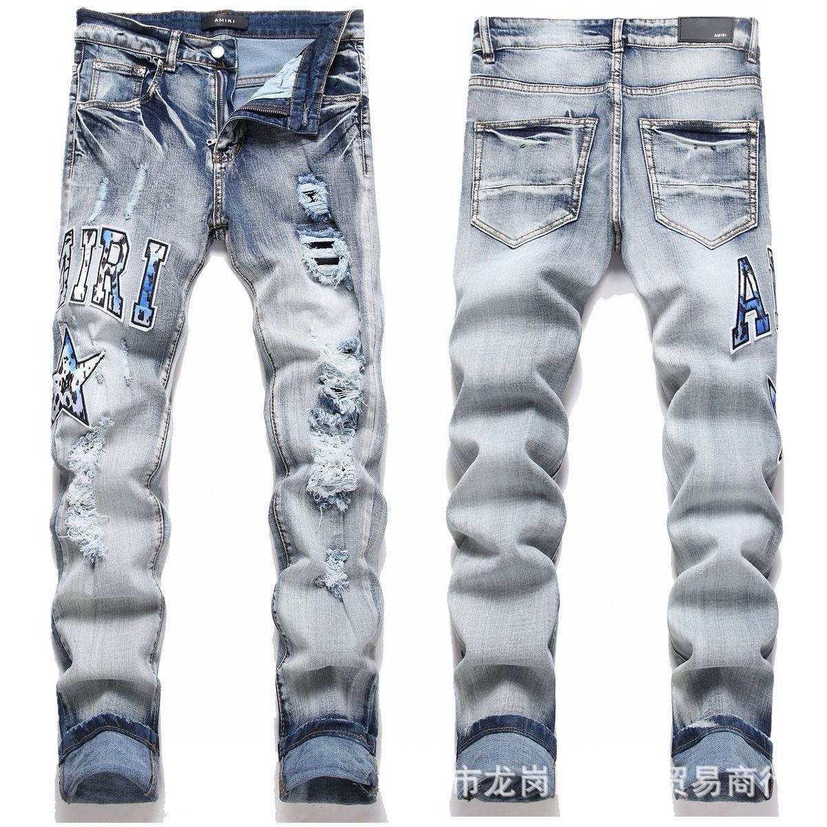 AM 대외 무역 남성용 찢어진 자수 청바지 오각별 트렌디 스트레치 슬림핏 바지 하이 엔드 캐주얼 남성 바지스토어 가기