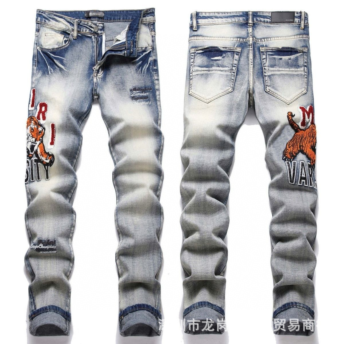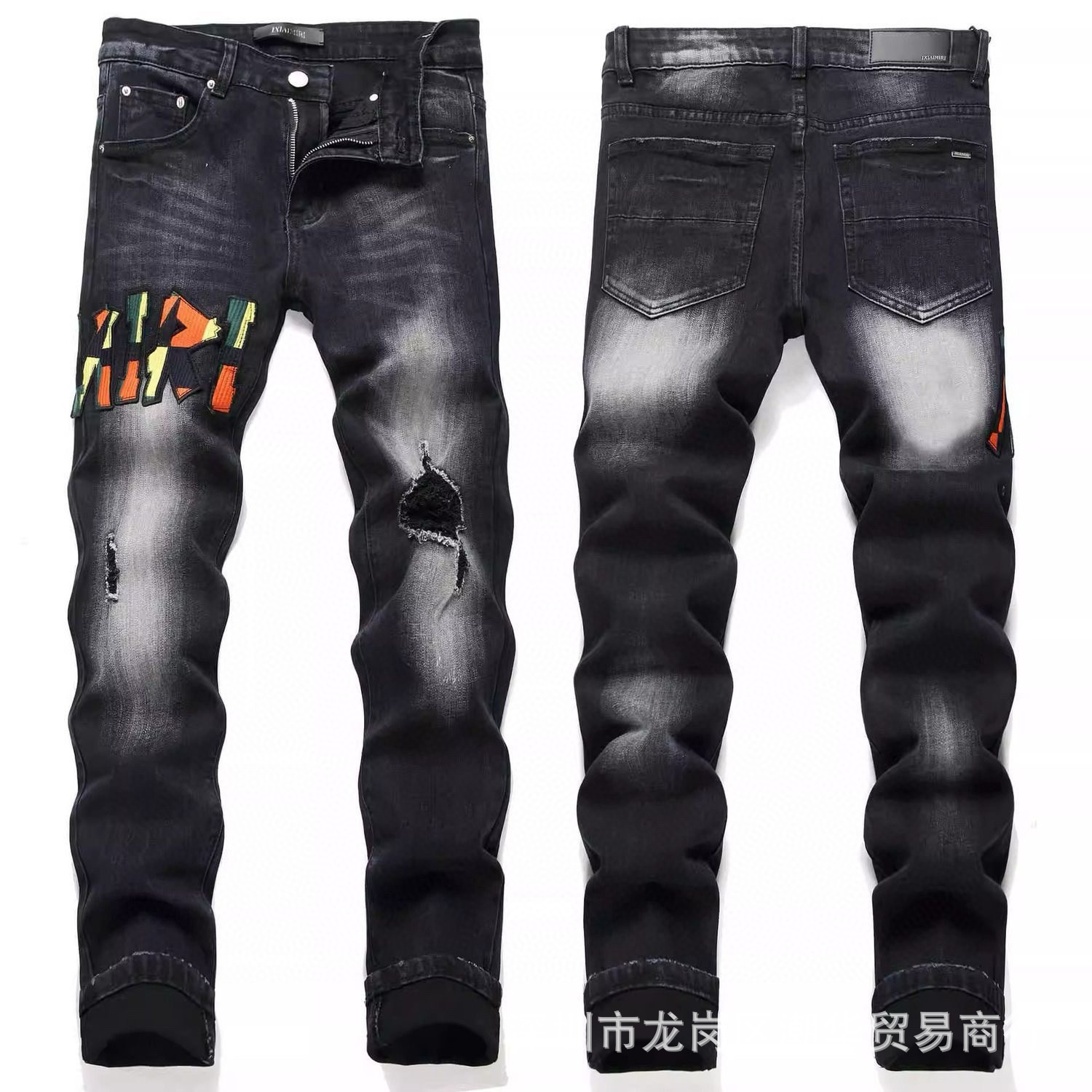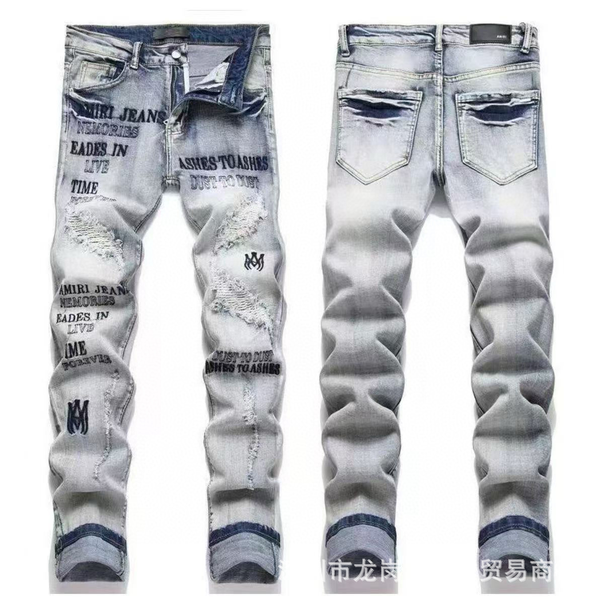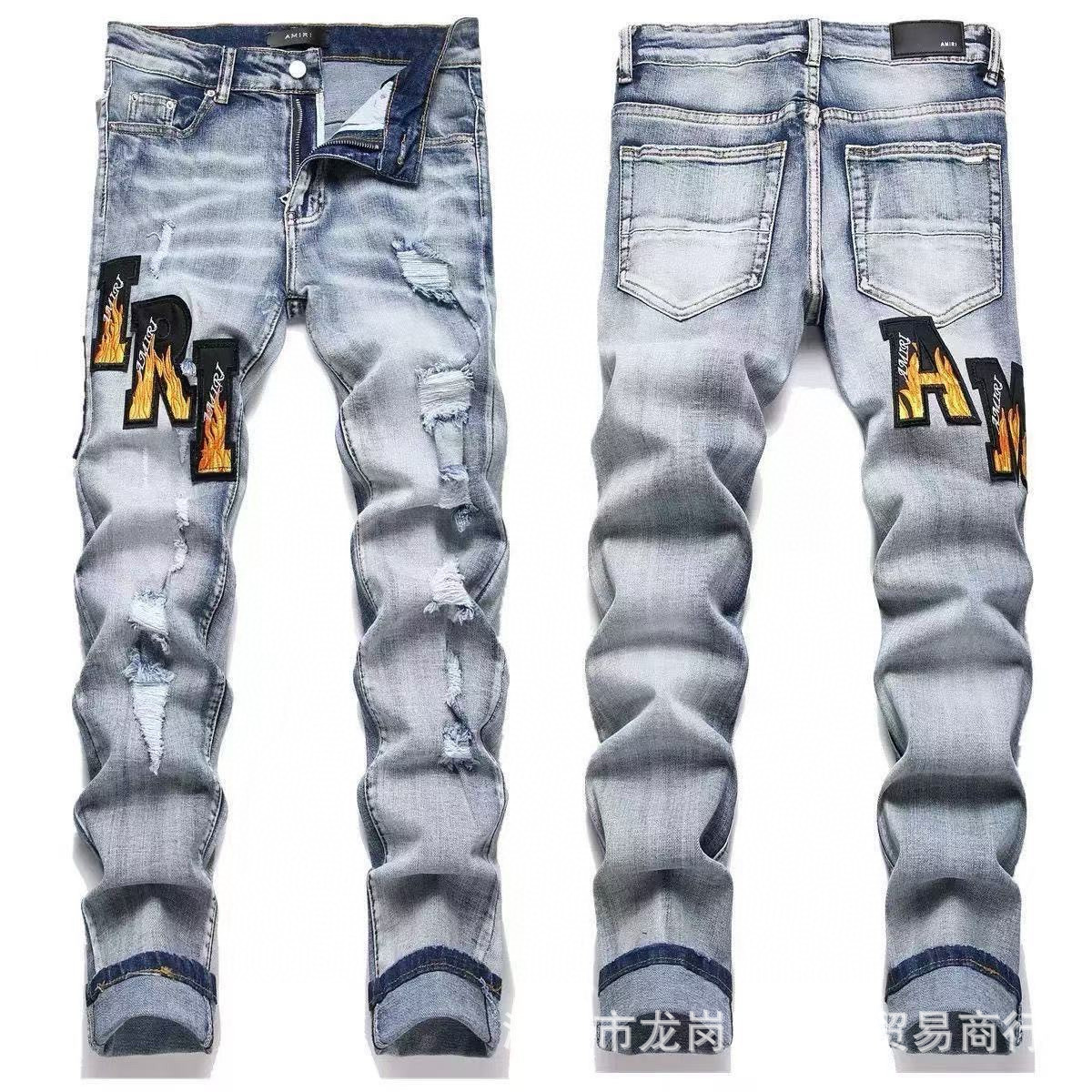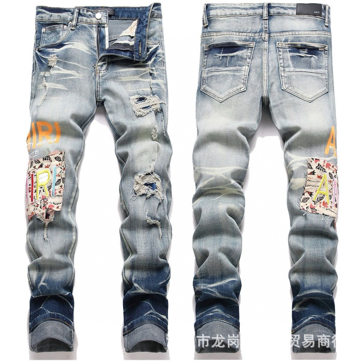 AM 대외 무역 남성용 찢어진 자수 청바지 오각별 트렌디 스트레치 슬림핏 바지 하이 엔드 캐주얼 남성 바지스토어 가기