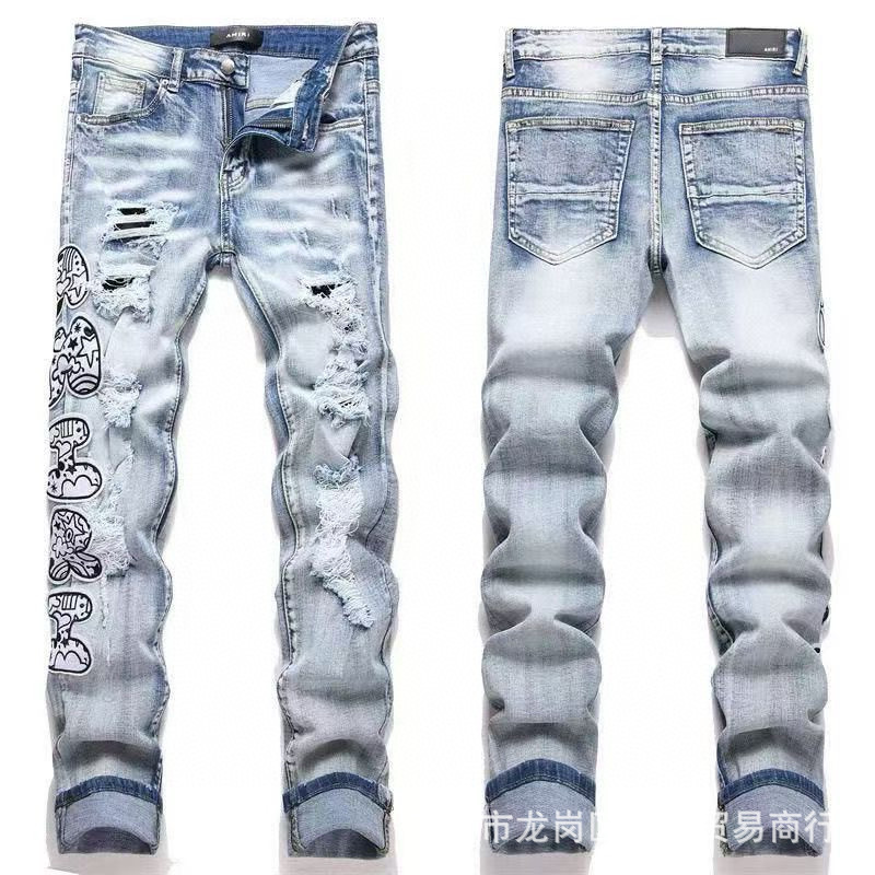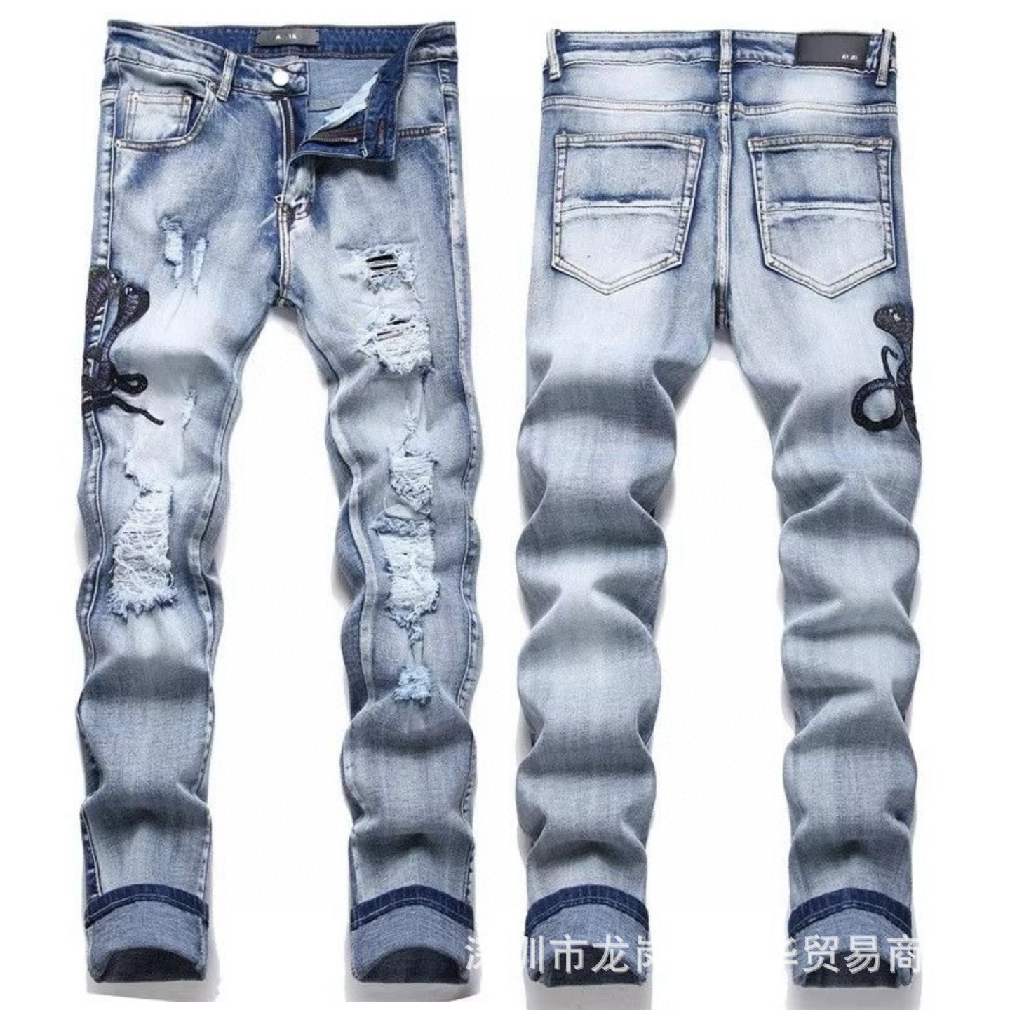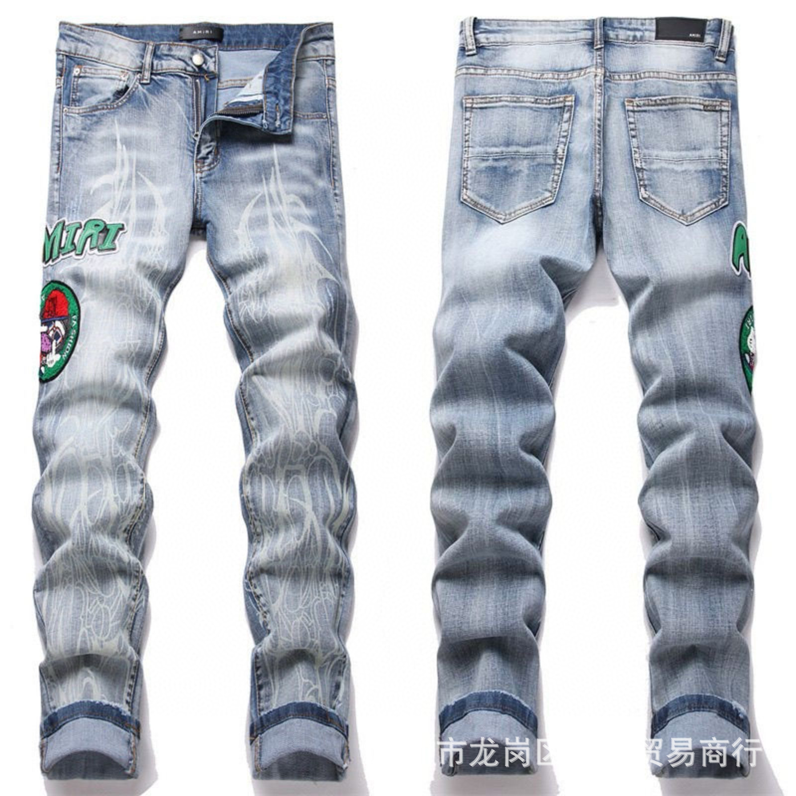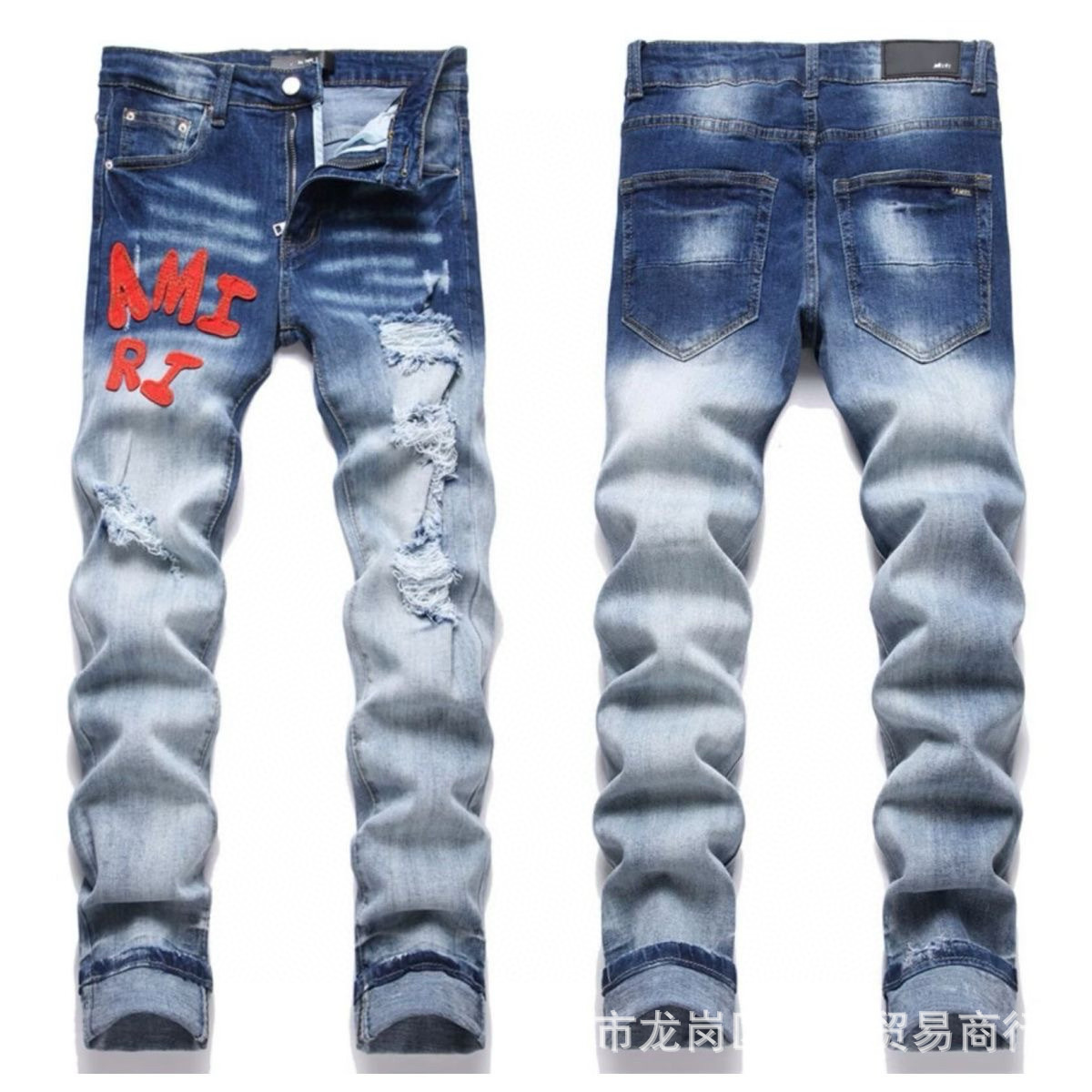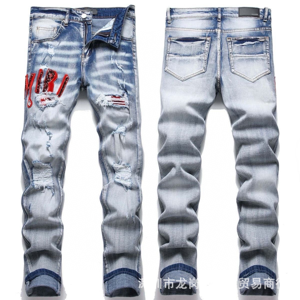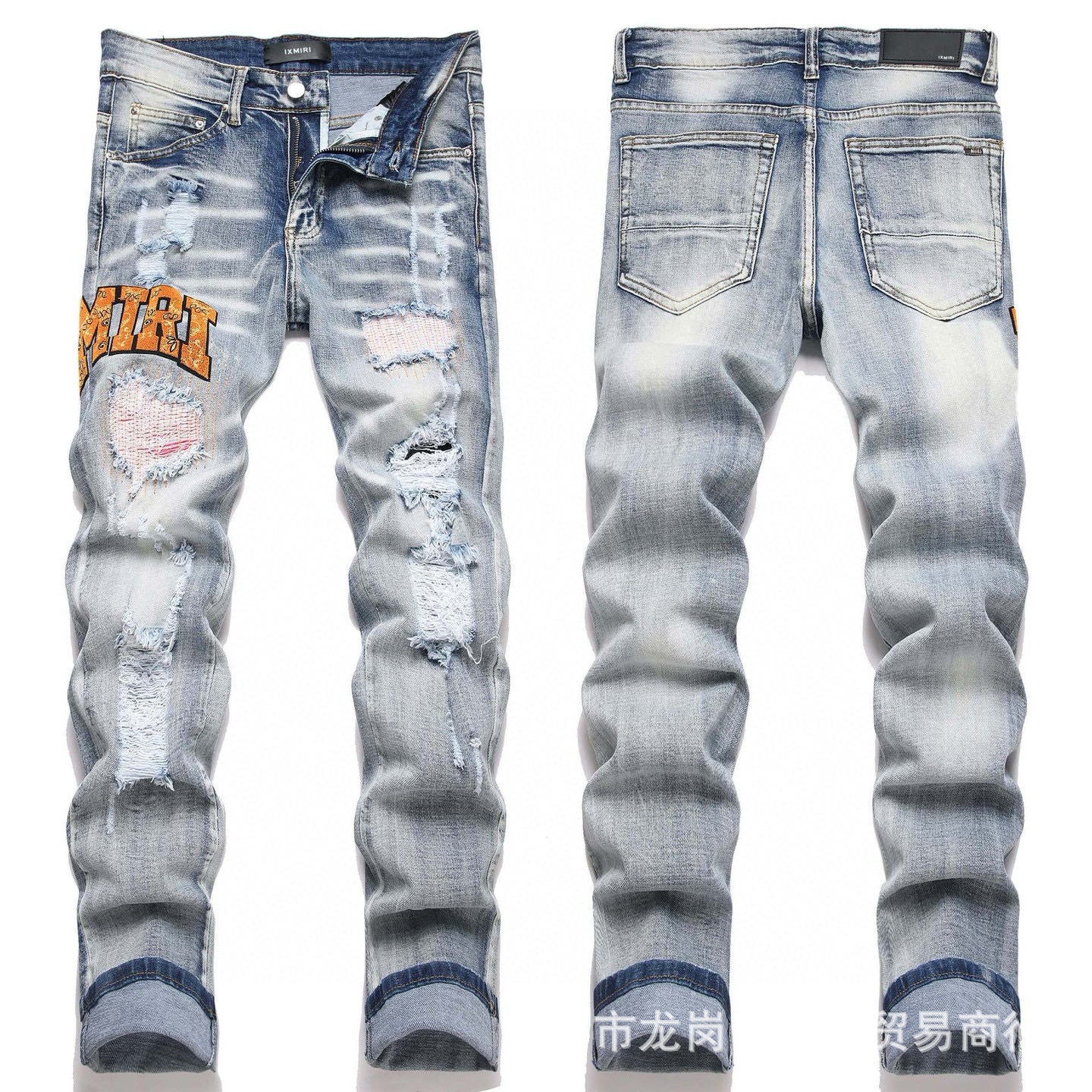 AM 대외 무역 남성용 찢어진 자수 청바지 오각별 트렌디 스트레치 슬림핏 바지 하이 엔드 캐주얼 남성 바지스토어 가기