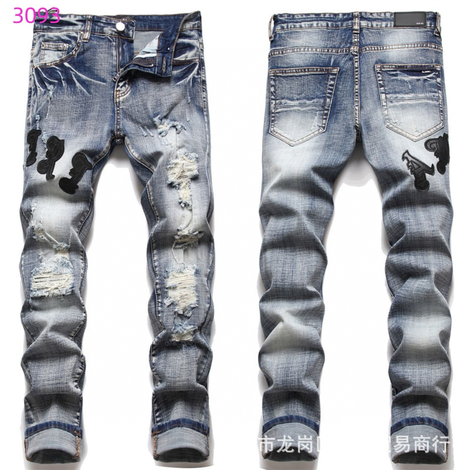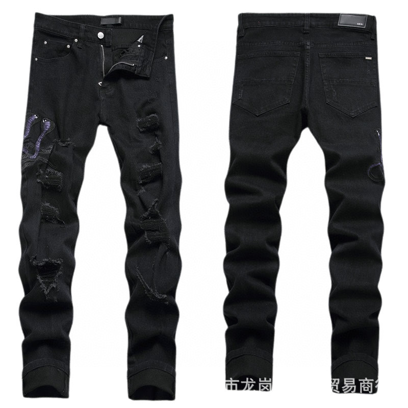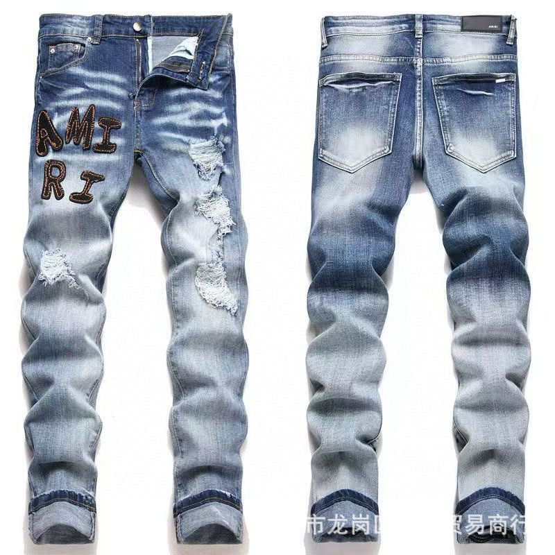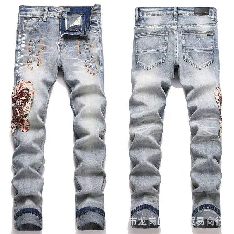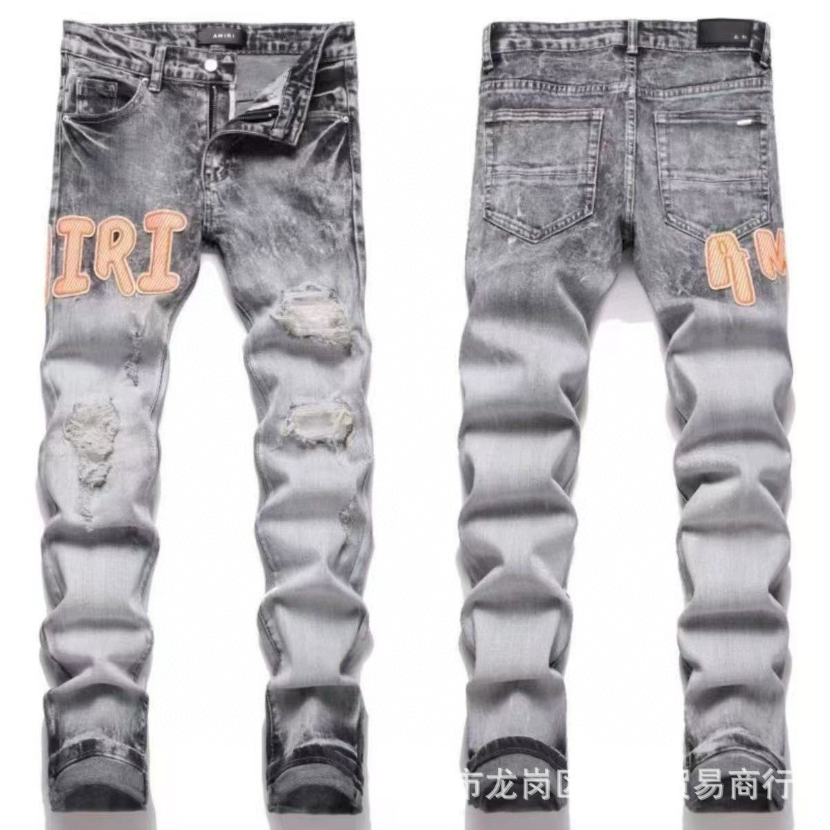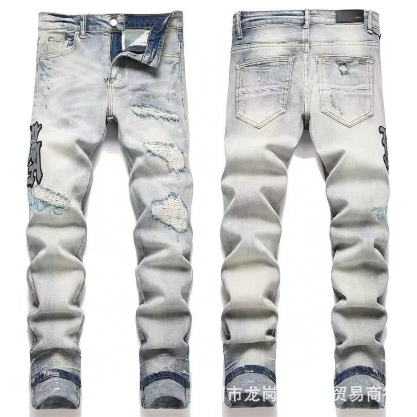 AM 대외 무역 남성용 찢어진 자수 청바지 오각별 트렌디 스트레치 슬림핏 바지 하이 엔드 캐주얼 남성 바지스토어 가기