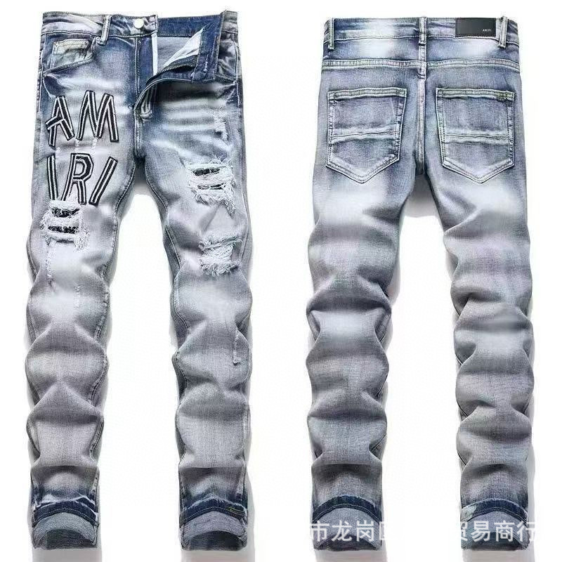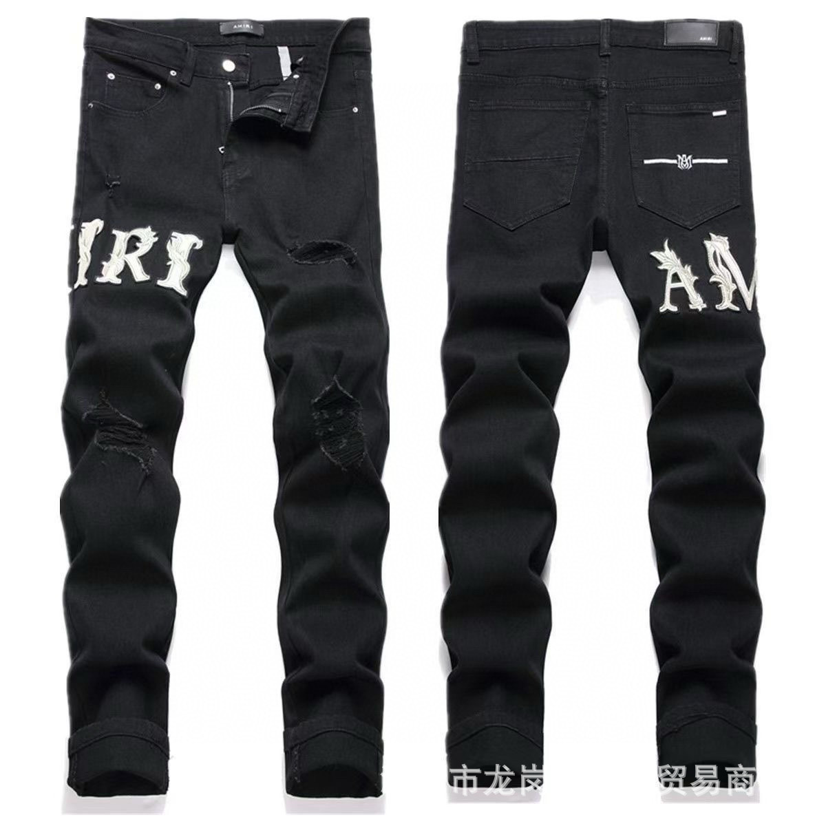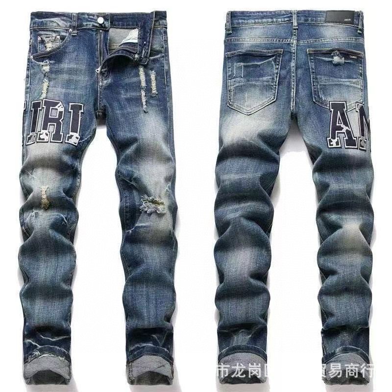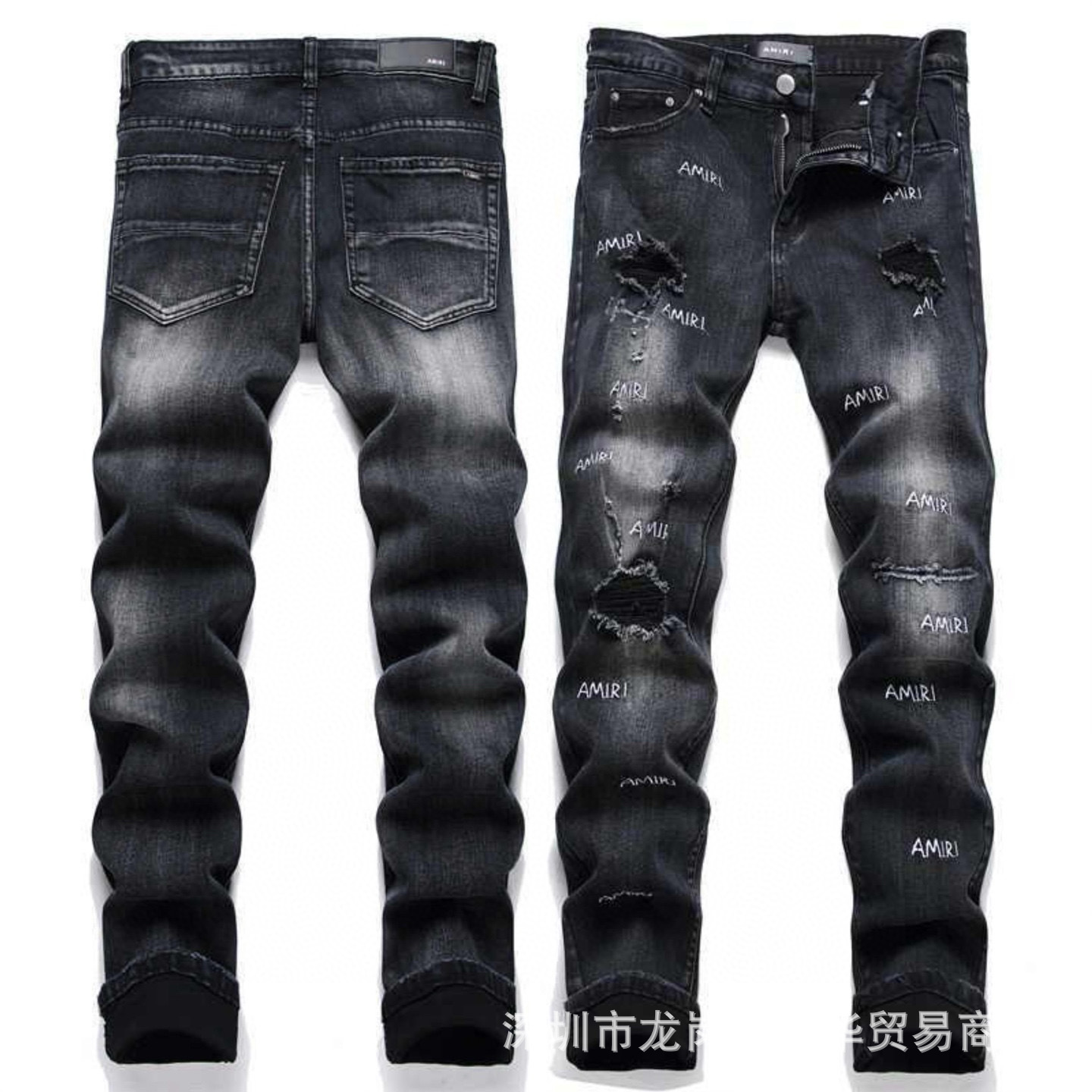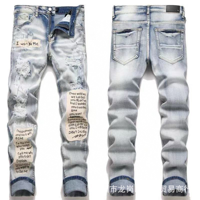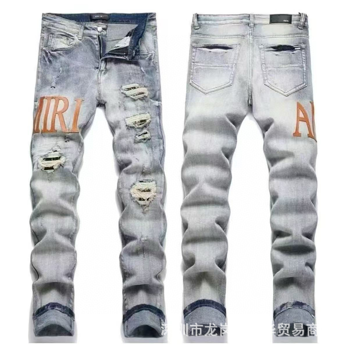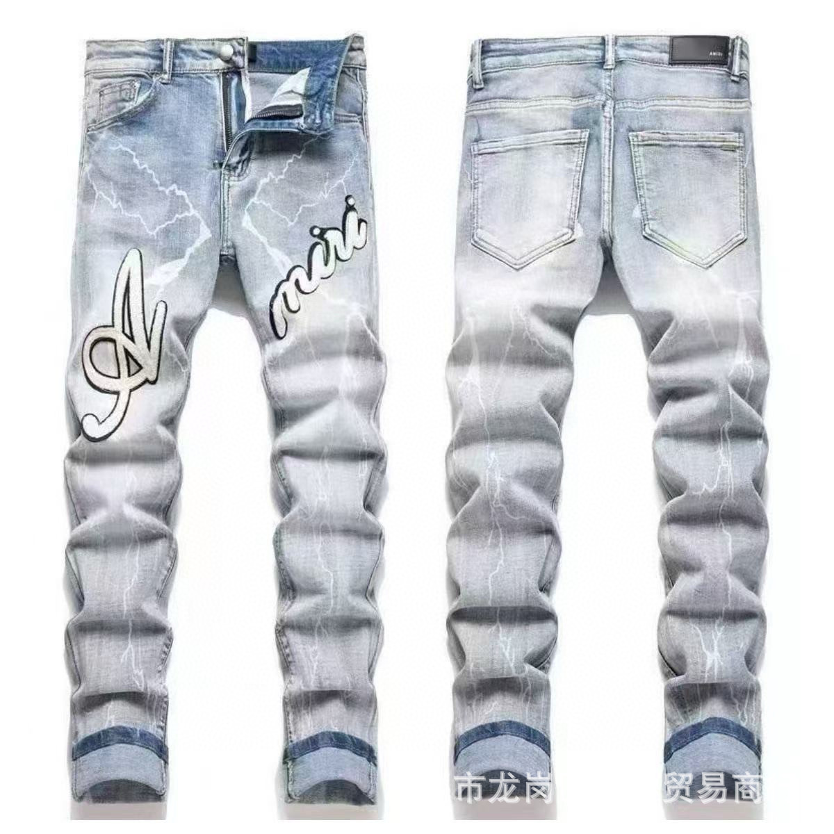 AM 대외 무역 남성용 찢어진 자수 청바지 오각별 트렌디 스트레치 슬림핏 바지 하이 엔드 캐주얼 남성 바지스토어 가기