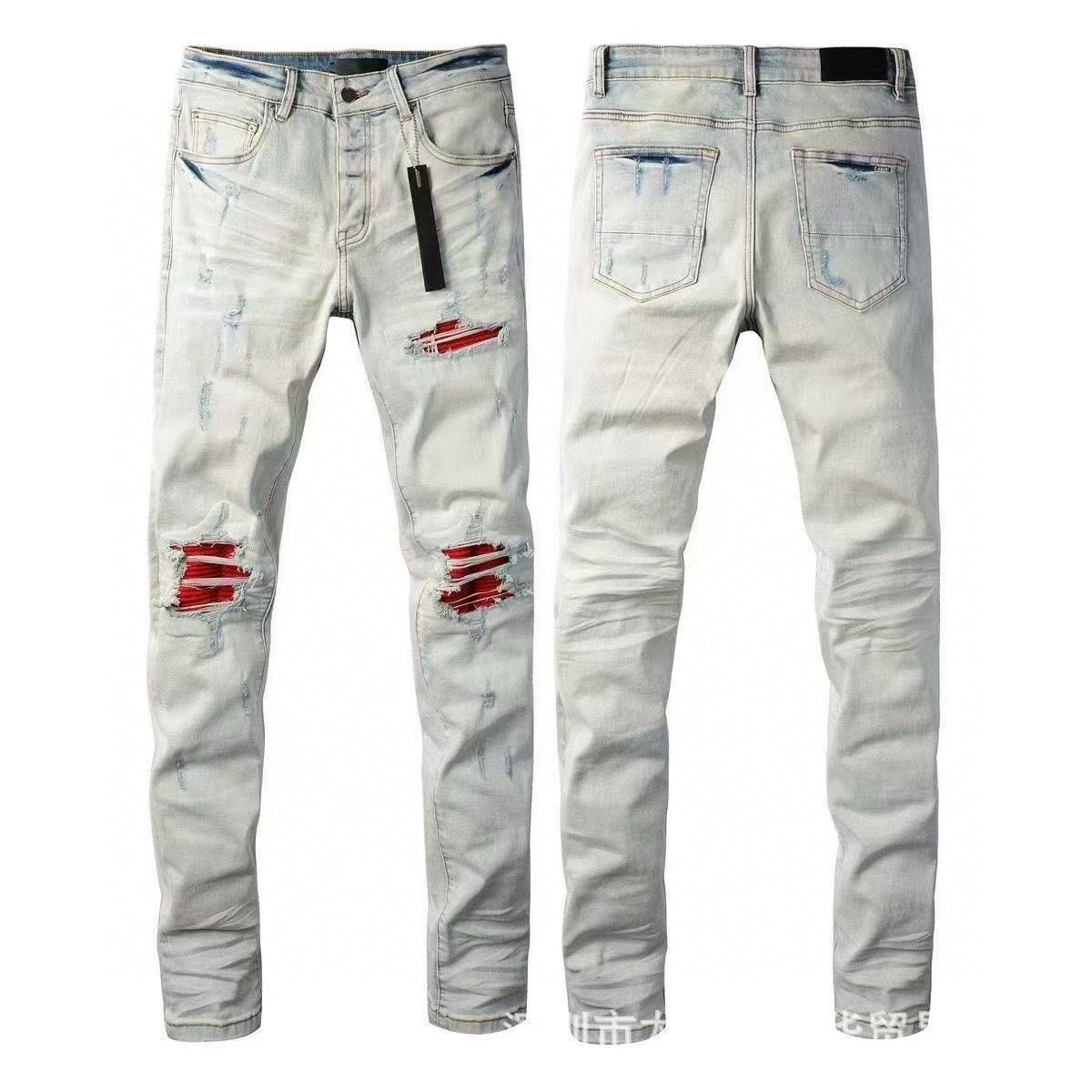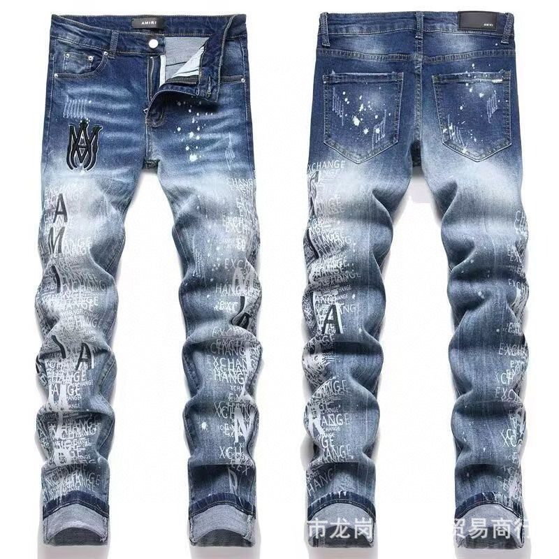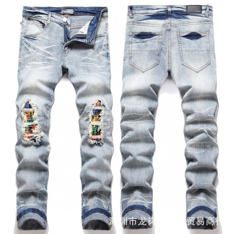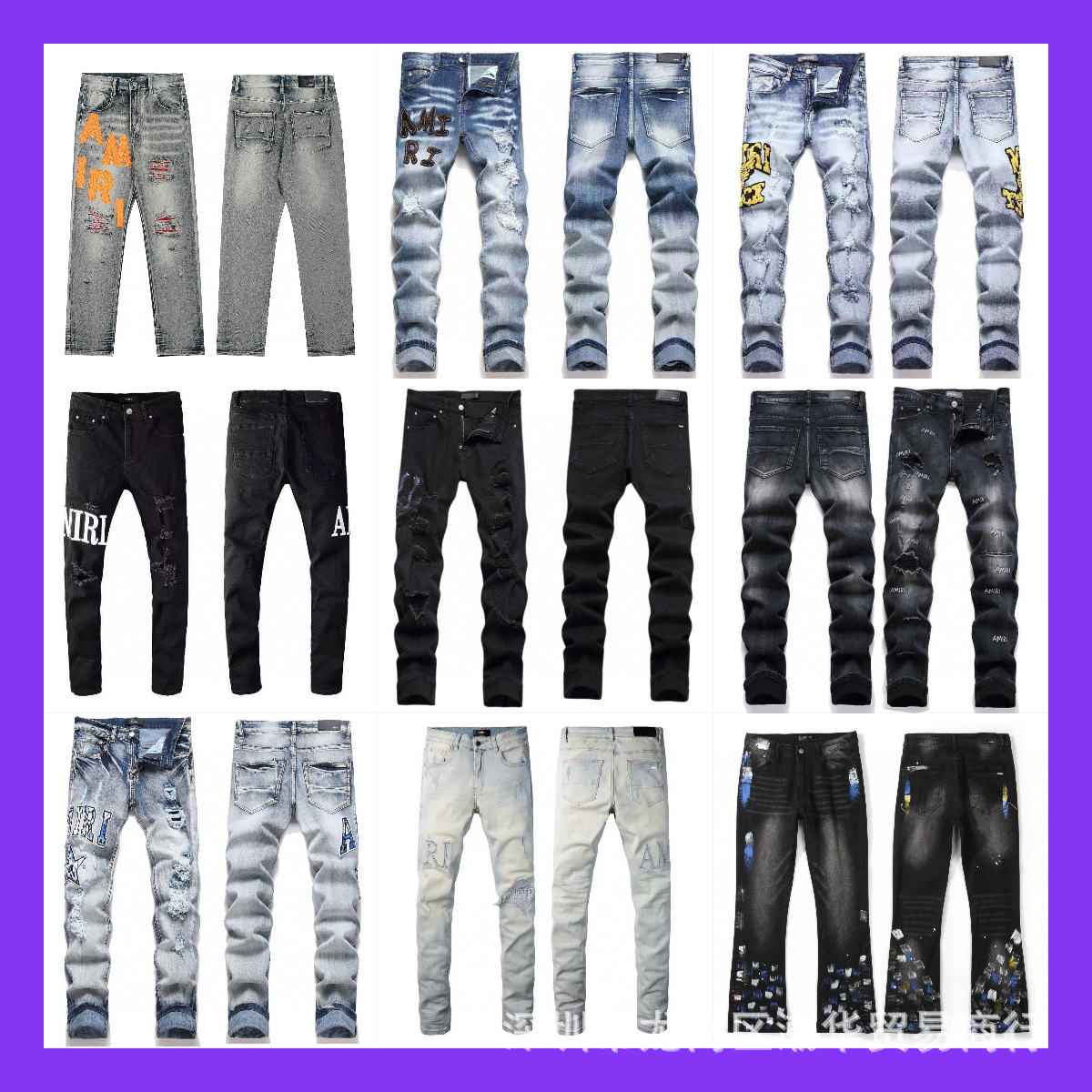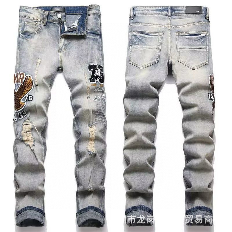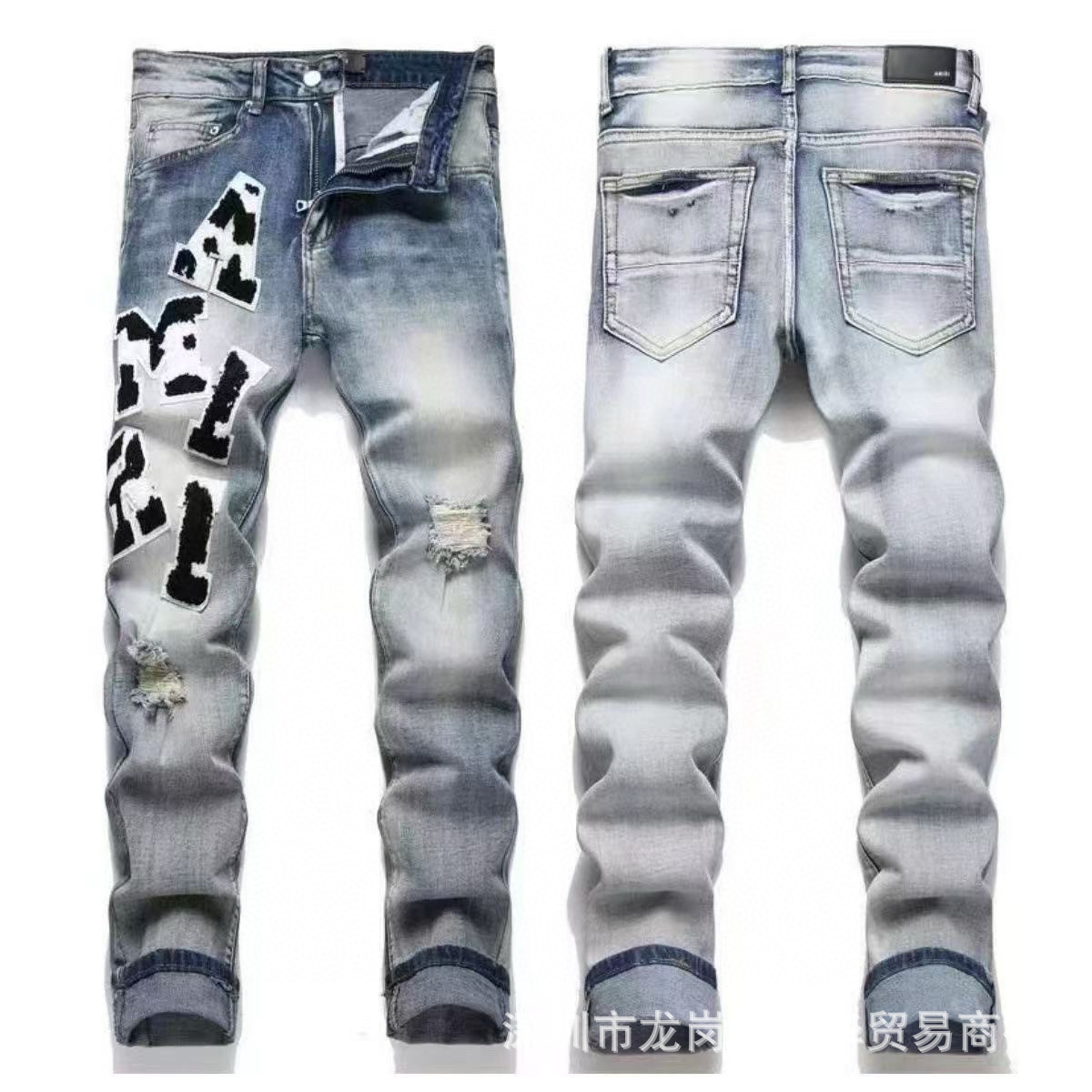 AM 대외 무역 남성용 찢어진 자수 청바지 오각별 트렌디 스트레치 슬림핏 바지 하이 엔드 캐주얼 남성 바지스토어 가기