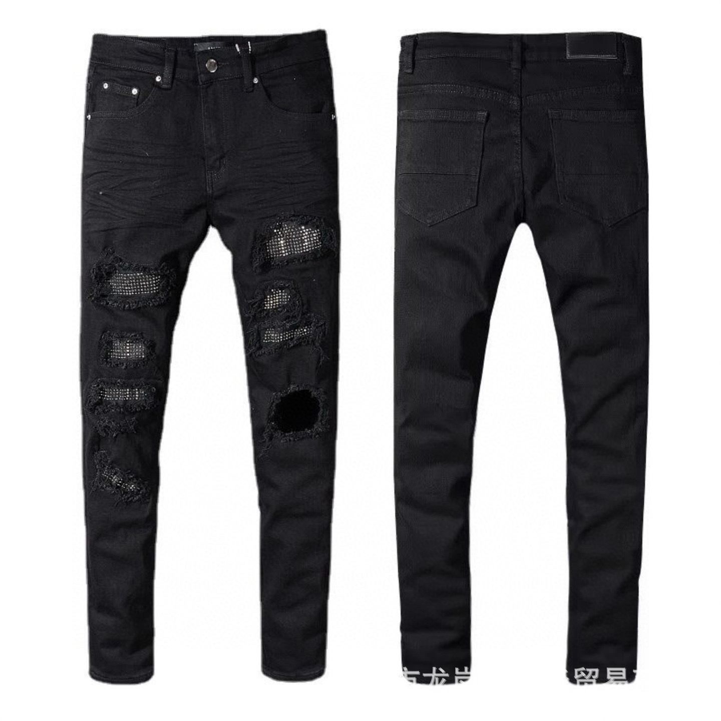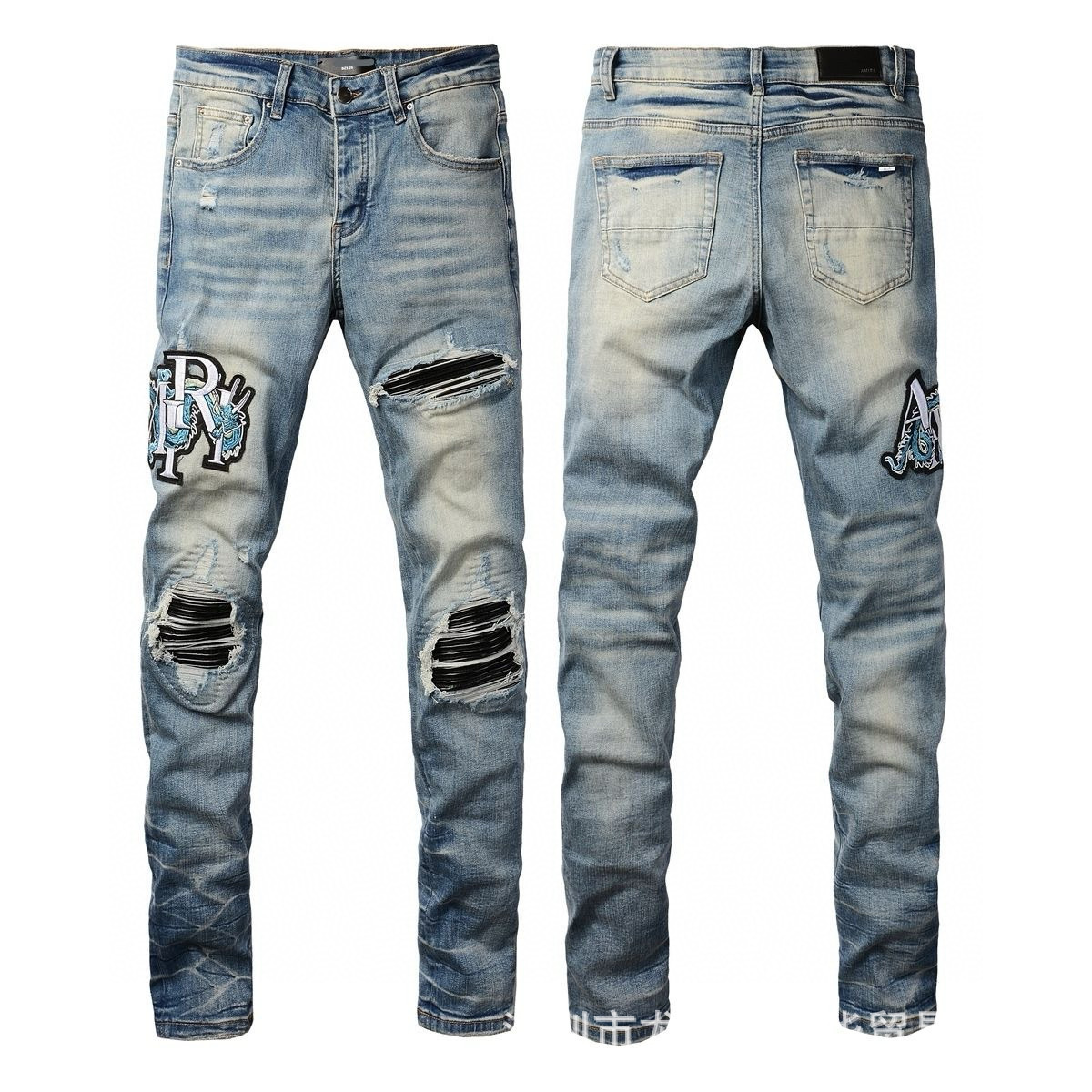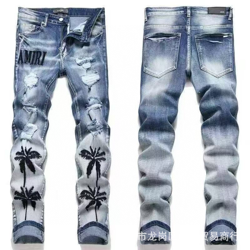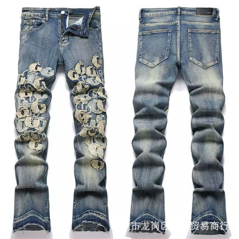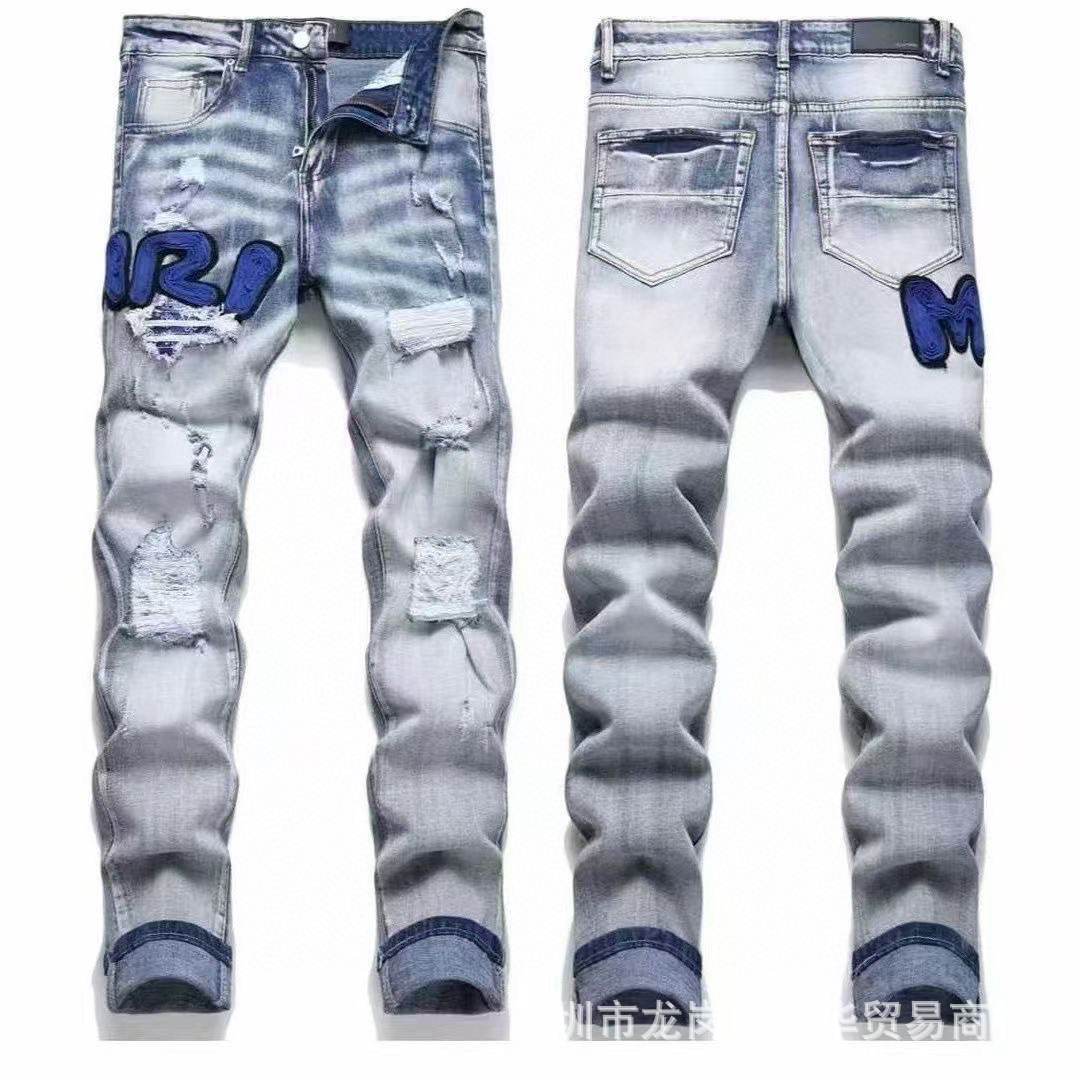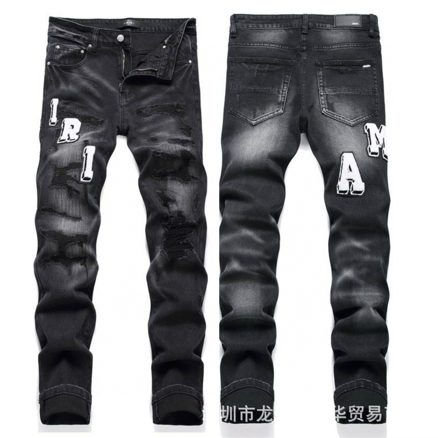 AM 대외 무역 남성용 찢어진 자수 청바지 오각별 트렌디 스트레치 슬림핏 바지 하이 엔드 캐주얼 남성 바지스토어 가기