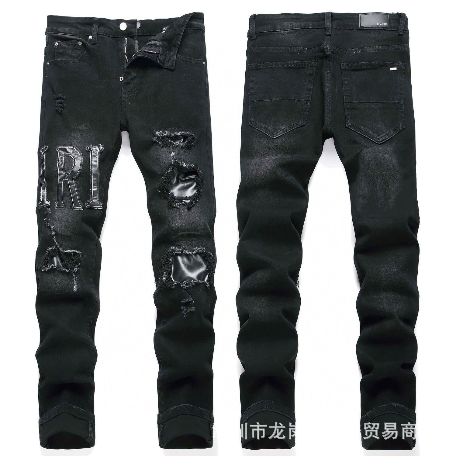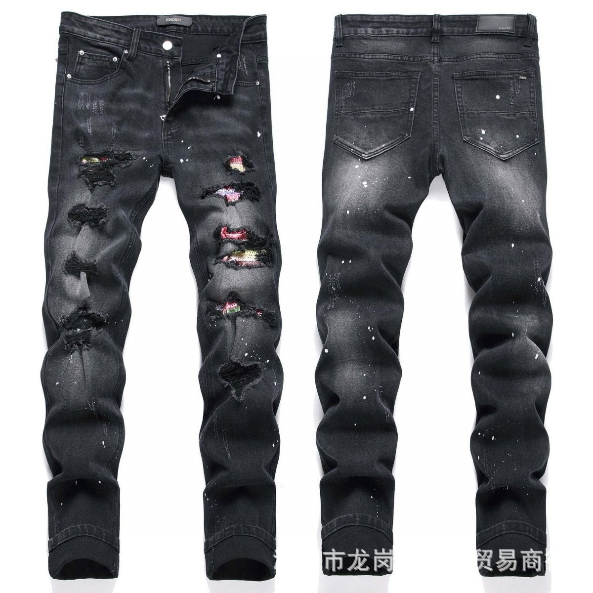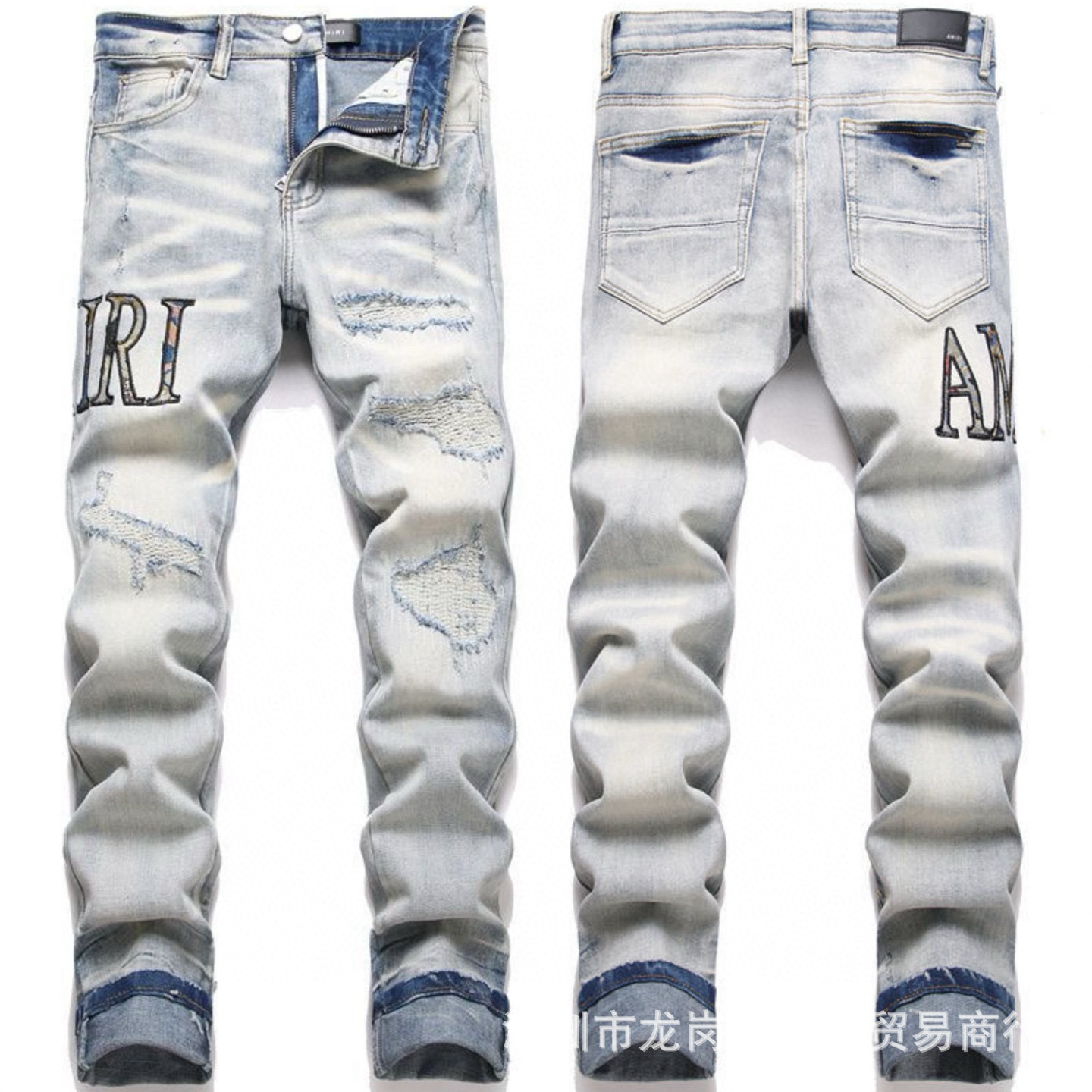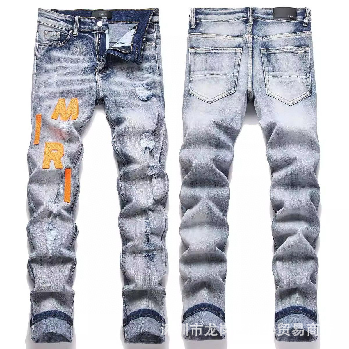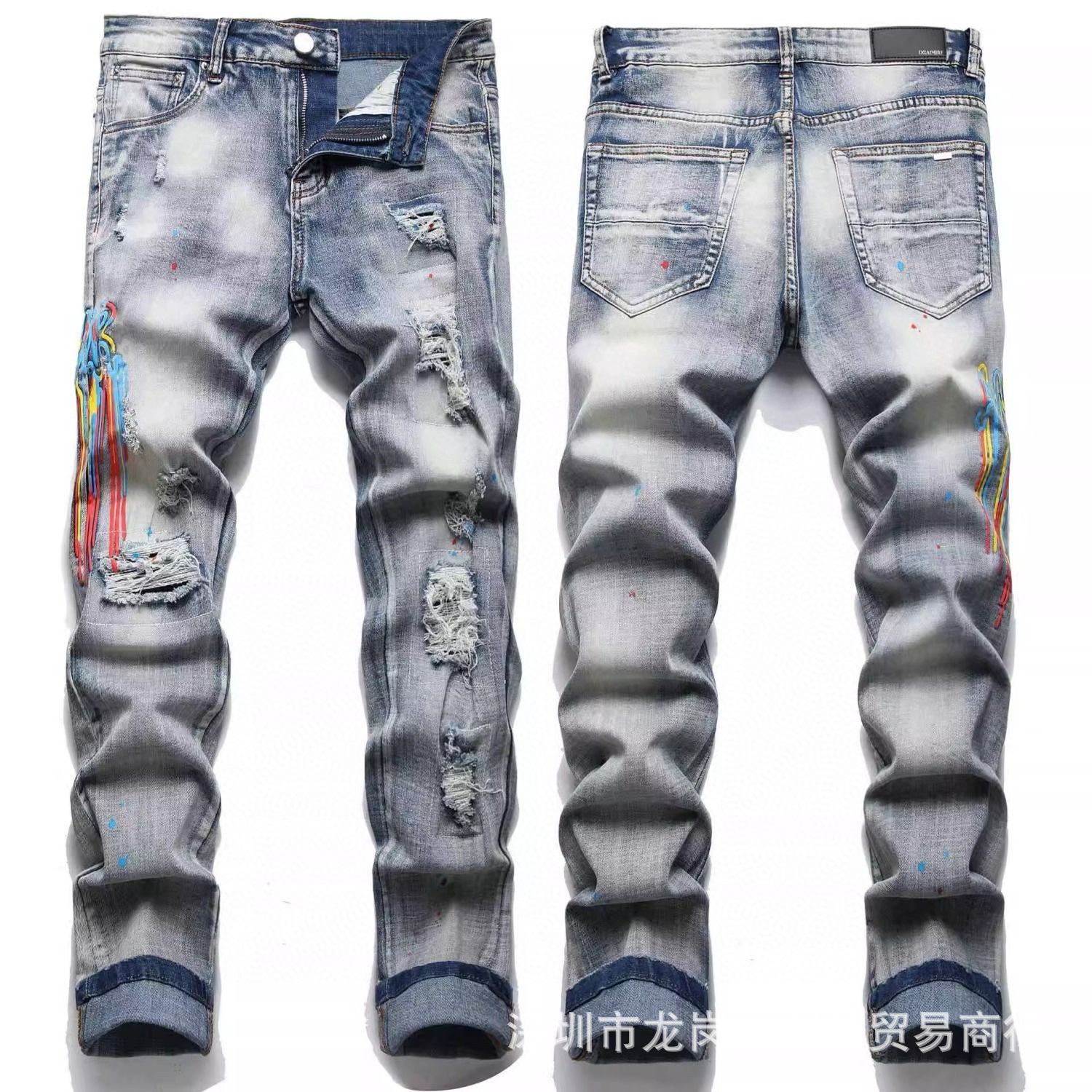 AM 대외 무역 남성용 찢어진 자수 청바지 오각별 트렌디 스트레치 슬림핏 바지 하이 엔드 캐주얼 남성 바지