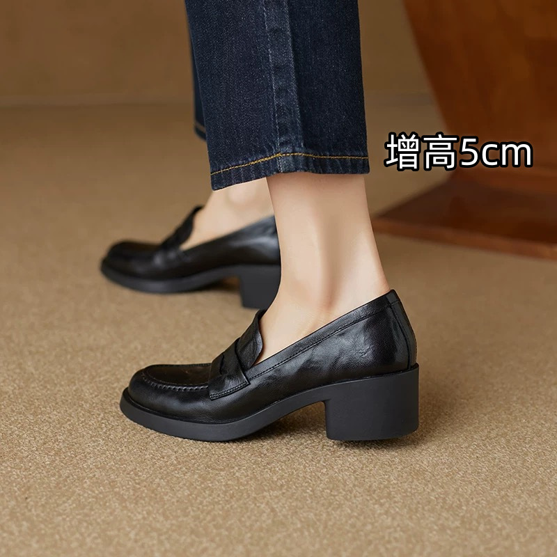 여성용 브리티시 스타일 레트로 소프트 가죽 로퍼, 두꺼운 미드 힐, 블랙 다용도 소형 가죽 신발, 라운드 토 소프트 솔 슈즈