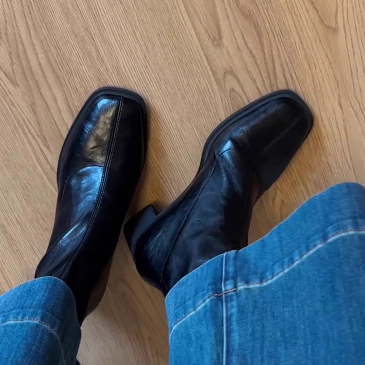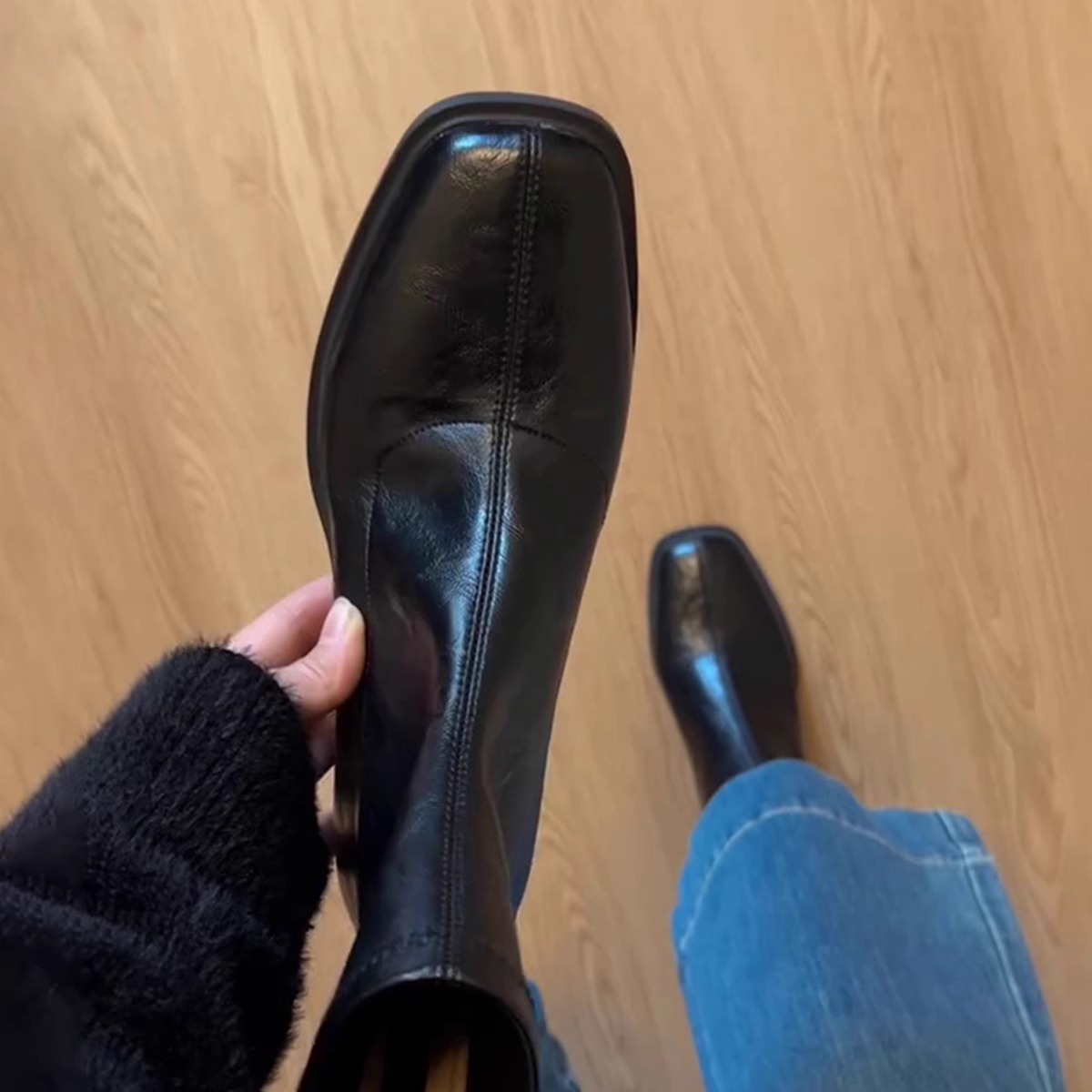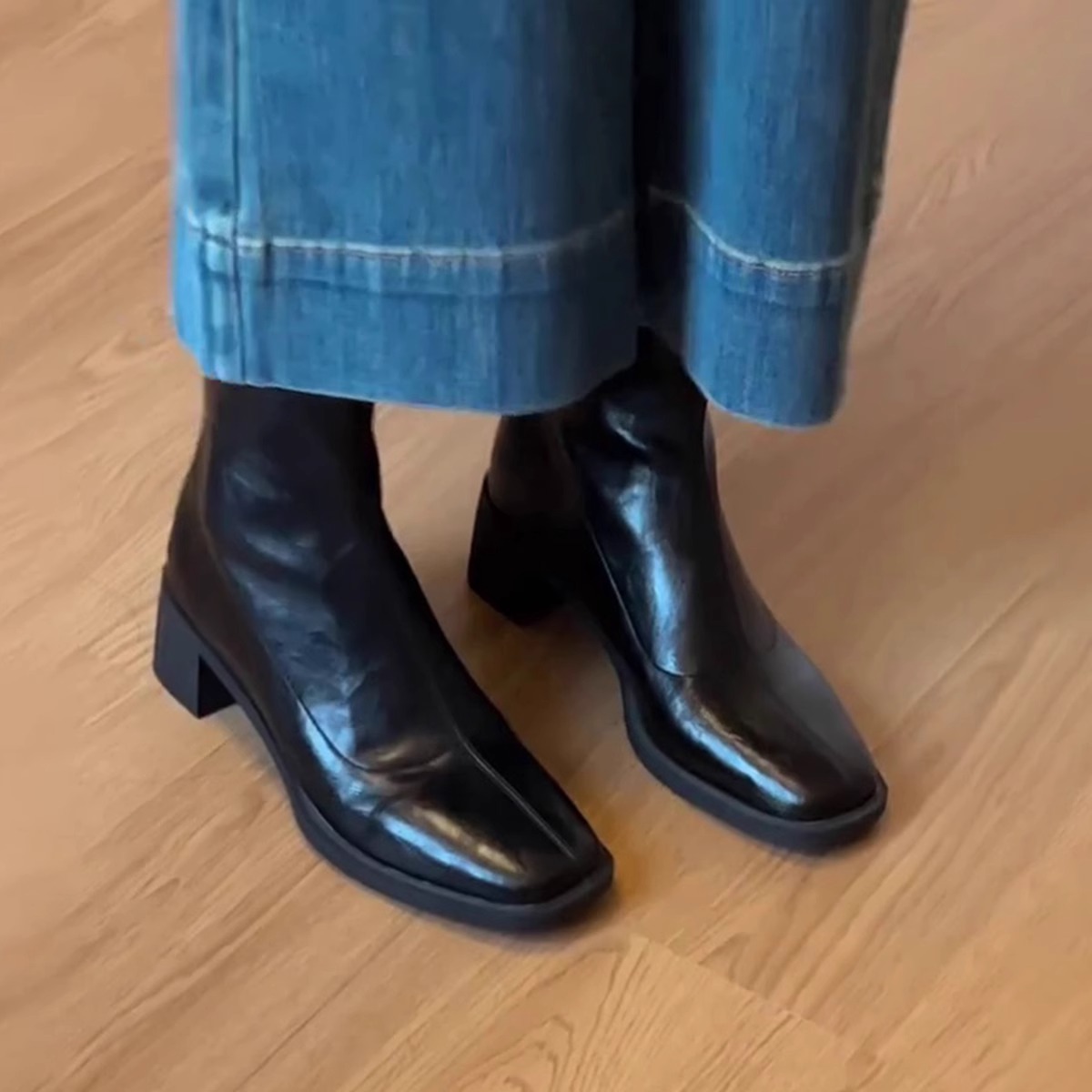 소가죽 버전 ~ 여성용 하이힐 숏부츠 2025 가을 겨울 신상 스퀘어토 마틴부츠 스몰 프렌치 두꺼운 굽 슬림부츠
