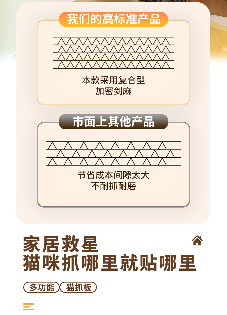 特点 1:剑麻是天然植物纤维,剑麻纤维粗硬坚韧,结构紧密,能承受猫咪长时间、高强度抓挠,不易变形、破损和掉屑,使用寿命长。