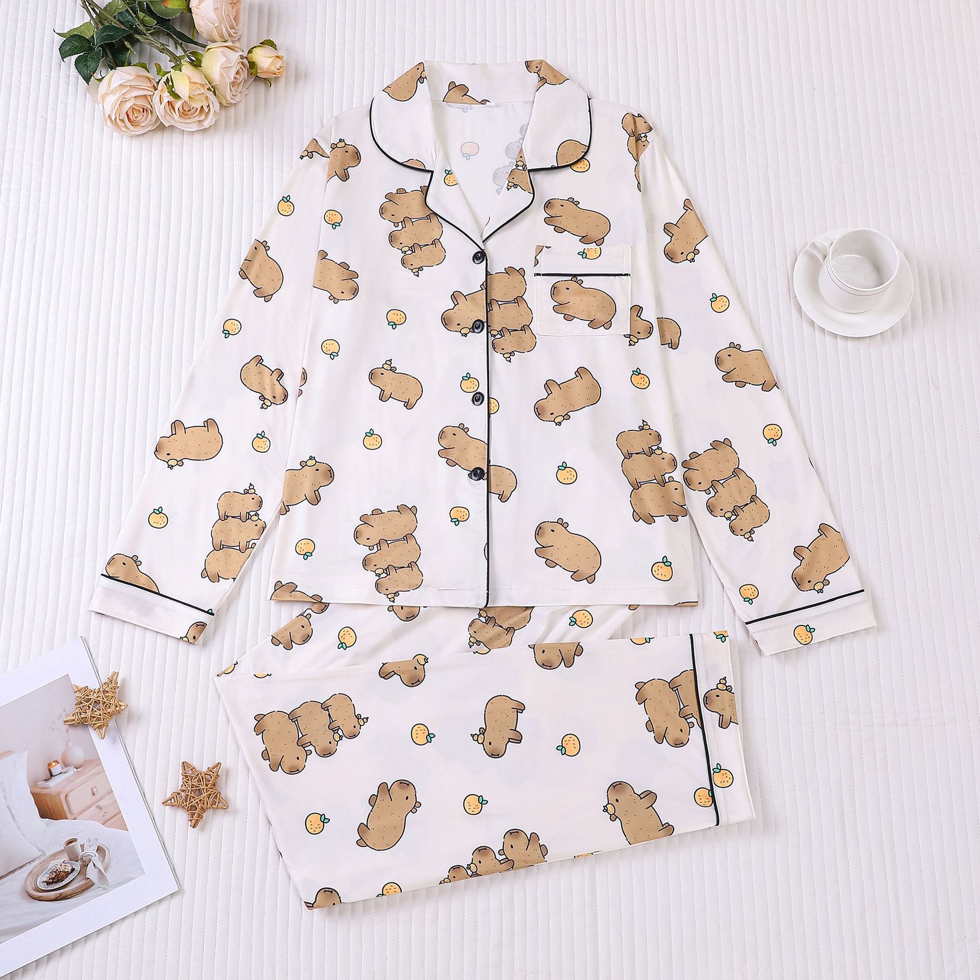 국경 간 대외 무역 인기 여성 잠옷 사계절 프린트 라펠 긴팔 바지 유럽과 미국의 편안한 홈웨어 세트스토어 가기