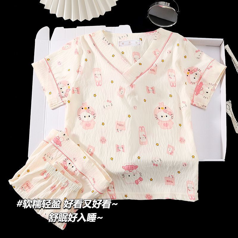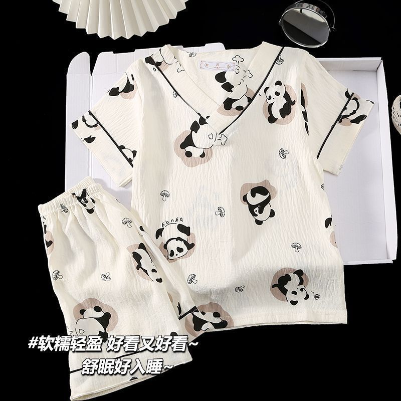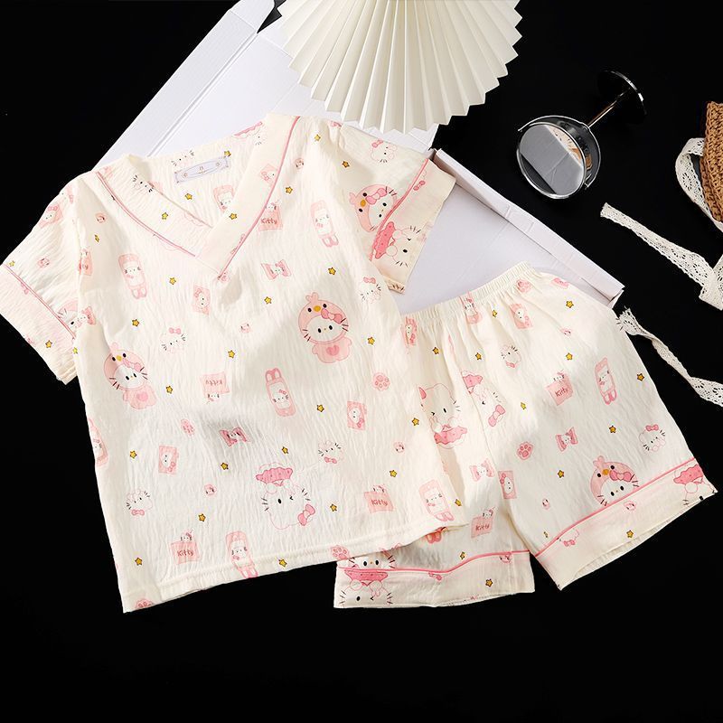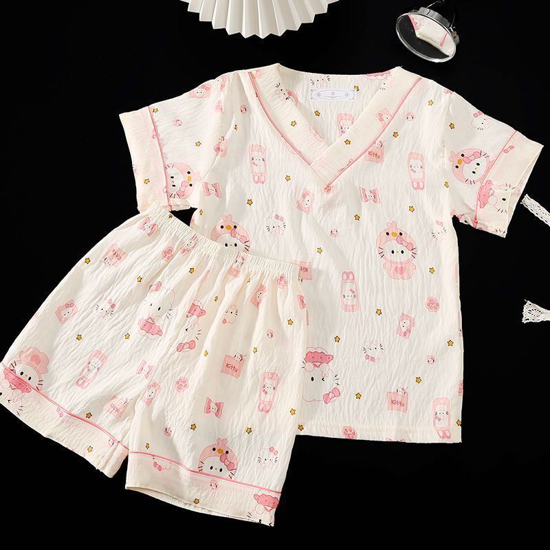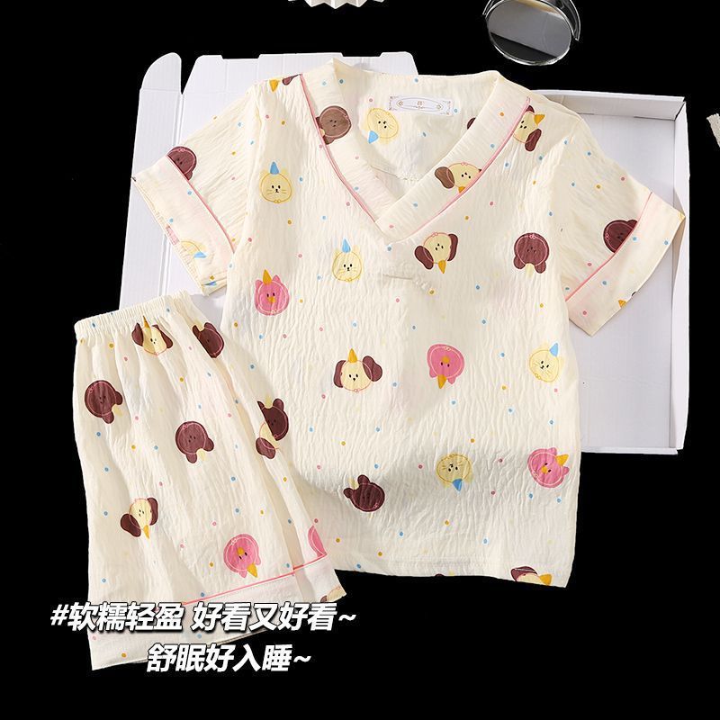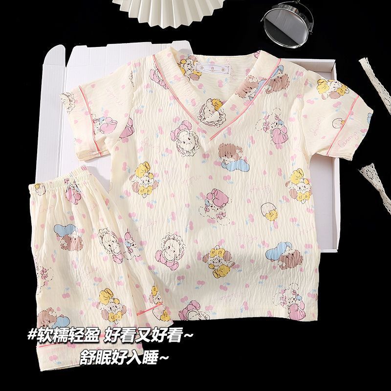 Yunduo 면화 잠옷 소녀 2025 여름 얇은 반팔 v 넥 양복 느슨한 달콤한 귀여운 캐주얼 홈웨어스토어 가기