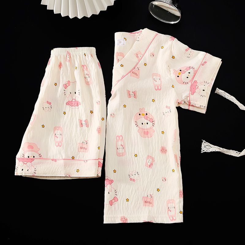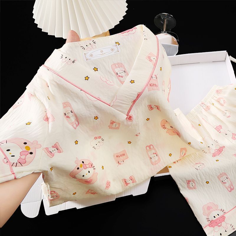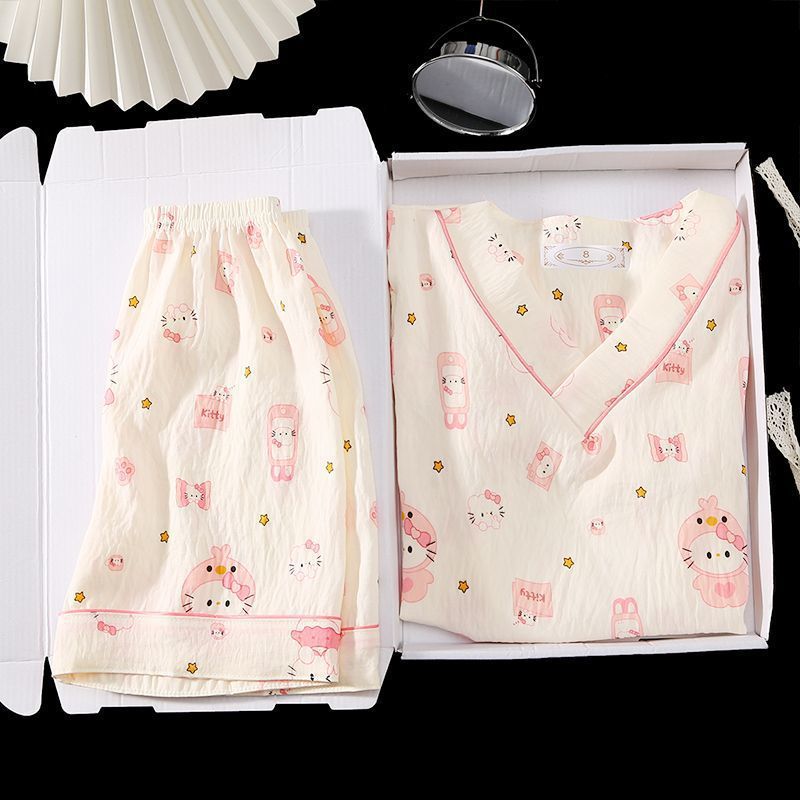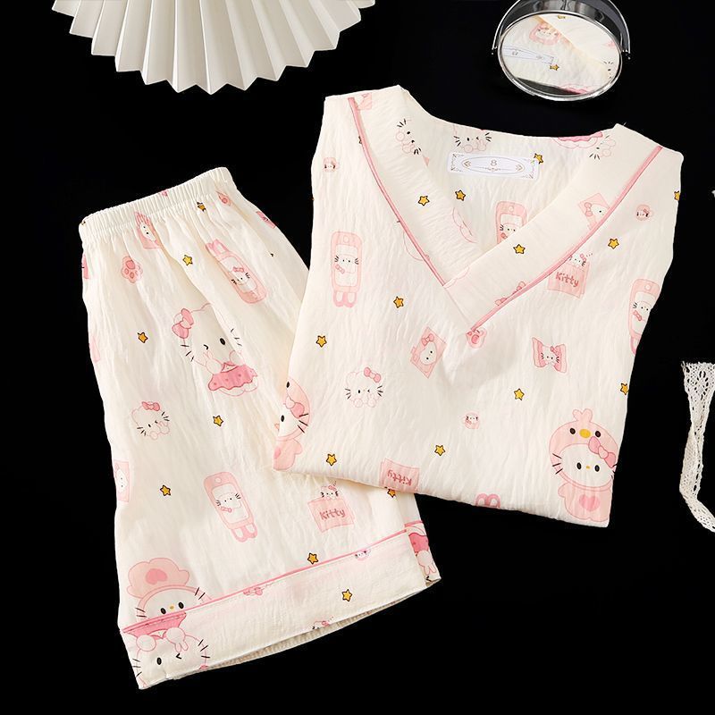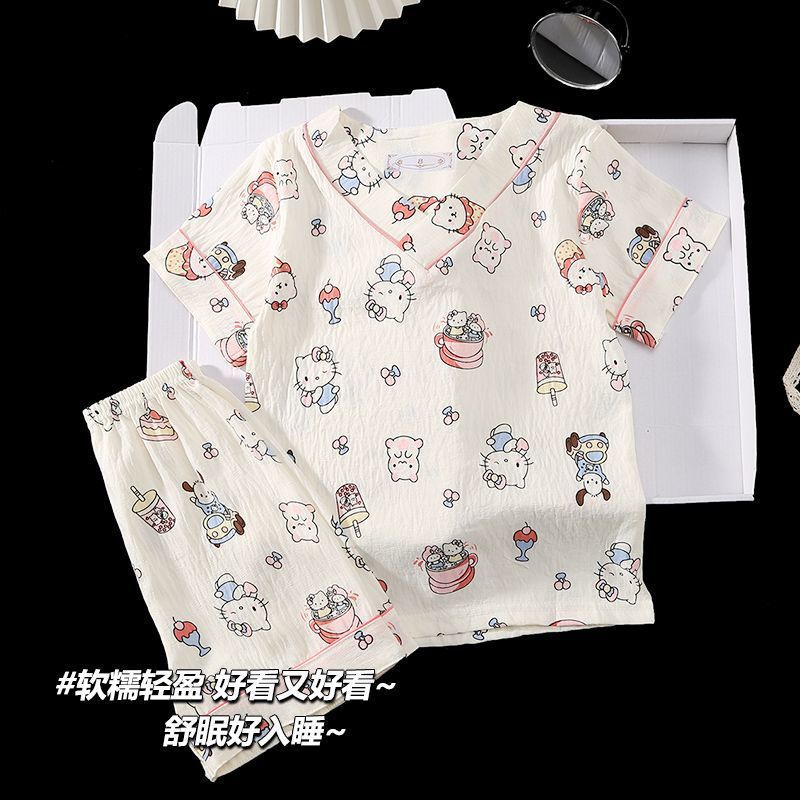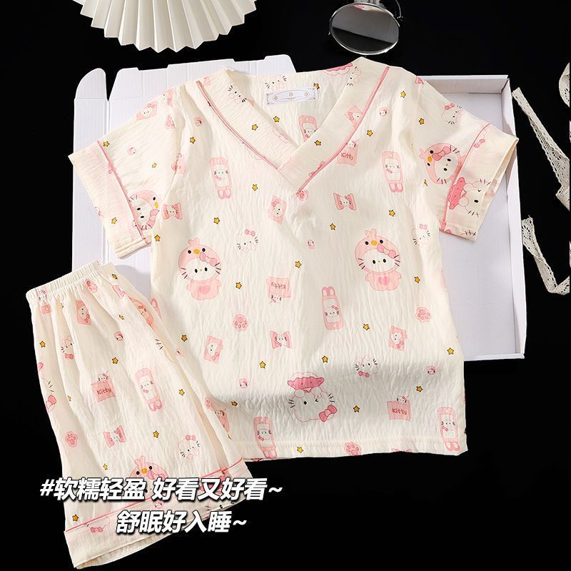 Yunduo 면화 잠옷 소녀 2025 여름 얇은 반팔 v 넥 양복 느슨한 달콤한 귀여운 캐주얼 홈웨어스토어 가기