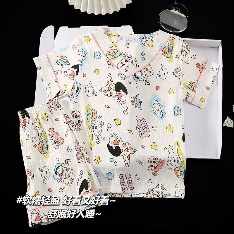 Yunduo 면화 잠옷 소녀 2025 여름 얇은 반팔 v 넥 양복 느슨한 달콤한 귀여운 캐주얼 홈웨어