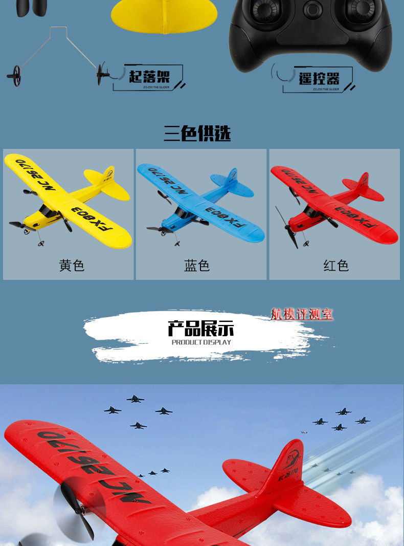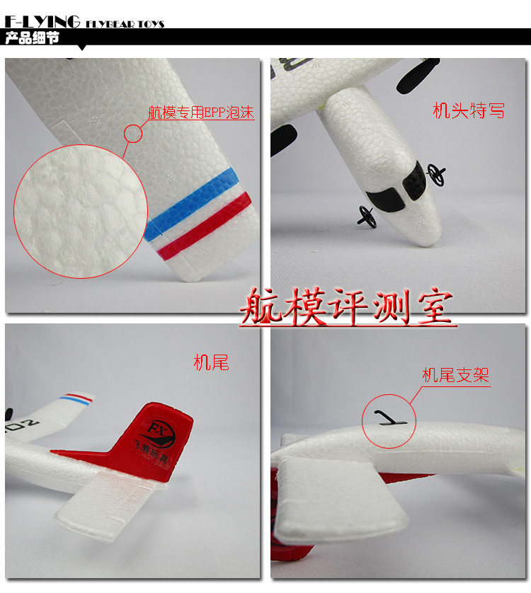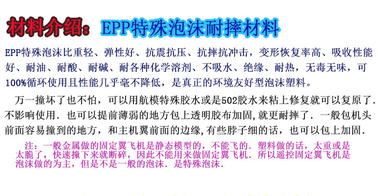 这款飞机机身由特殊记忆性材料(进口EPP塑料泡沫材料)一次性成型,(普通包装泡沫滴502胶水会溶化,EPP泡沫滴502胶水不会溶化,“这个也是区别一般泡沫和EPP泡沫的方法”这就是最新风靡航模界的EPP材料) 耐摔,不易变型,正常操作不易摔坏。就算坏了也容易护理,直接用502胶水就可以粘好的,超省心,省去了零件费.