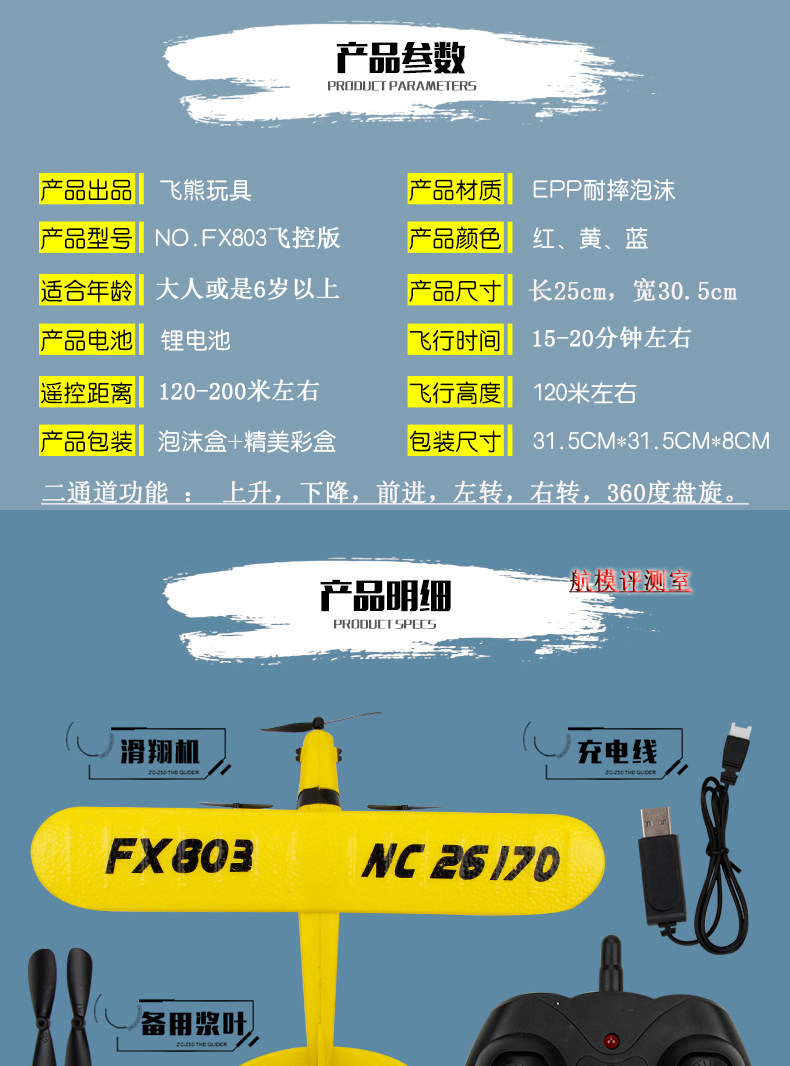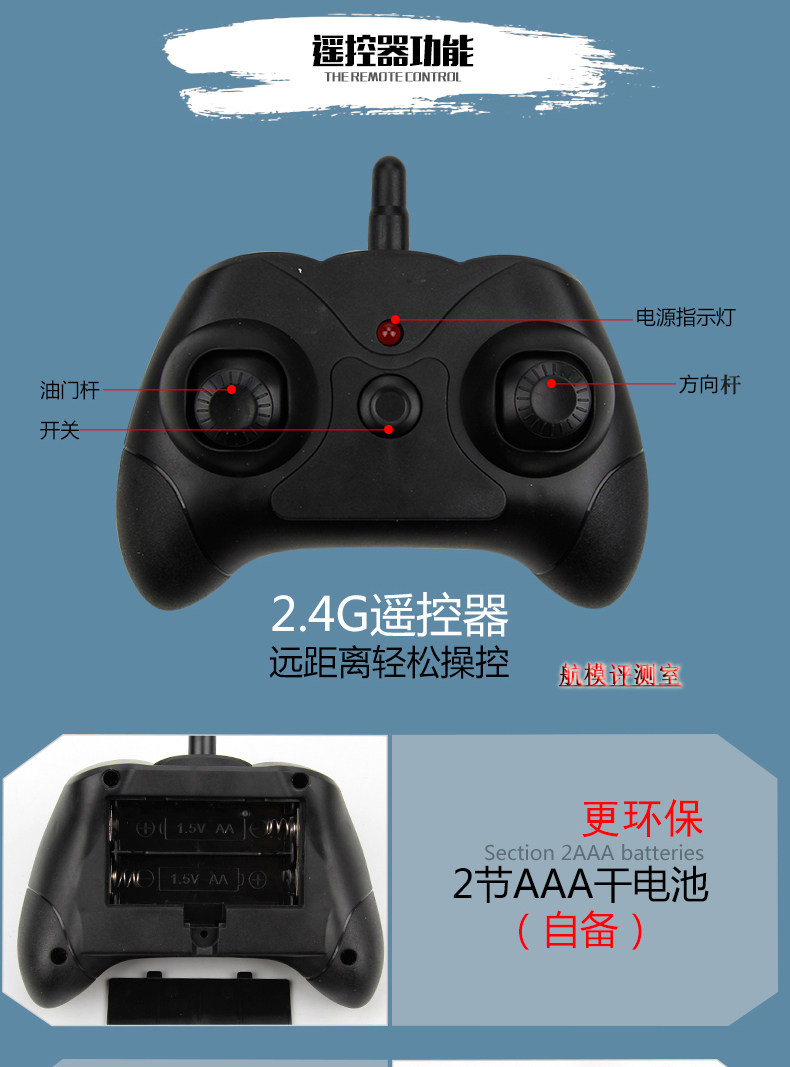 产品功能:双通,前进、上升、下降、左转、右转、360度盘旋