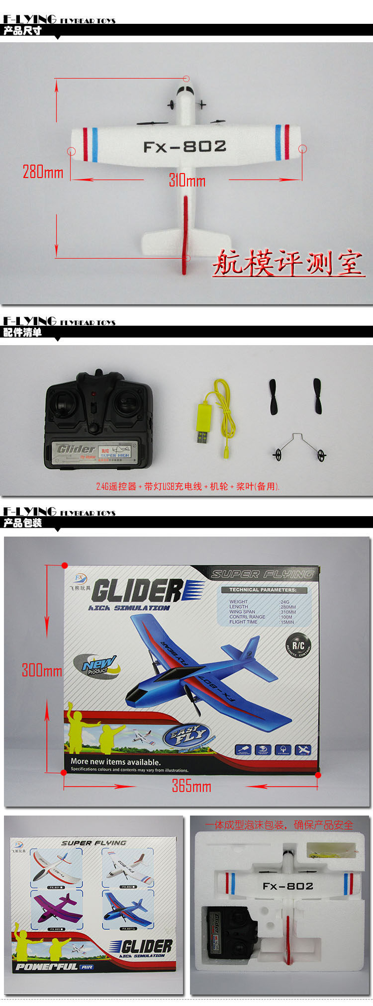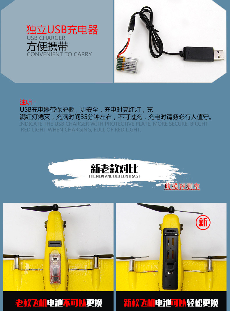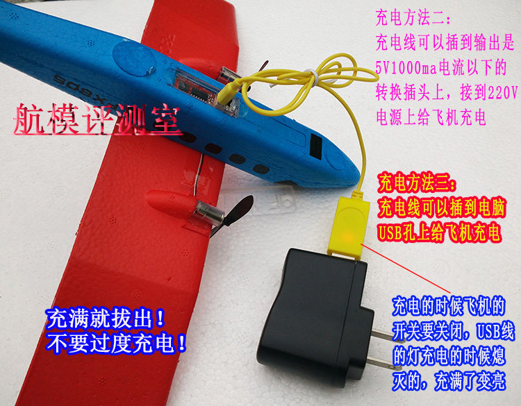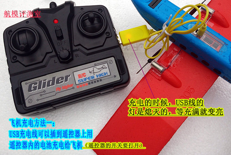 1.这款滑翔机是锂电池,飞机飞不起来就可以充电了;充好电后,就要拔出来(充满电后,不可再给飞机充电)。记住:航模电池过度充电过度放电都会有所损坏。