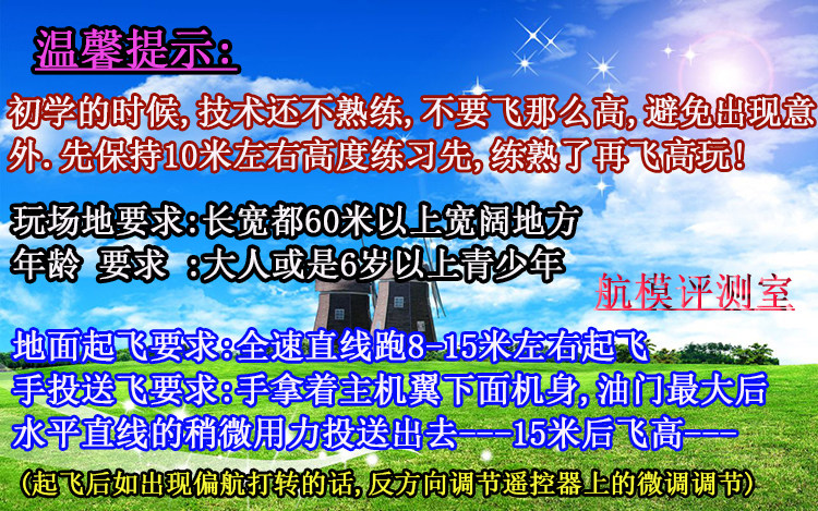 5.初学者建议到草地上练习,下降的时候,要慢慢滑翔下来,如果没有起落架的话,就降落到草地或是软地上。