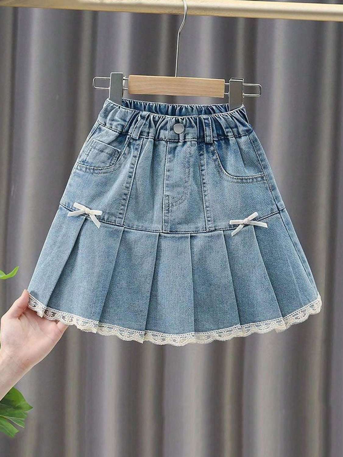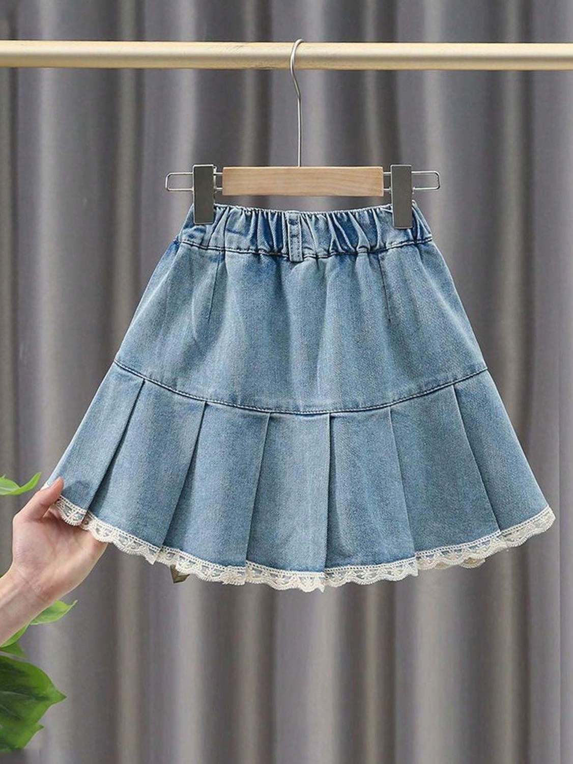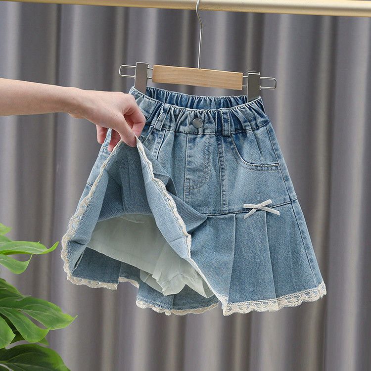 여아 데님 스커트 봄, 여름, 가을 새로운 스타일 중대형 어린이 인터넷 연예인 스타일 케이크 스커트 어린이 짧은 스커트 레이스 미드 스커트