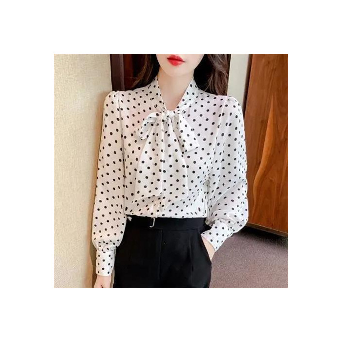 리본 셔츠 여성 봄 폴카 도트 탑 한국 스타일 쉬폰 보우 셔츠 긴팔 쉬폰 셔츠 플러스 사이즈 여성 의류스토어 가기