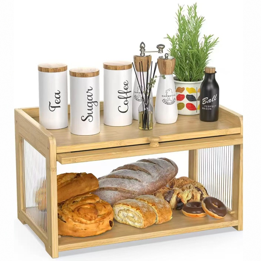 투명한 4면이 있는 대나무 빵 상자 식품 보관 캐비닛 나무 주방 베이킹 스낵 방진 밀봉 상자 보관 상자