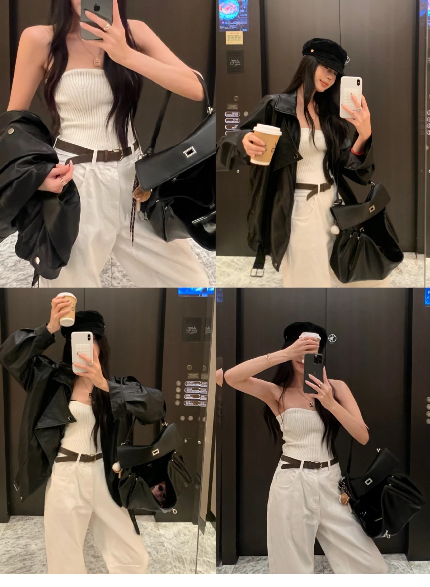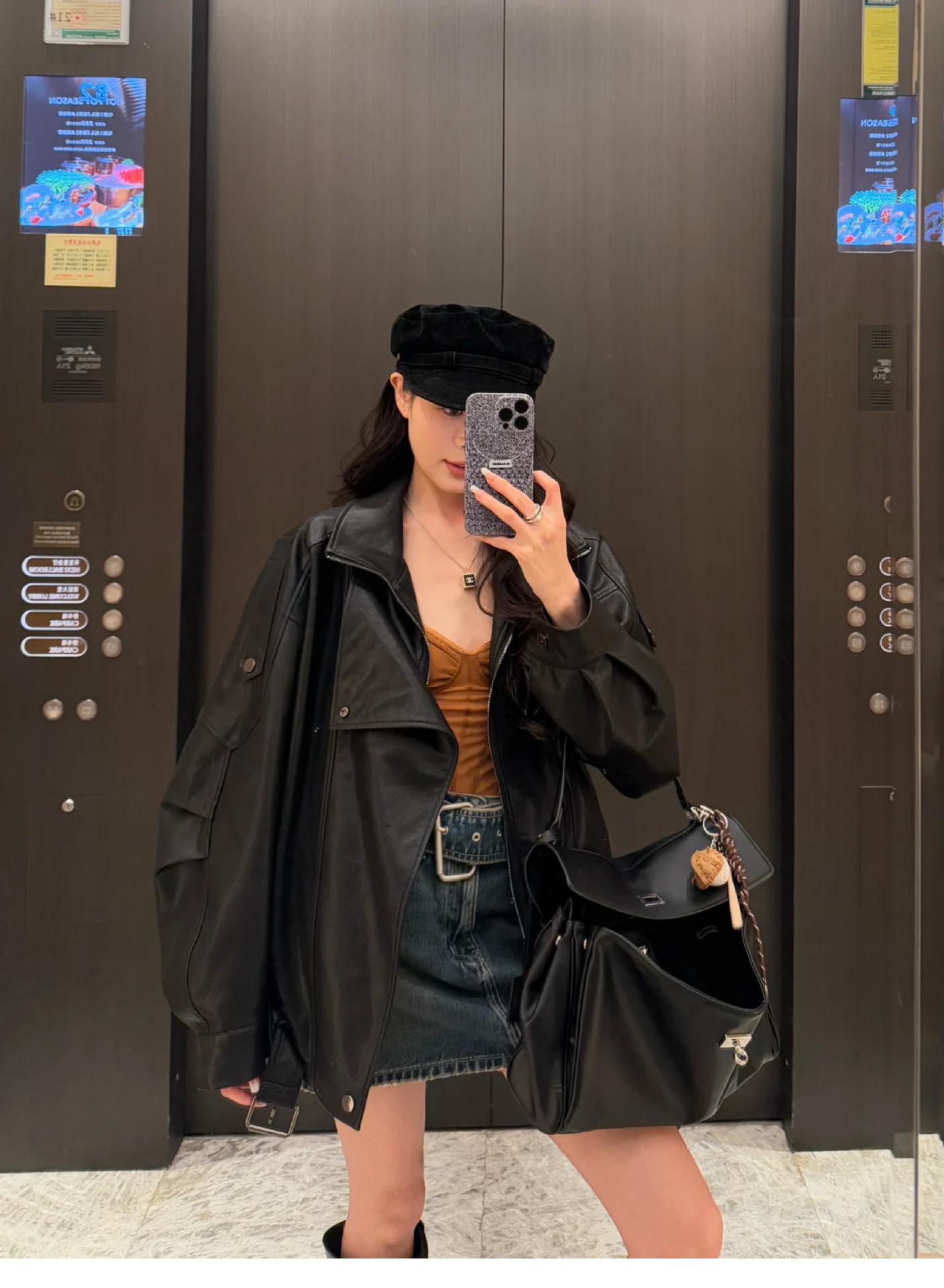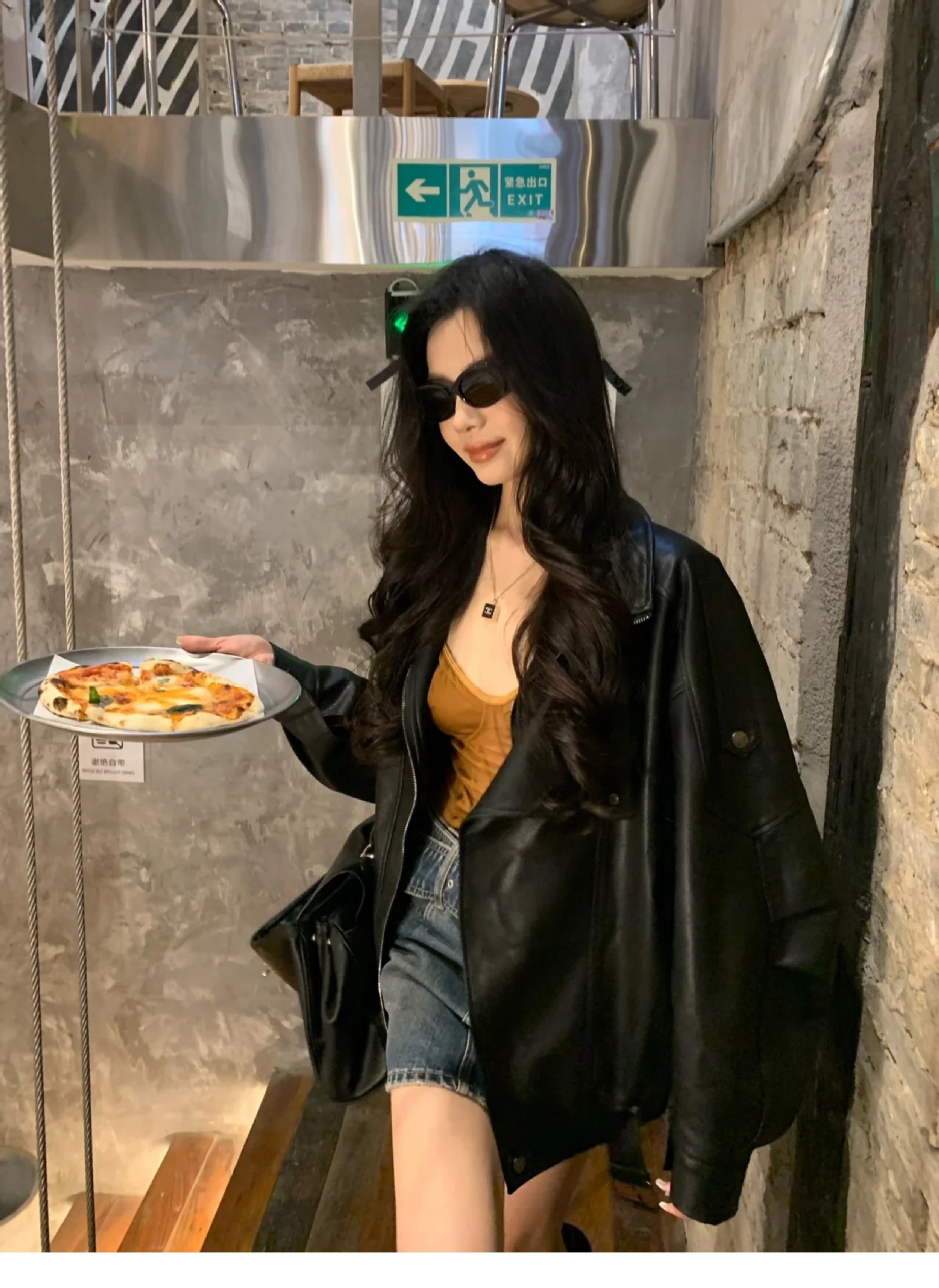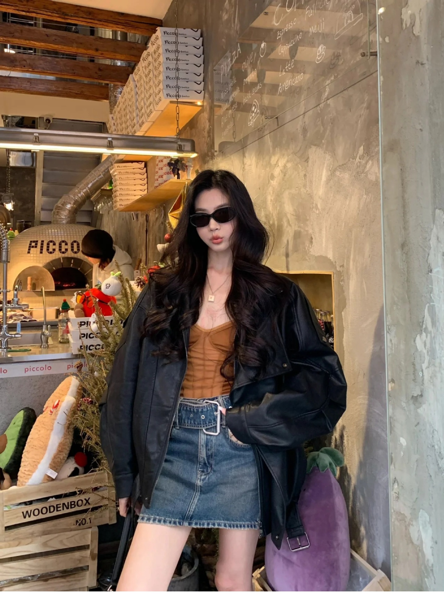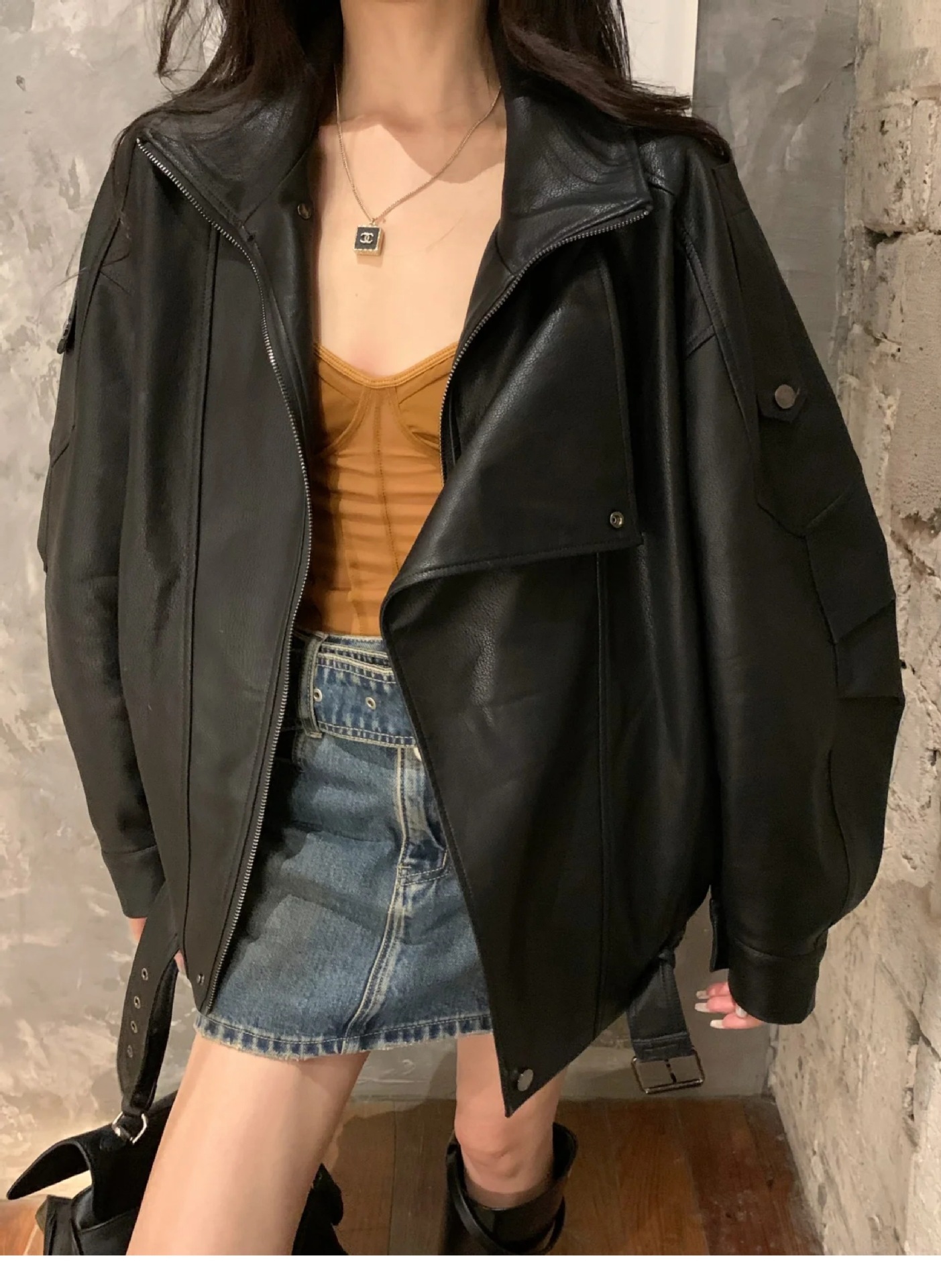 2025 새로운 스타일의 가죽 자켓 여성 봄, 가을 오토바이 자켓 복고풍 옷깃 벨트 하이 엔드 탑