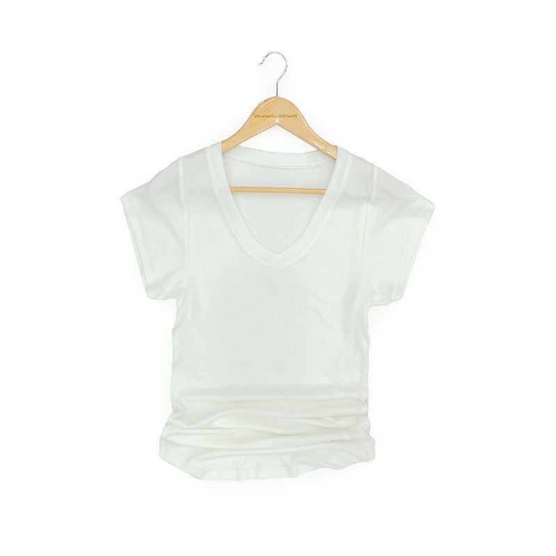 여름에 짧은 스커트를 입을 수 있는 스태킹 웨이스트 미드기장 브이넥 티셔츠, 슬림핏, 오른쪽 어깨, 시크한 작은 플라잉 슬리브 탑