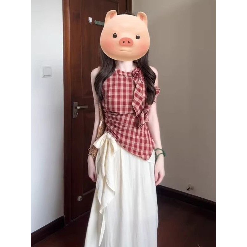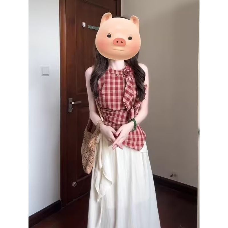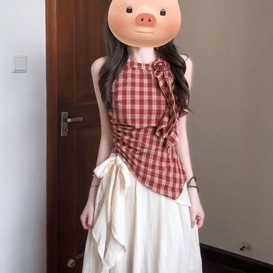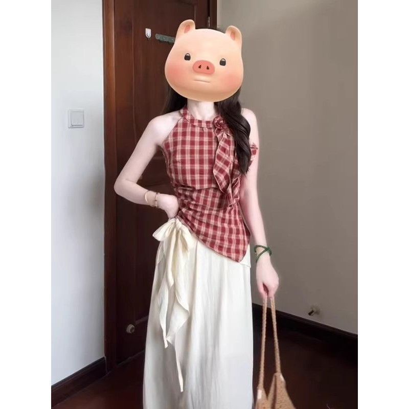 프렌치 레트로 체크 무늬 러플 홀터넥 탑 불규칙 탑 여성 여름 하이 웨이스트 스트랩 스커트 투피스 세트