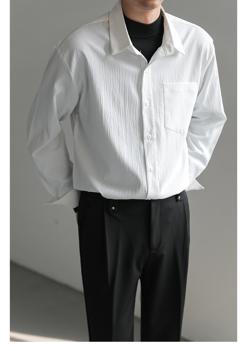 가볍고 성숙한 한국 스타일 트렌디하고 멋진 남성용 긴팔 셔츠, 루즈하고 캐주얼하며 주름진 드레이프, 무철 셔츠, 봄 상의스토어 가기
