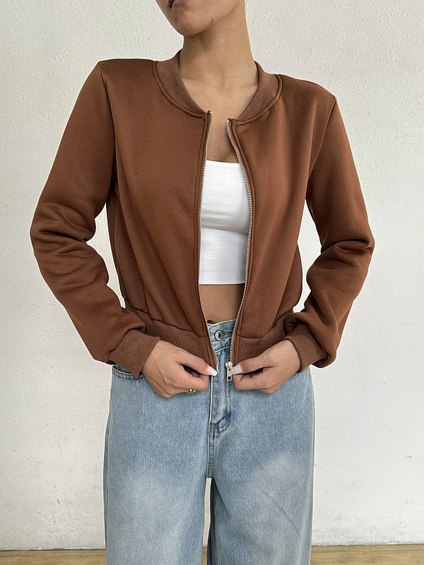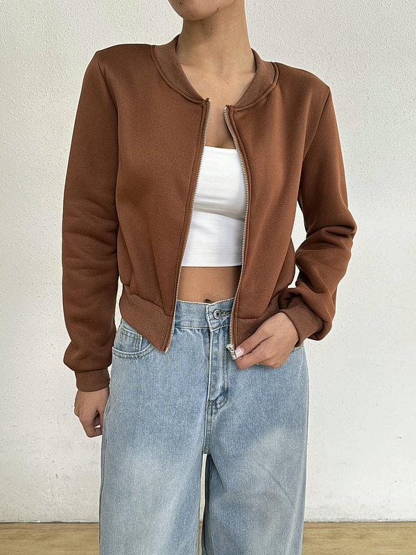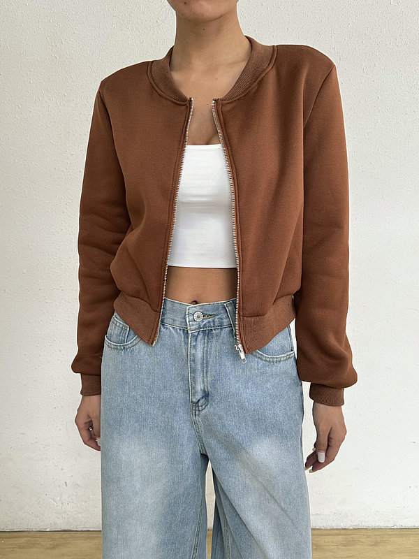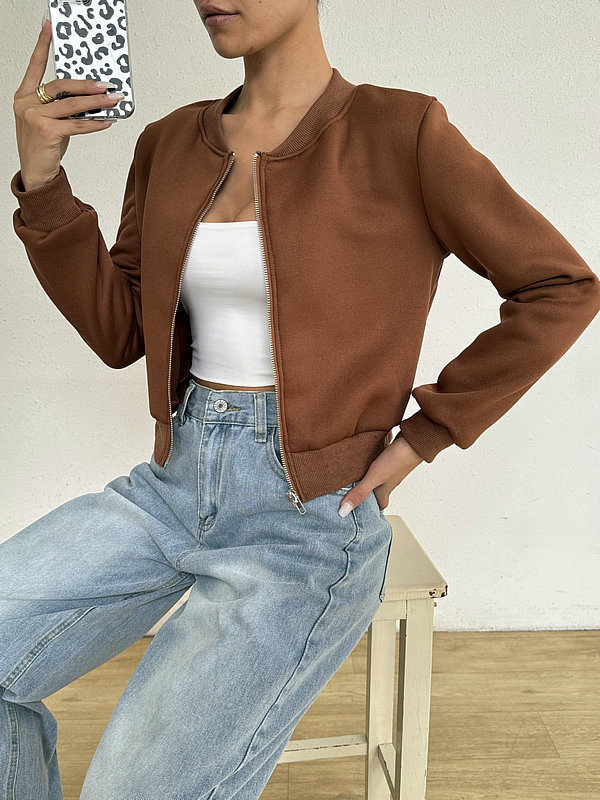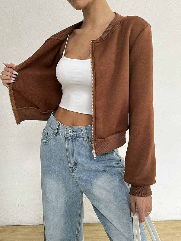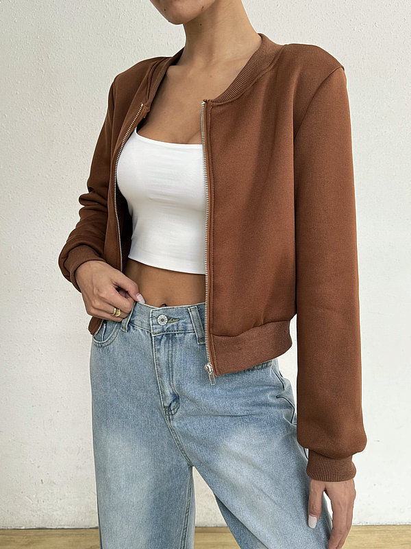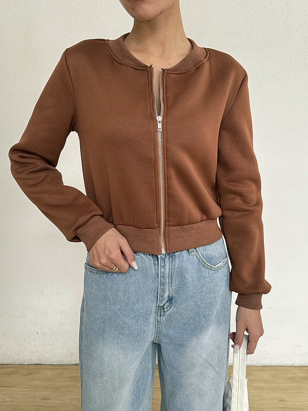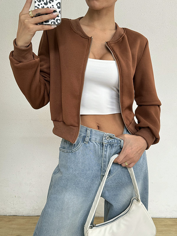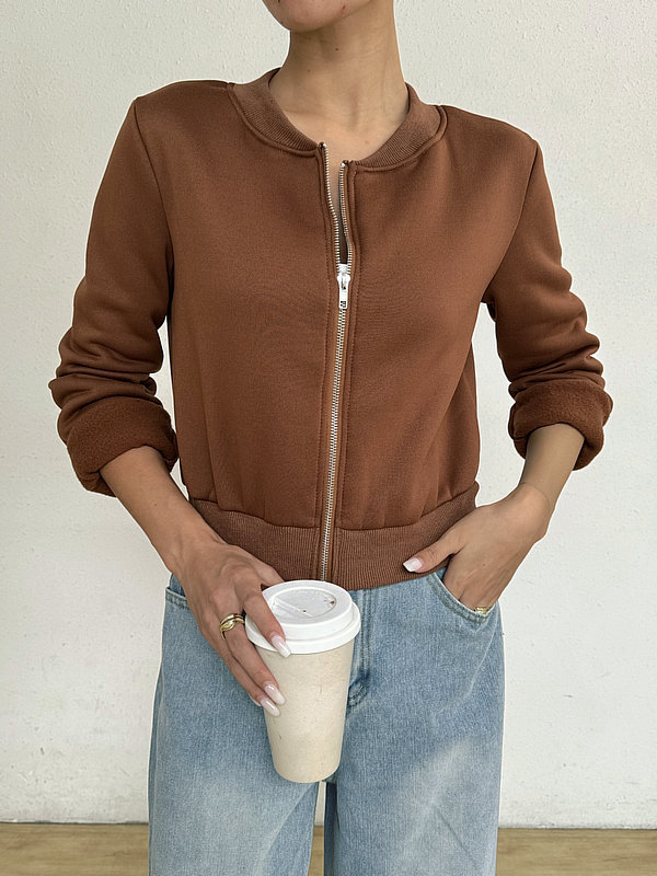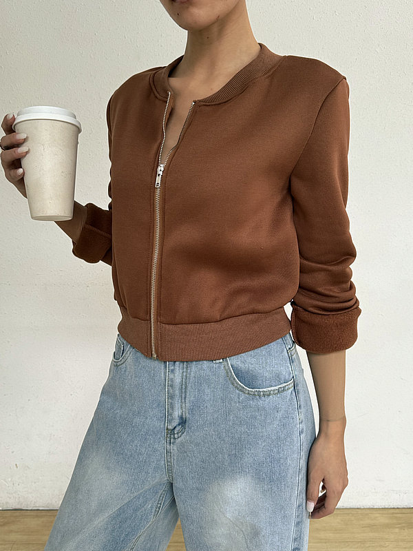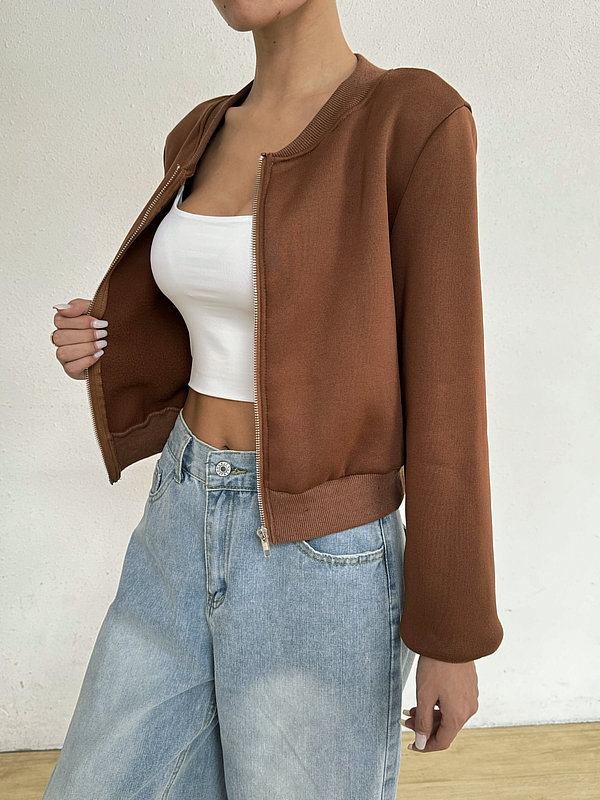 2025 봄 신작 여성 탑 긴팔 라운드 넥 지퍼 솔리드 컬러 카디건 루즈 슬림 짧은 캐주얼 자켓