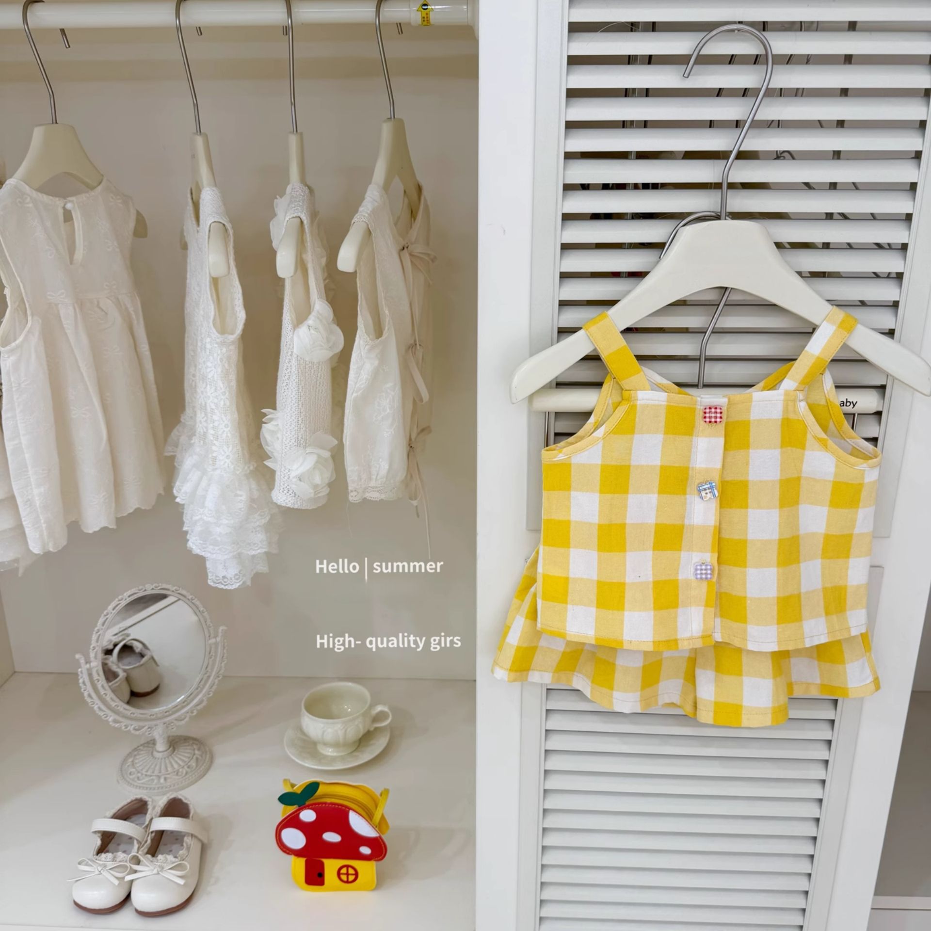 여름 귀여운 소녀 정장 오리지널 오뜨 꾸뛰르 아기 소녀 여름 노란색 격자 무늬 캐미솔 반바지 투피스 세트
