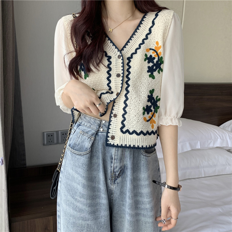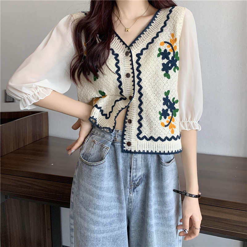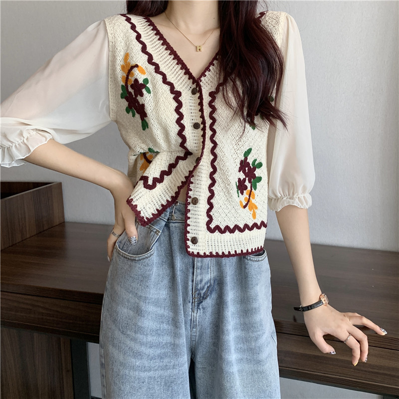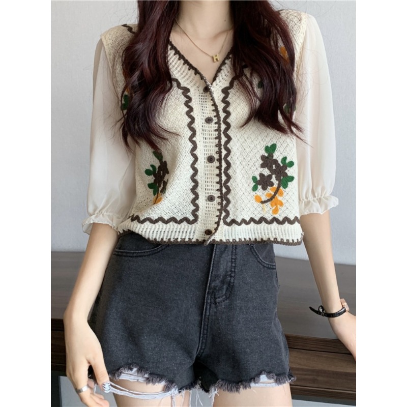 V 넥 크로 셰 뜨개질 자수 중공 스웨터 탑 여성용 짧은 쉬폰 셔츠 퍼프 슬리브 스플 라이스 에스닉 스타일 태국 티셔츠