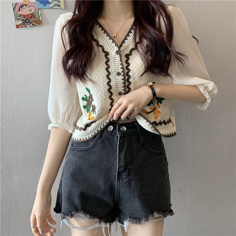 V 넥 크로 셰 뜨개질 자수 중공 스웨터 탑 여성용 짧은 쉬폰 셔츠 퍼프 슬리브 스플 라이스 에스닉 스타일 태국 티셔츠스토어 가기